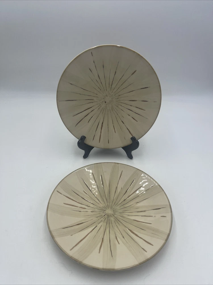 Add a touch of contemporary style to your dining table with this set of two Pier 1 Imports Sanctuary Starburst Salad Plates. The round plates measure 8.5 inches in diameter and feature a beautiful starburst pattern in tan color, perfect for all occasions. Made of high-quality stoneware material with a glossy finish, these plates are an original production style of art pottery and were manufactured using pottery techniques in the 2010-2019 time period. The set includes both the plate set and salad plate, and the backstamp is printed.