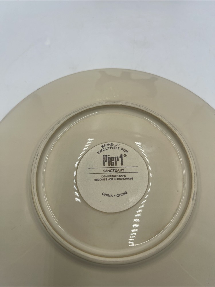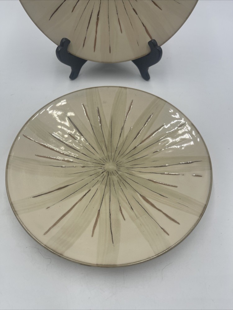 Add a touch of contemporary style to your dining table with this set of two Pier 1 Imports Sanctuary Starburst Salad Plates. The round plates measure 8.5 inches in diameter and feature a beautiful starburst pattern in tan color, perfect for all occasions. Made of high-quality stoneware material with a glossy finish, these plates are an original production style of art pottery and were manufactured using pottery techniques in the 2010-2019 time period. The set includes both the plate set and salad plate, and the backstamp is printed.