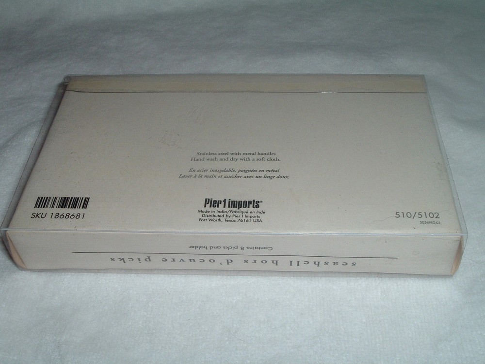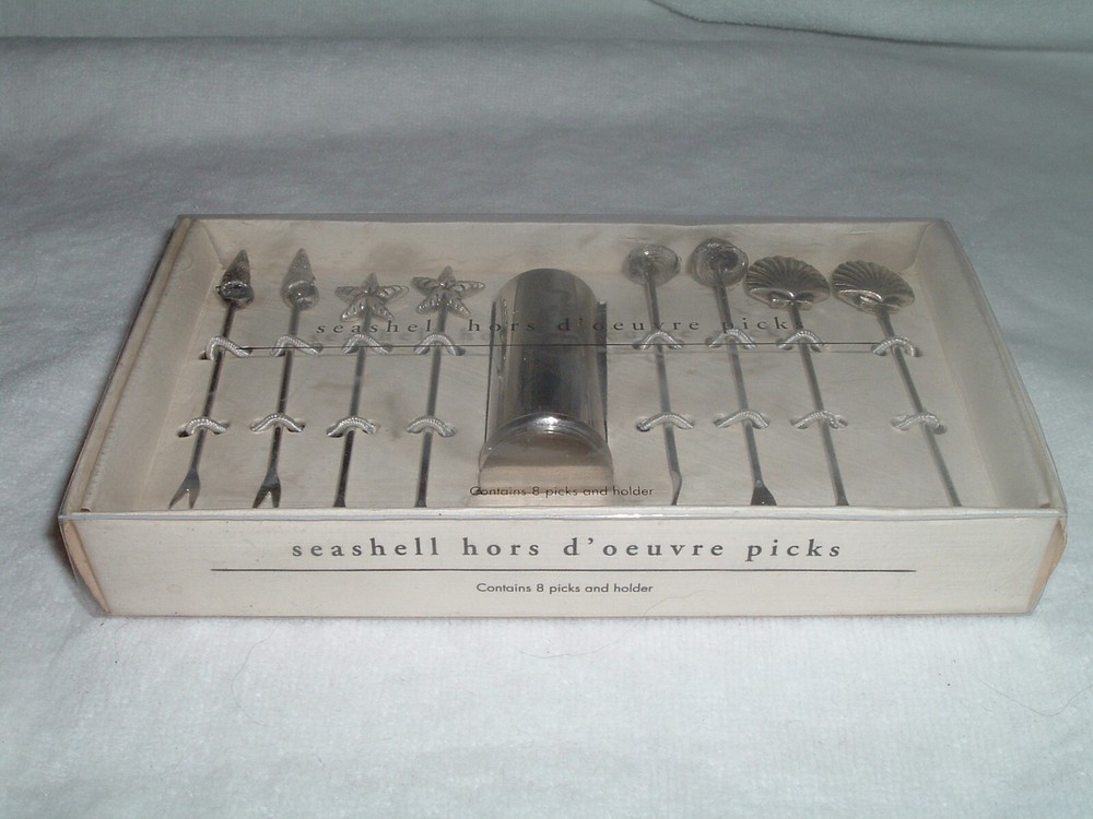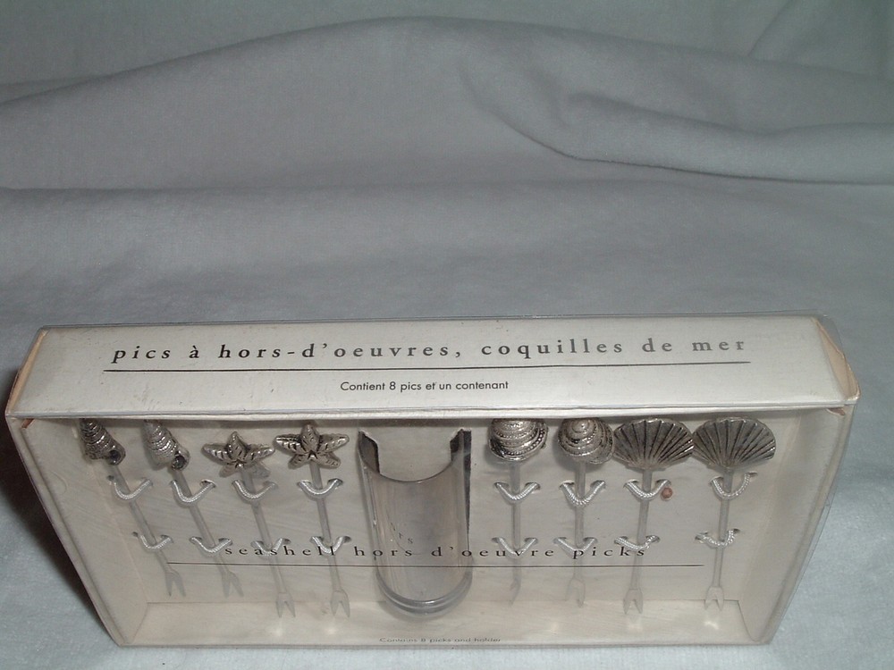 Elevate your cocktail game with this Pier 1 Imports Seashell Cocktail Picks Set of 8 & Holder. Crafted from durable stainless steel, these picks are perfect for all occasions and add a touch of elegance to any drink. The intricate seashell design is sure to impress your guests. This set includes 8 cocktail forks/picks and a matching holder. Hand wash and dry with a cloth for best results. Made in India, these picks are a must-have for any home bar or entertaining setup. Add a touch of coastal charm to your next gathering with this stylish and functional set. Nice as a hostess gift or for your own entertaining. Brand New in Original Gift Box. Buyer pays $7.00 for Priority Mail, packaged carefully to arrive safely. Usually ships within 24 hours. International buyer welcome!