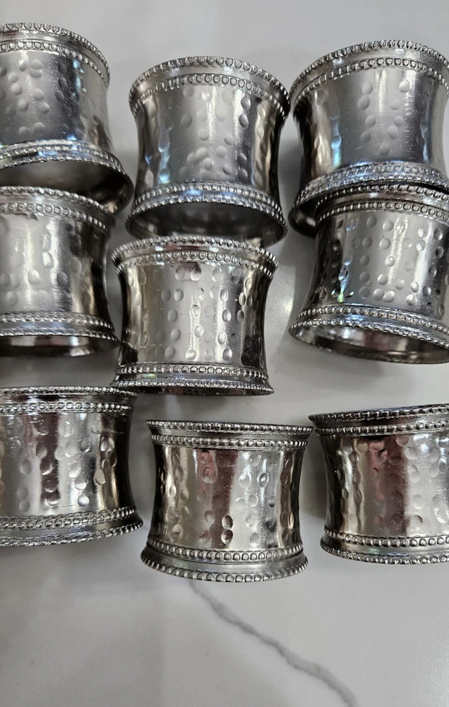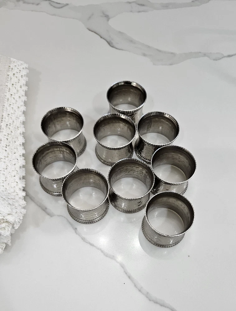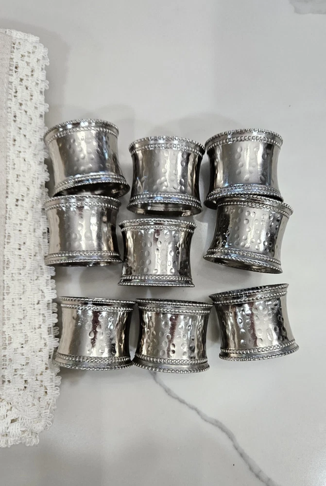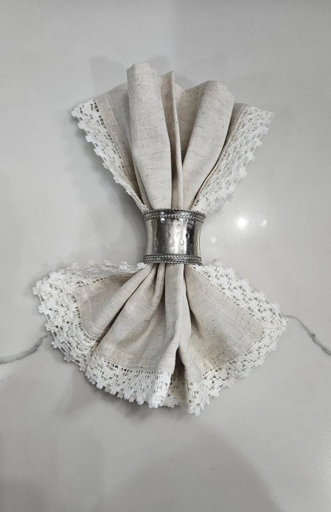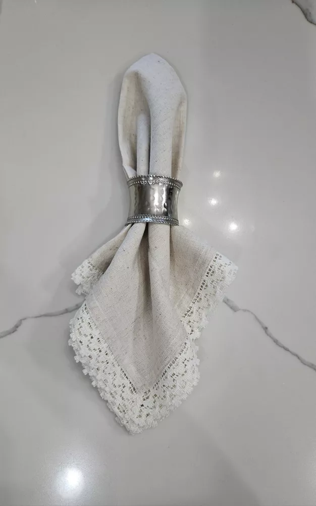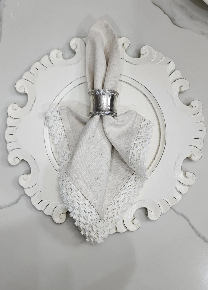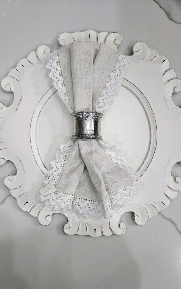 New, never used. Pier 1 Imports Cloth Napkins Set Of 11 Crochet Lace Trim Off White, Cream, Ivory, Beige 85% Cotton, 15% Linen Set Of 9 Silver Hammered Rings Discontinued Perfect for Easter Dinner plates and charger plates are not included.