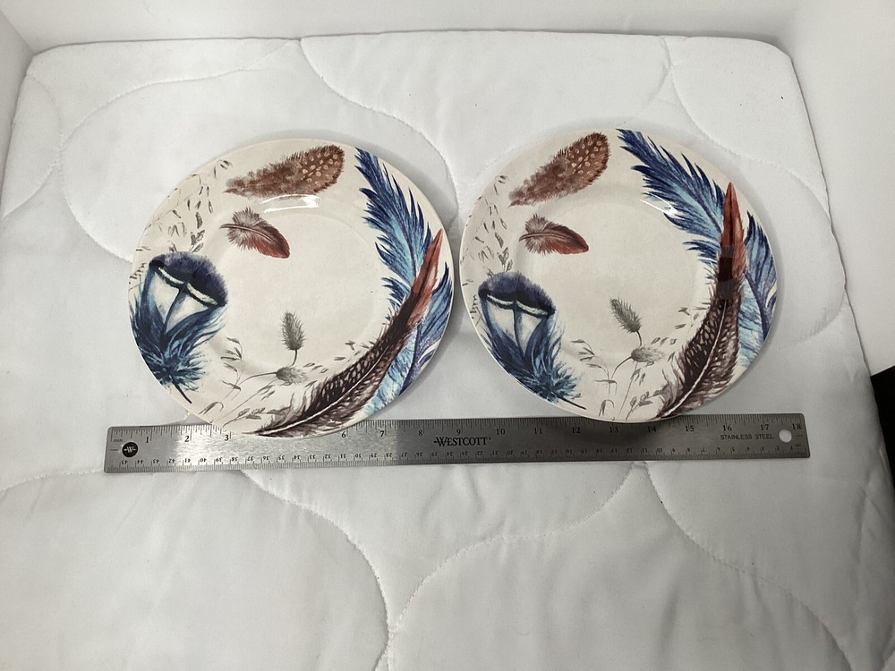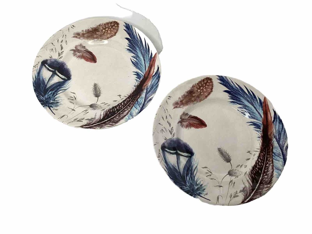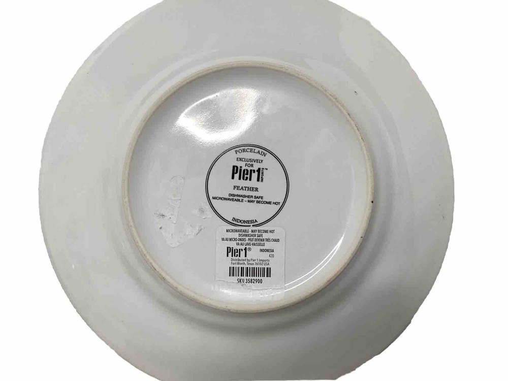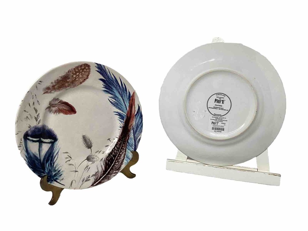 Elevate your dining experience with this set of two stunning Pier 1 Imports porcelain plates. The round plates measure 8.5 inches and feature a beautiful feather pattern in a range of vibrant colors that make them perfect for all occasions. Crafted in Indonesia, these plates are both microwave and dishwasher safe, making them highly functional in addition to being decorative. Perfect for contemporary homes, these plates are an original design from the Feather product line and will add a touch of elegance to any meal.