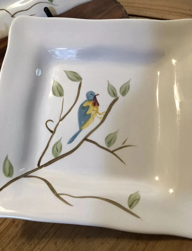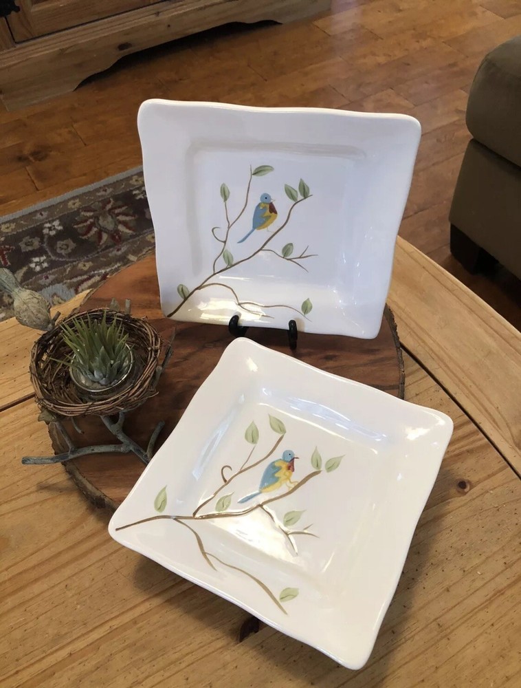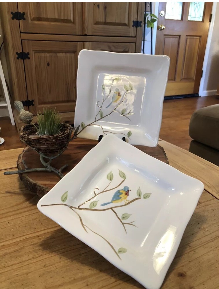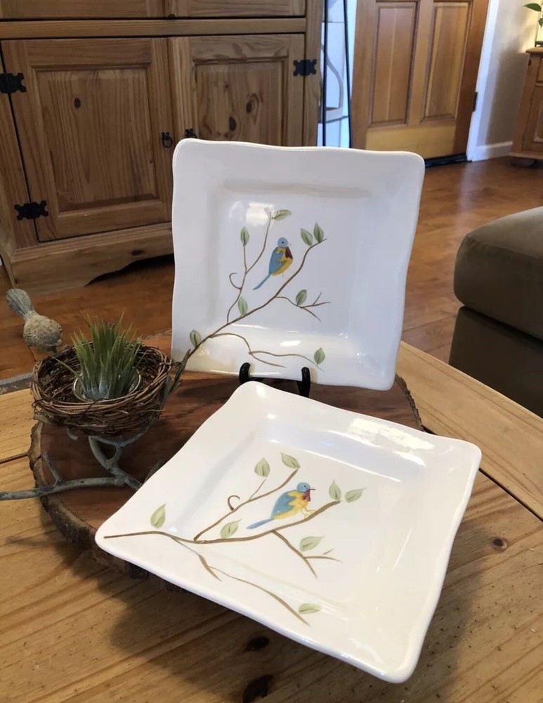 Enhance your dining experience with these Pier 1 Imports Set of 2 Spring Robin Handpainted Square Salad Plates. Each plate features a vibrant Spring Robin pattern with an array of colors including white, blue, green, yellow, red, and ivory, creating a charming and inviting aesthetic for any table setting. Crafted from high-quality ceramic, these 8-inch salad/dessert plates boast scalloped edges and a glossy finish, adding a touch of elegance to your culinary presentations. Whether for everyday use or special occasions, these plates are versatile and stylish, seamlessly blending with a variety of decor themes and dinnerware ensembles. No chips or cracks in either plate. Could be used to serve cookies, crackers & cheese or as a dessert or salad plate. Any questions please ask.