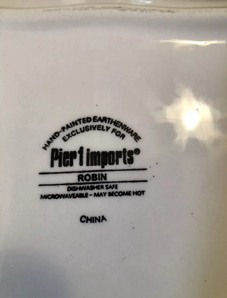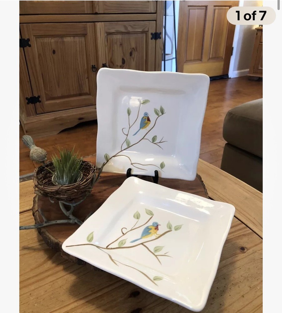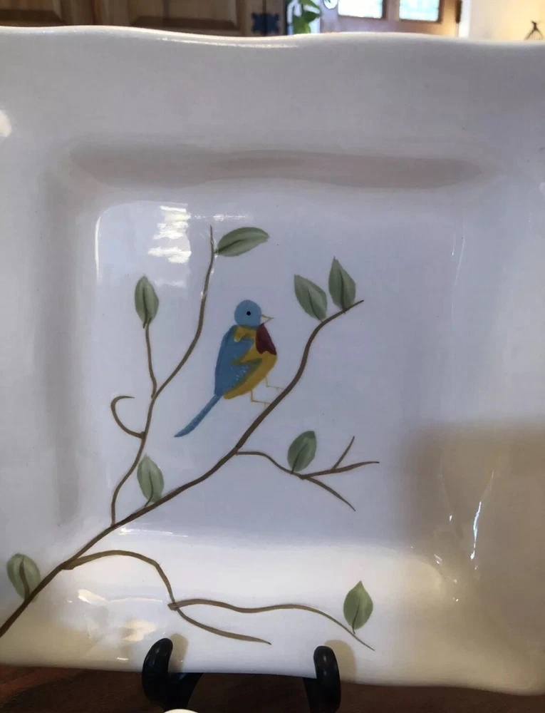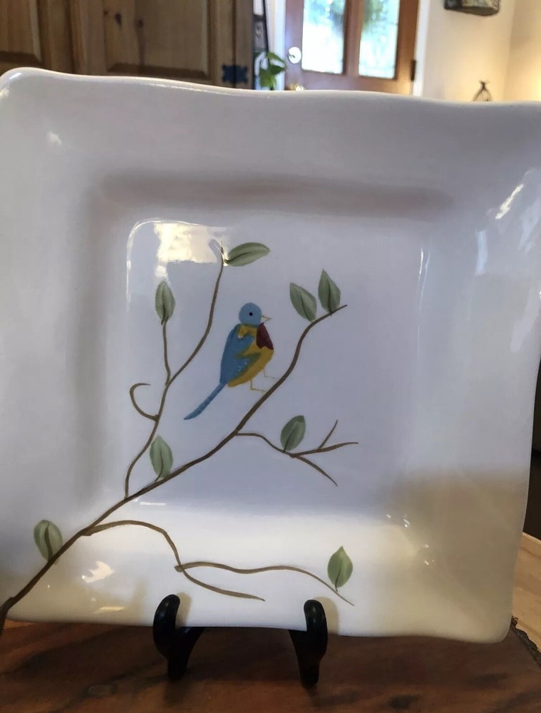 Enhance your dining experience with these Pier 1 Imports Set of 2 Spring Robin Handpainted Square Salad Plates. Each plate features a vibrant Spring Robin pattern with an array of colors including white, blue, green, yellow, red, and ivory, creating a charming and inviting aesthetic for any table setting. Crafted from high-quality ceramic, these 8-inch salad/dessert plates boast scalloped edges and a glossy finish, adding a touch of elegance to your culinary presentations. Whether for everyday use or special occasions, these plates are versatile and stylish, seamlessly blending with a variety of decor themes and dinnerware ensembles. No chips or cracks in either plate. Could be used to serve cookies, crackers & cheese or as a dessert or salad plate. Any questions please ask.