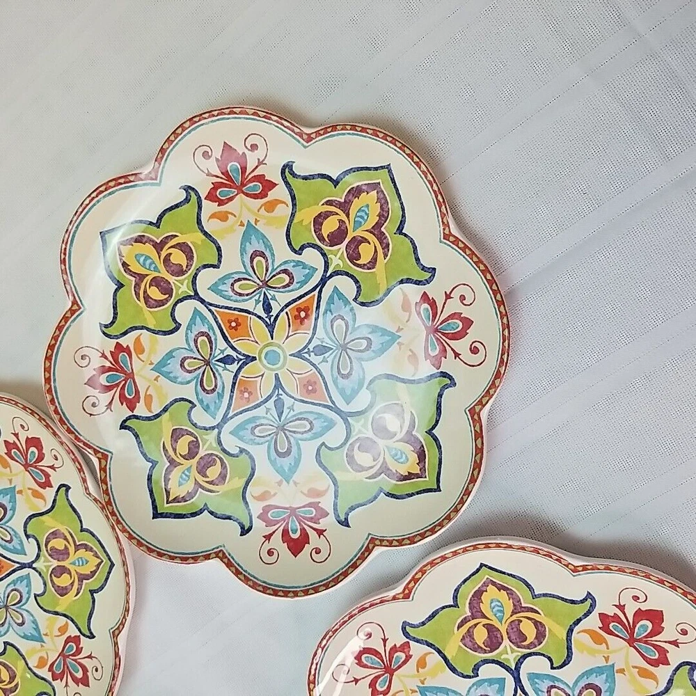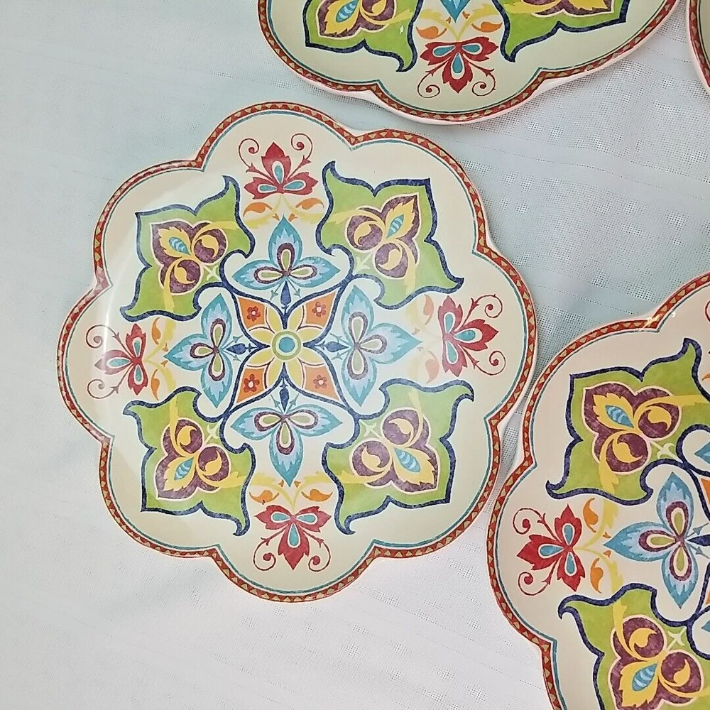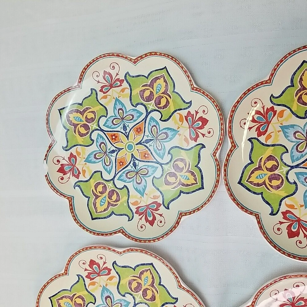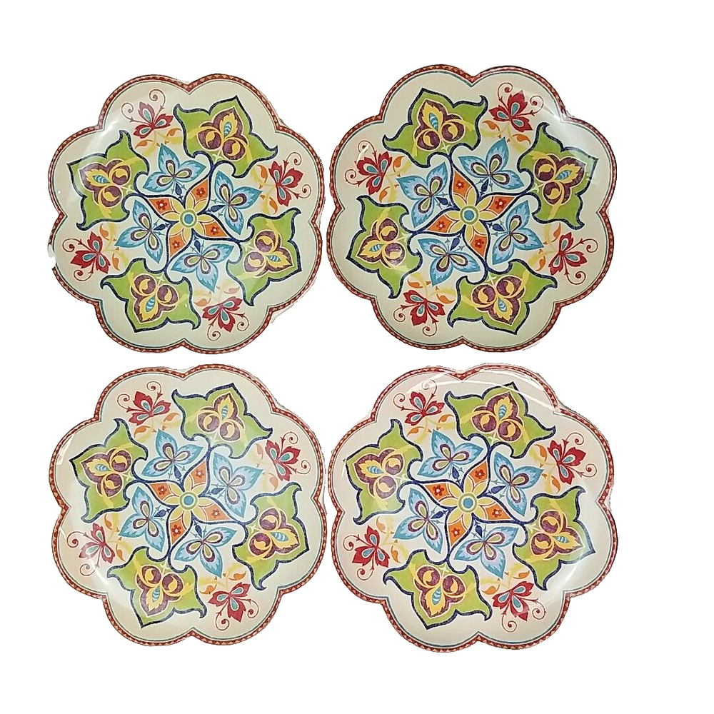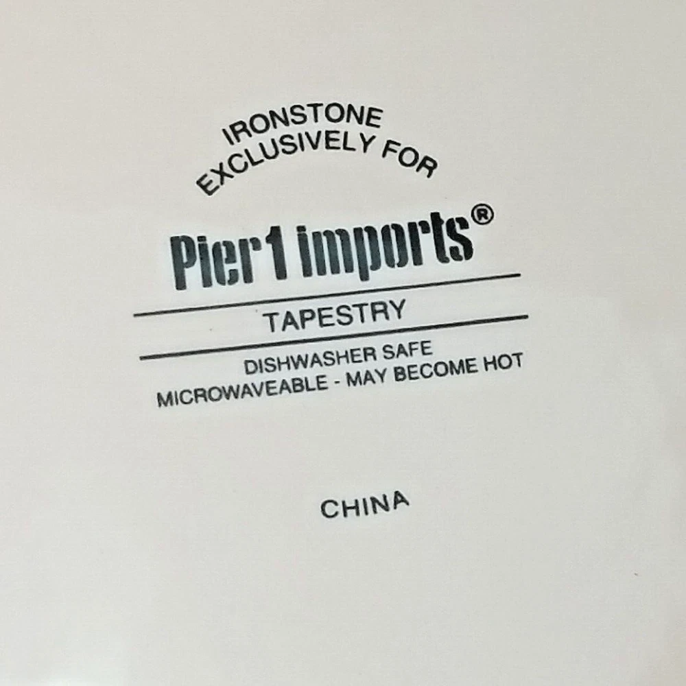 This product is a set of 4 salad plates from Pier 1 Imports. The plates are made of ironstone and have a round shape with scalloped edges with a multicolor tapestry pattern. They are microwave and dishwasher safe, and are decorated with a printed backstamp. The plates are part of the Tapestry product line and were produced in China using pottery techniques. One of the plates has a chip.