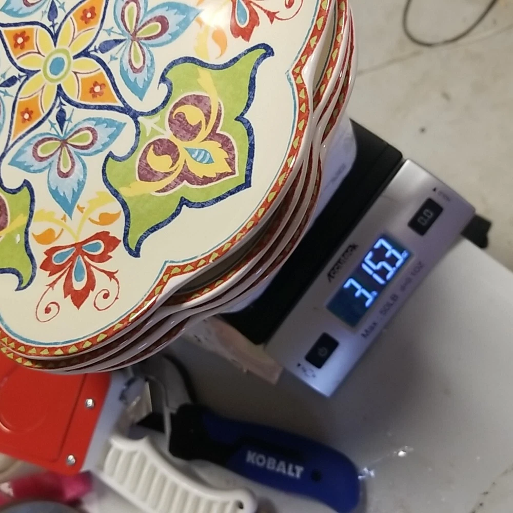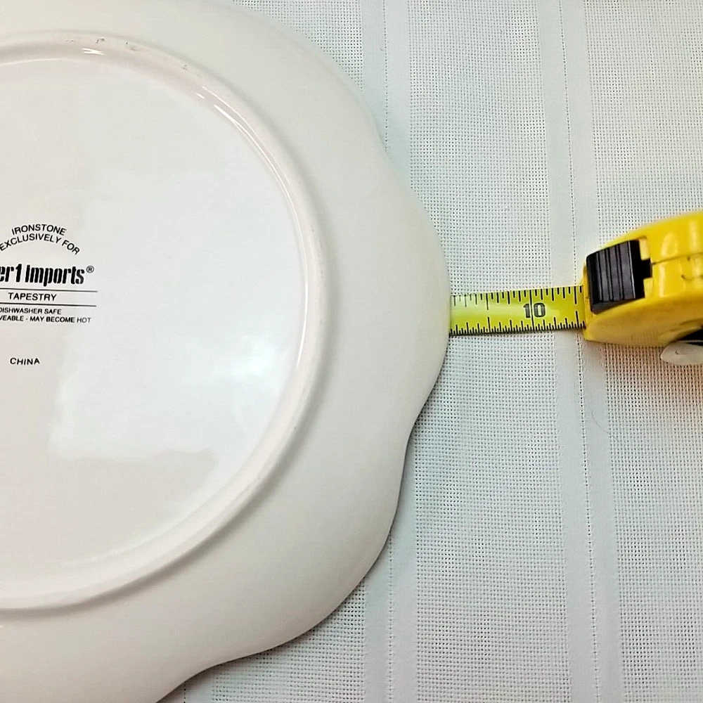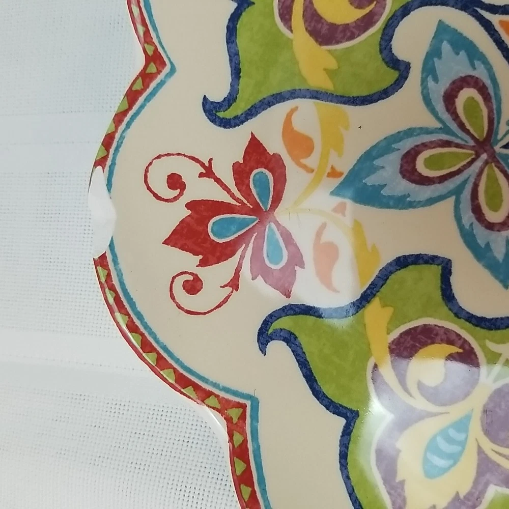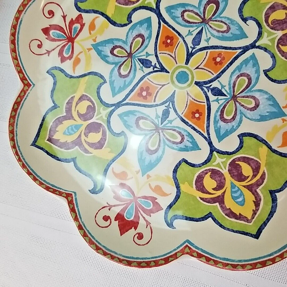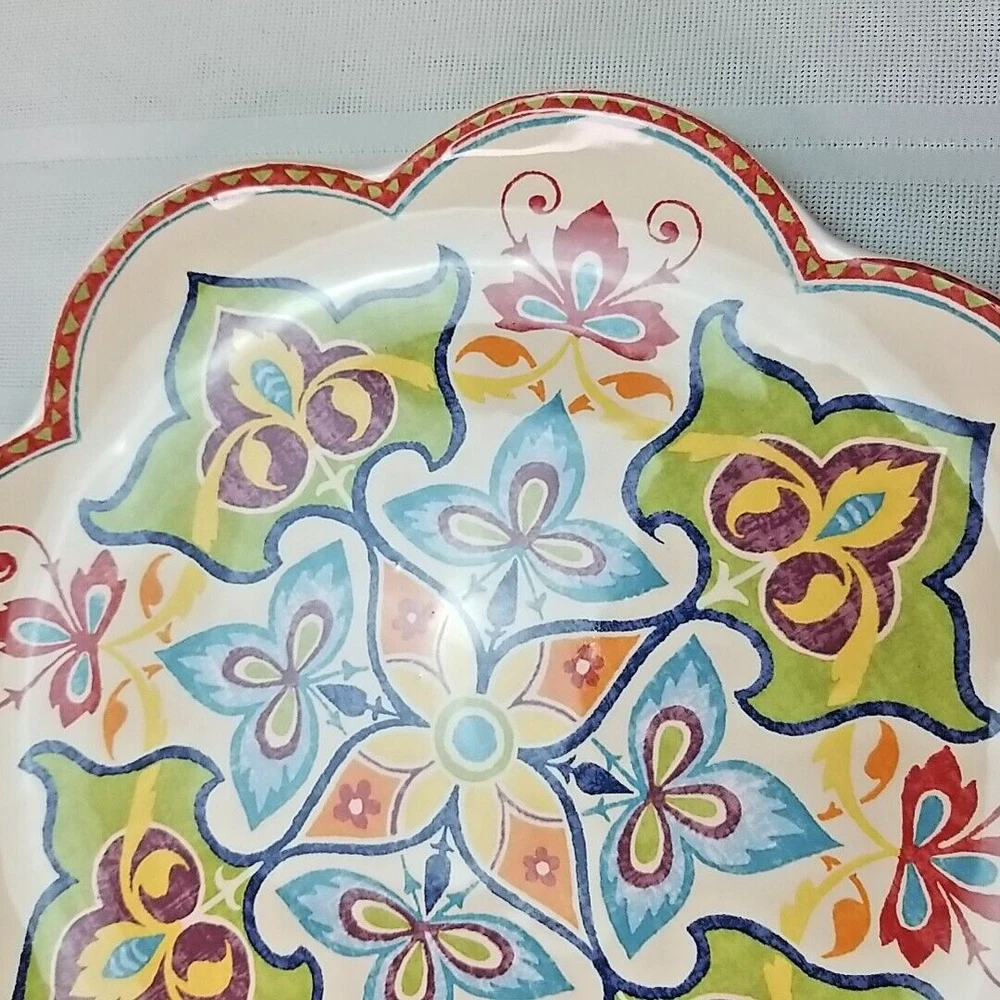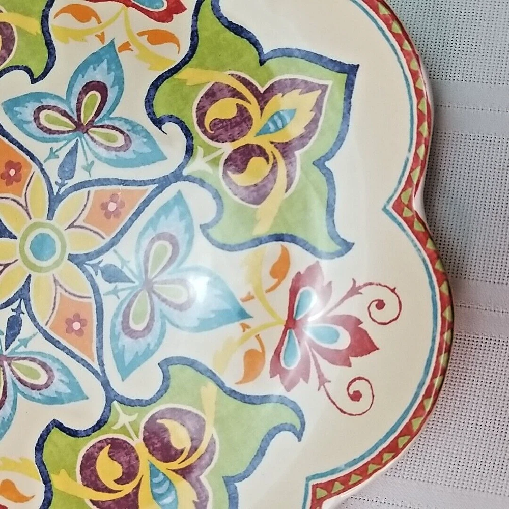 This product is a set of 4 salad plates from Pier 1 Imports. The plates are made of ironstone and have a round shape with scalloped edges with a multicolor tapestry pattern. They are microwave and dishwasher safe, and are decorated with a printed backstamp. The plates are part of the Tapestry product line and were produced in China using pottery techniques. One of the plates has a chip.