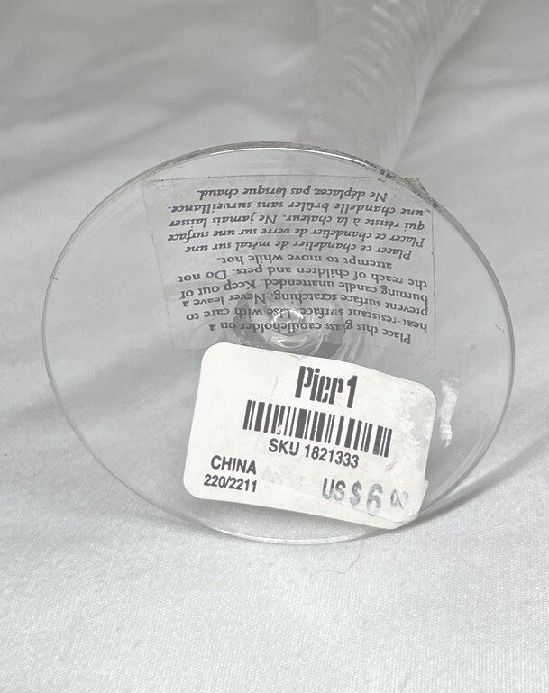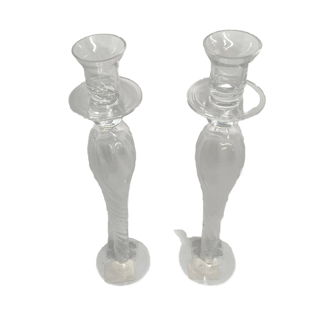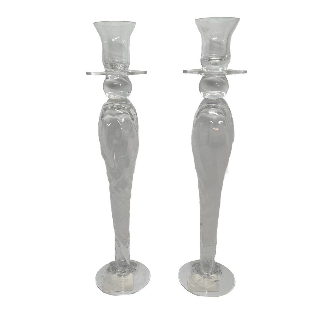 Bring a touch of boho elegance to any occasion with this set of two clear glass taper candle holders from Pier 1 Imports. The holders stand at an impressive 11 inches tall and feature a tiered, hollow body design with gold trim accents that add a touch of shine and glamor to any room. Crafted in the late 20th century, these original candle holders are perfect for all occasions, whether you're looking to create a romantic atmosphere for a dinner party or add a decorative touch to your home. The holders come in a pack of two and are suitable for medium-sized candles. Their solid color pattern and shiny finish make them a timeless addition to any collection of decorative collectibles. No chips, cracks, or breaks.