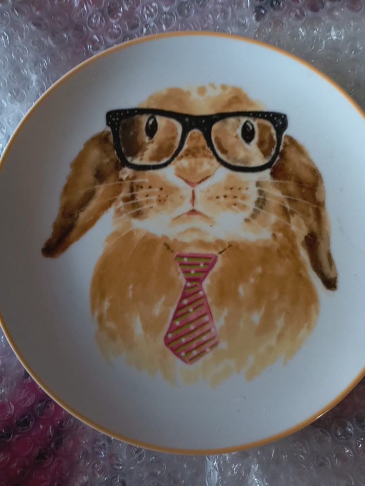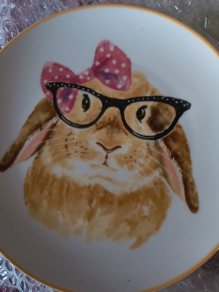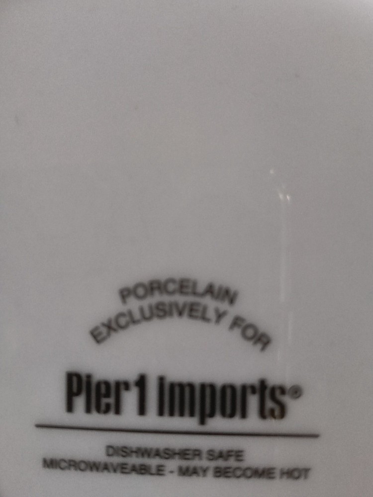 The Pier 1 Imports set includes four 8-inch round porcelain salad/luncheon plates featuring a contemporary design of bunny faces, ideal for Easter and all occasions. The plates are microwave and dishwasher safe up to 100°F, with a glossy finish and a white color scheme. Made in China in the 21st century, these original plates from the Bunnys product line by Pier 1 Imports are a charming addition to any table setting.