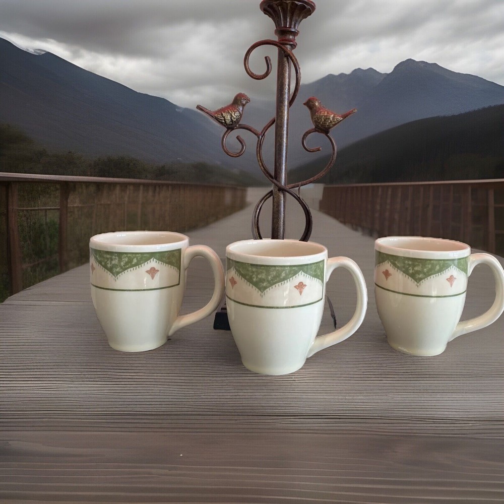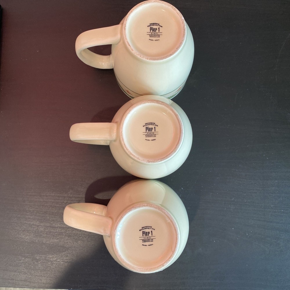 Enjoy your morning cup of coffee or tea with this delightful set of three coffee mugs from Pier 1 Imports. Made of high-quality Sabel Ironstone, these mugs are both durable and stylish. The ivory and green color combination makes them a perfect addition to any kitchen or dining room. These mugs are not just functional, but also decorative. The intricate design and attention to detail make them a great conversation piece. They are perfect for collectors or as a gift for anyone who appreciates unique and beautiful items. Add these coffee mugs to your collection today!