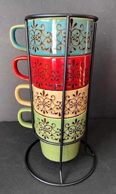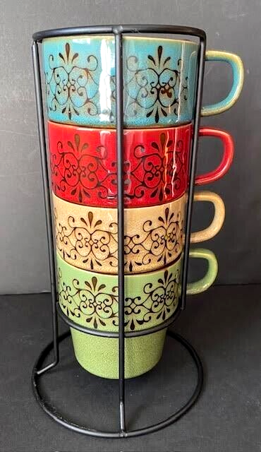 Pier 1 Imports Set of 4 Stacking Stoneware Coffee Mug Cups Red Yellow Blue Green See Photos For Dimensions No Chips Cracks Or Crazing Shipped USPS Priority Mail