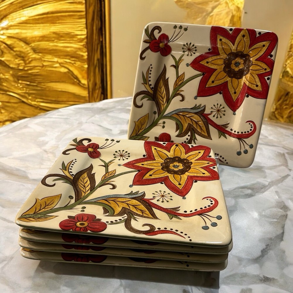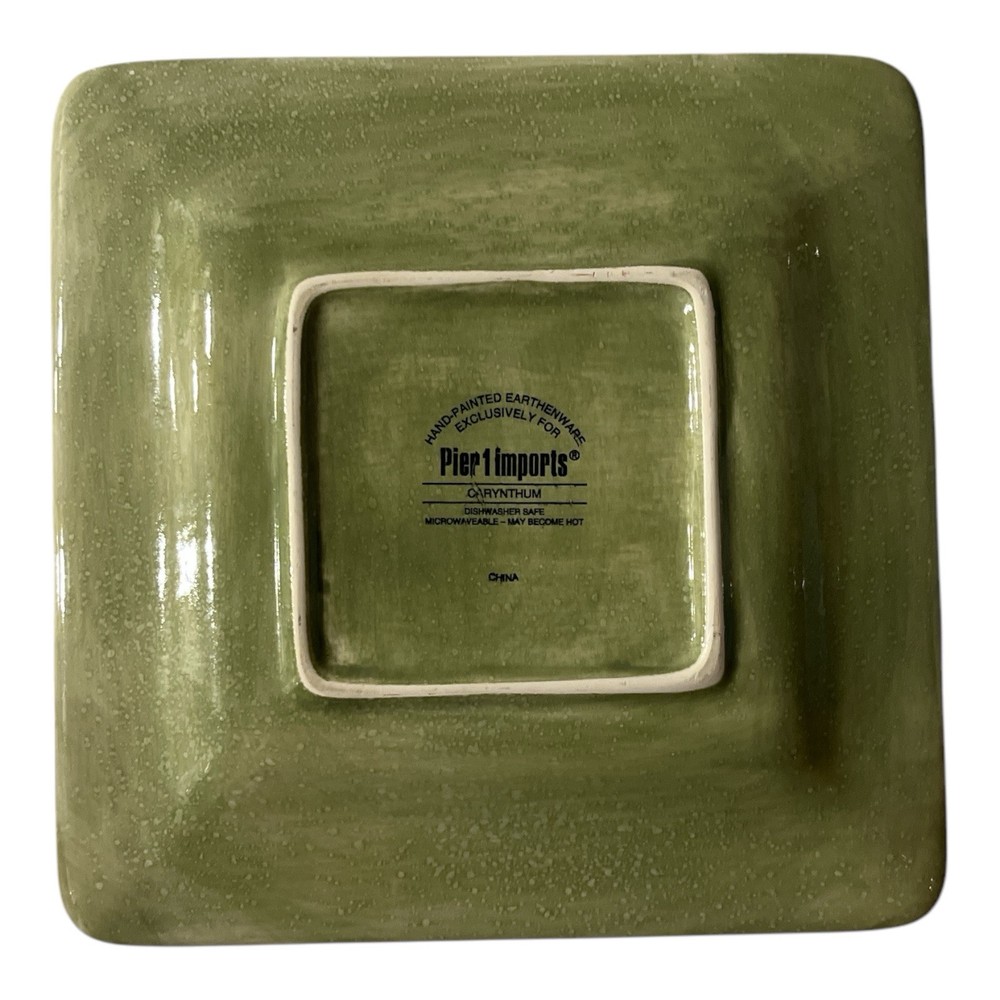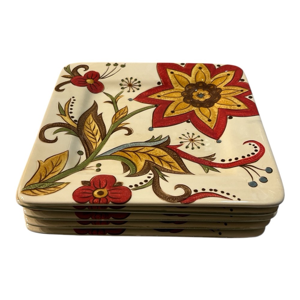 This set of five Pier 1 Imports salad plates features the beautiful Carynthum floral pattern. Each plate measures 8-3/4 inches in width and is made of hand-painted earthenware. The multicolor design adds a touch of elegance to any table setting. These plates are perfect for serving salads, but can also be used for other dishes. The backstamp is printed and the set includes five salad plates. Excellent condition, no cracks or chips.