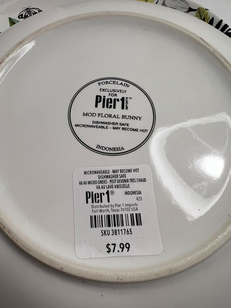 The Pier 1 Imports Set/4 Exclusive MOD FLORAL BUNNY Rabbit Porcelain Salad 8" Plates features a charming Mod Floral Bunny pattern on round porcelain plates, perfect for all occasions. These multicolor plates feature a bunny theme and are microwave and dishwasher safe for easy cleaning. With a printed backstamp and a diameter of 8 inches, this original set from Pier 1 Imports adds a touch of whimsy to your table setting. ******************** Please See Pictures Additional Pictures are available upon request. Payments If payment isn't received within this time period, the order will be revoked and a Non-Payment Bidder alert will be filed. Shipping All Items Will Be Shipped USPS or UPS Ground Unless Otherwise Specified. Feedback Your feedback is very important to me. Before providing negative feedback, Please contact me to resolve any issues or concerns. Returns Return Policy – Your satisfaction is important to me. Buyer will be responsible for return shipping charges on any approved returns. Thank You for Your Purchase with, Giselle’s Gabinet