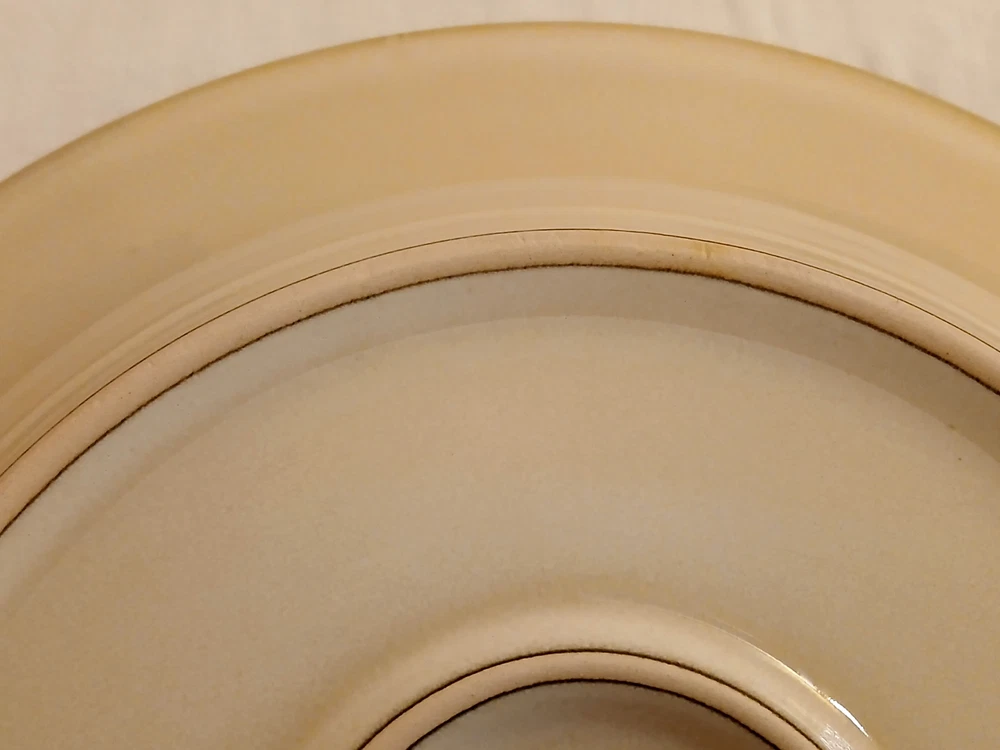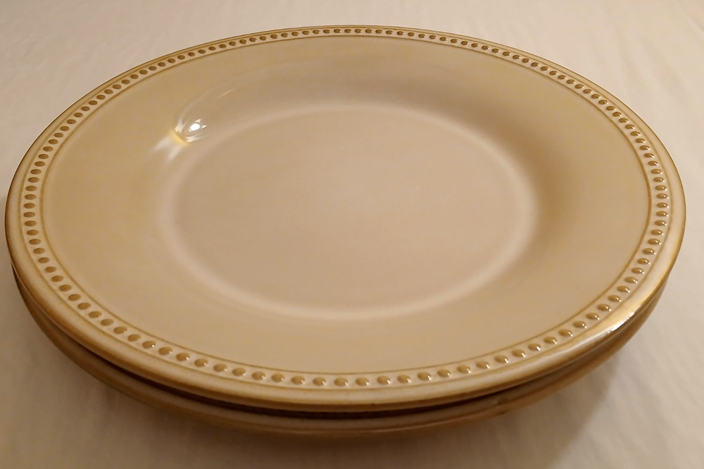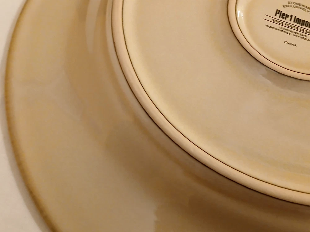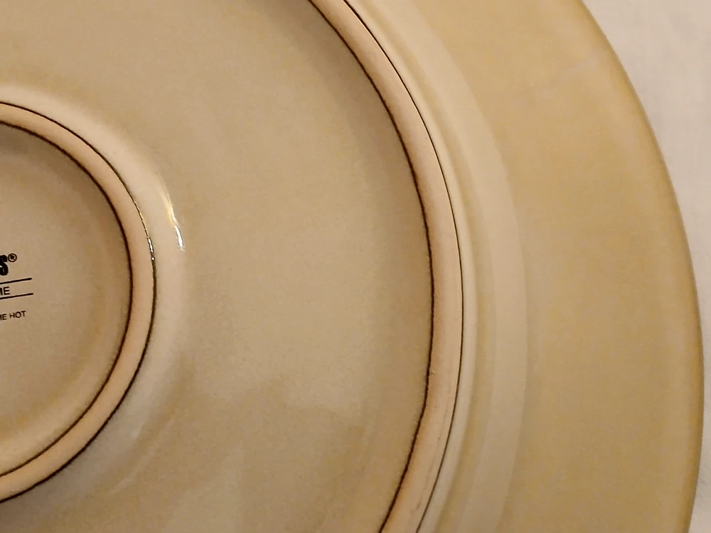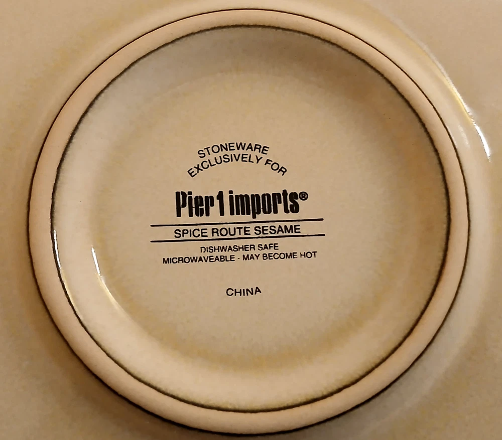Pier 1 Imports Spice Route Sesame dinner plate set of 2 10 1/2"diameter 1 1/4"tall. Utensil marks on inside and stains on outside. Refer to pictures for condition. Made in China. Will consider all offers. Combine Shipping - will automatically be adjusted when items are placed in shopping cart.