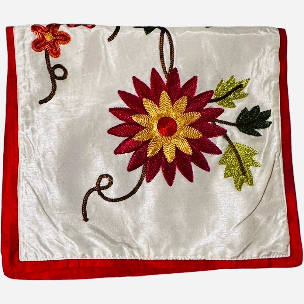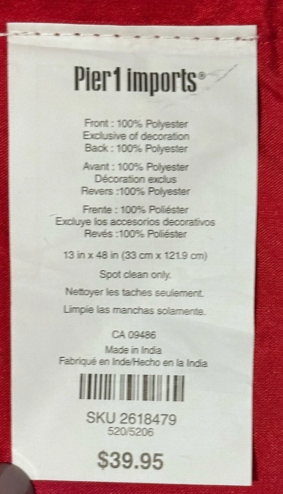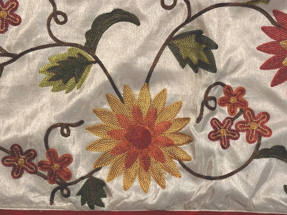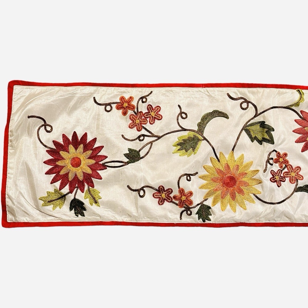 Add a touch of modern elegance to your dining table with this beautiful Pier 1 Imports Spring Flower Embroidered Red Yellow Floral Table Runner. The 100% polyester material ensures durability and easy maintenance. The intricate floral pattern in vibrant colors adds a touch of spring and garden vibes. preowned condition 2 tiny spots, shown in last photo. Could possibly wash out 13 inches wide 48 inches long