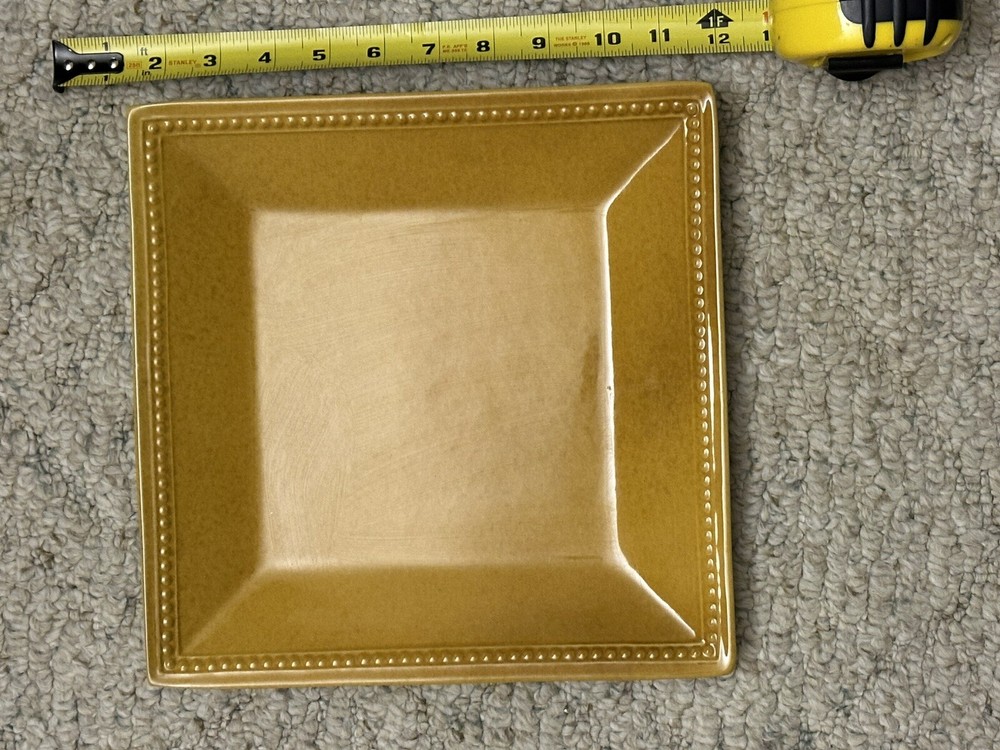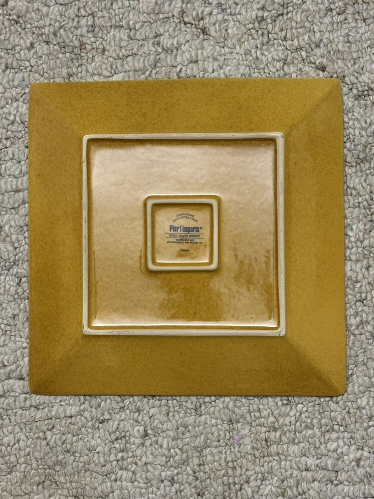 Add a touch of elegance to your dining table with this beautiful yellow dinner plate from Pier 1 Imports. Made of sturdy stoneware, this 10 1/2" square plate features a glossy finish and a solid pattern that is perfect for any occasion. Its stackable design and microwave/dishwasher safe capabilities make it a convenient addition to your kitchen. The plate is decorated with the Route Spice Ginger design, giving it a unique and decorative touch. Whether you're hosting a dinner party or having a cozy meal with your family, this dinner plate is sure to impress your guests. Its production style is earthenware, and it has a printed backstamp. The plate weighs 2.2 lbs and is part of the Pier 1 Imports Route Spice Ginger product line.
