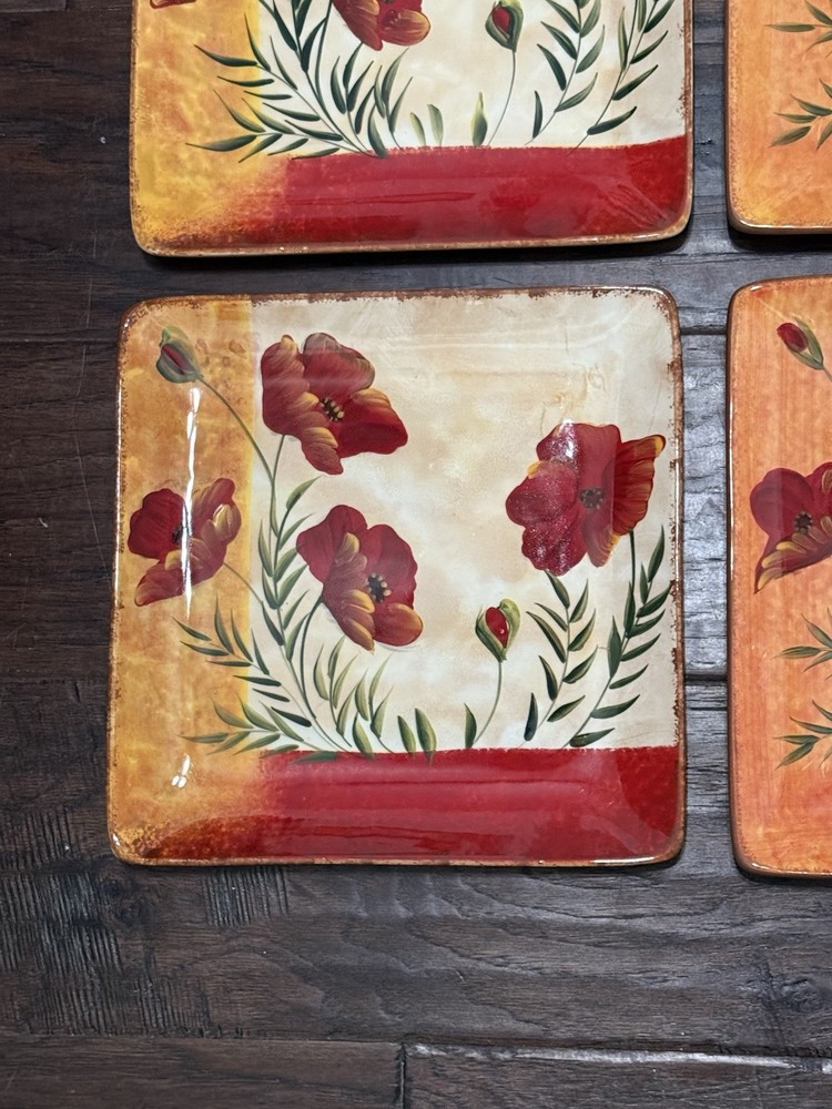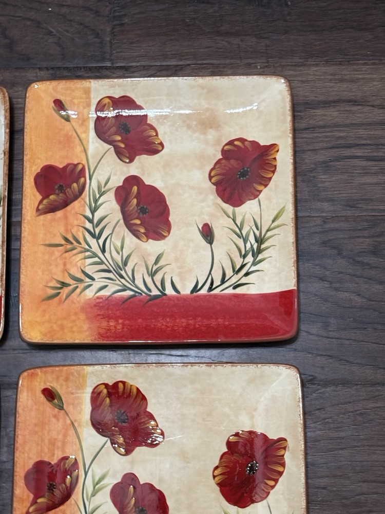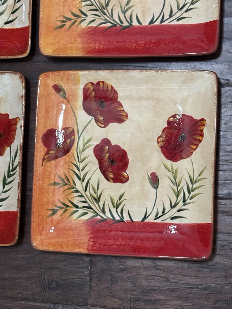 Pier 1 Imports Square Dinner Plates Poppies 10” Set of 4 Pier One Retired