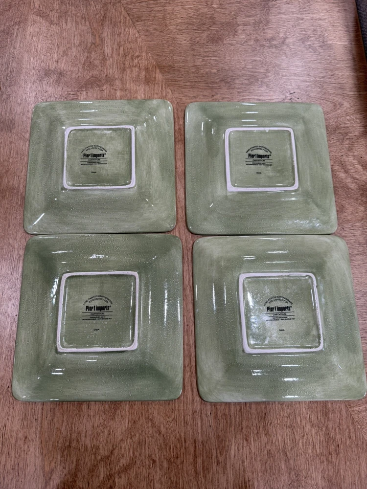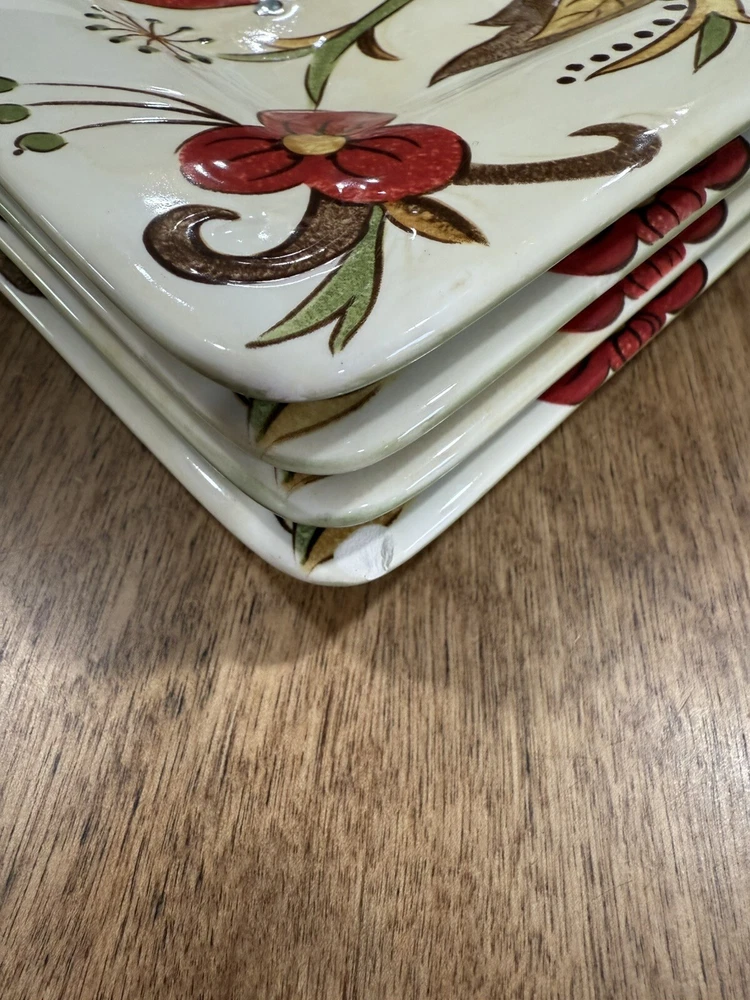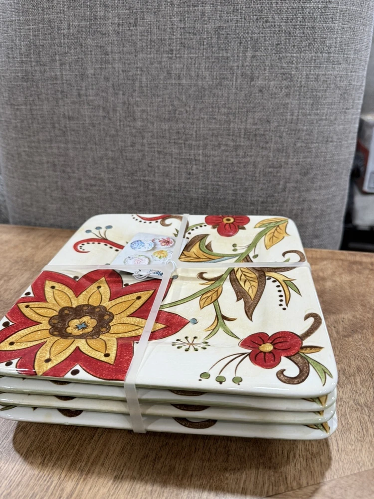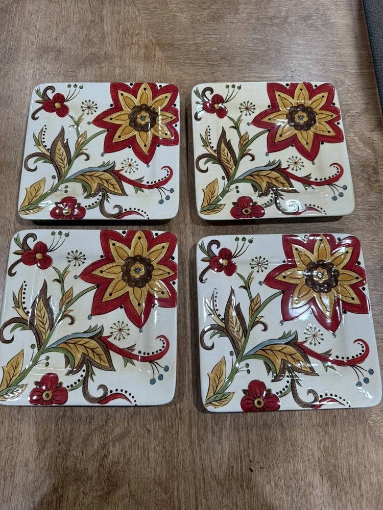 Pier 1 Imports Square Salad Plates Carynthum 9" Set of 4 is a limited edition, decorative plate set from 2009 with a Mid-Century Modern style. The set features a floral pattern in a multicolor palette on glossy stoneware. Each plate is 9 inches high and is part of the Carynthum product line. This original Pier One design is perfect for all occasions and adds a touch of elegance to any table setting. Note the last picture shows one chip on the last plate. thank you.
