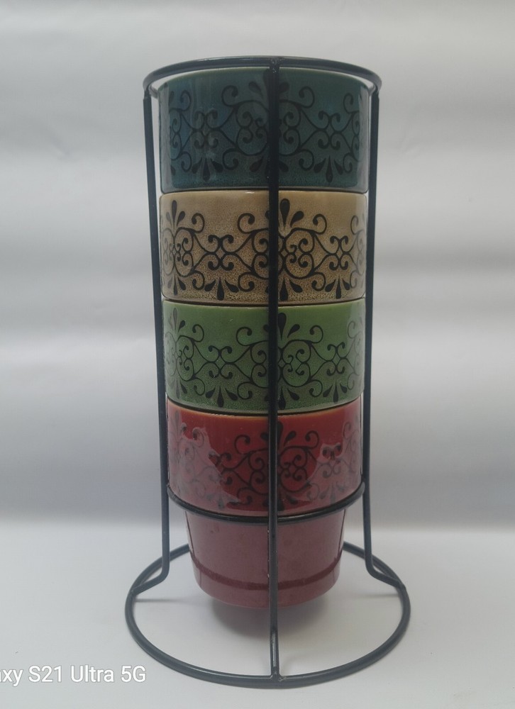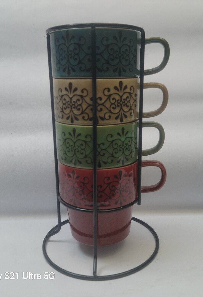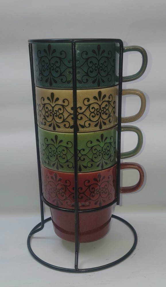 Add a touch of elegance to your mornings with this Pier 1 Imports stackable coffee mug set. The set includes four stoneware mugs, each with a unique Celtic art pattern in a beautiful multicolor design. The round shape and classic style make these mugs perfect for all occasions, whether you're enjoying your morning coffee or hosting a tea party. The stackable feature allows for easy storage and transport, while the metal rack provides a sturdy display option. These mugs are perfect for anyone who loves bohemian, floral, or Buddha-themed decor. Get your service for four and elevate your coffee game with this stunning set.