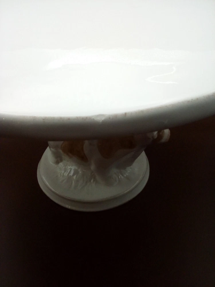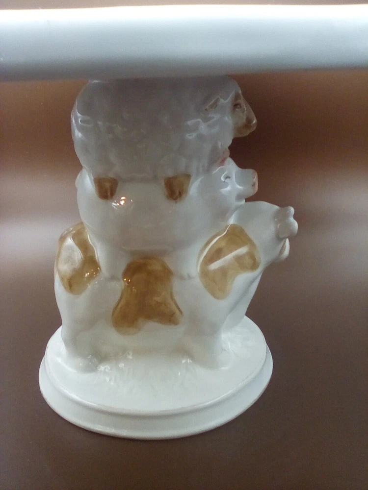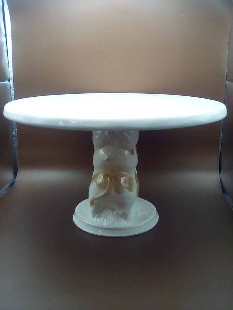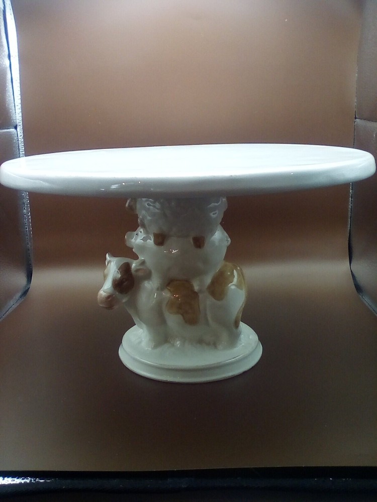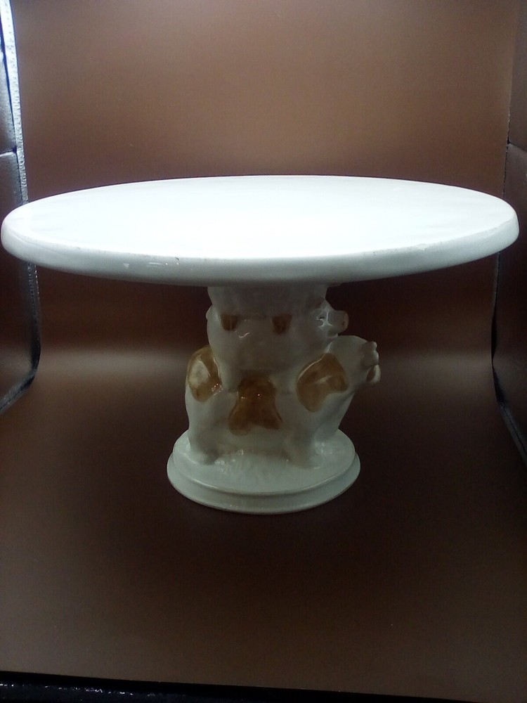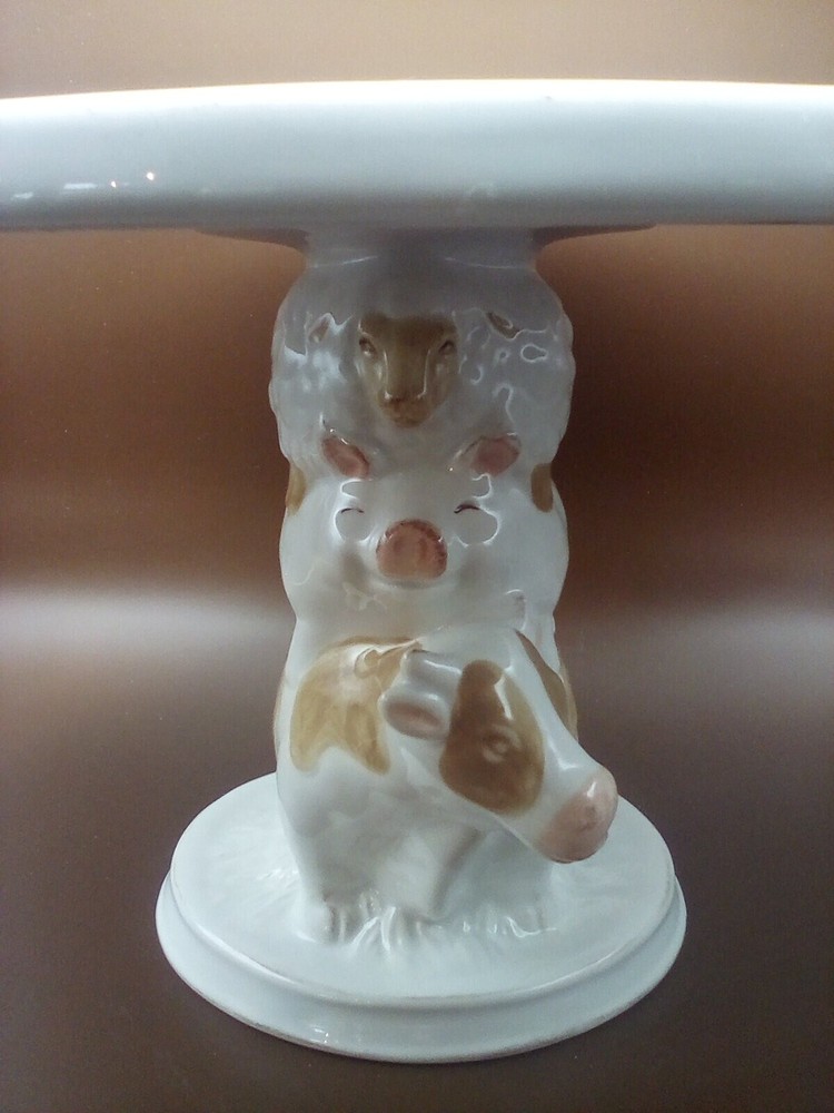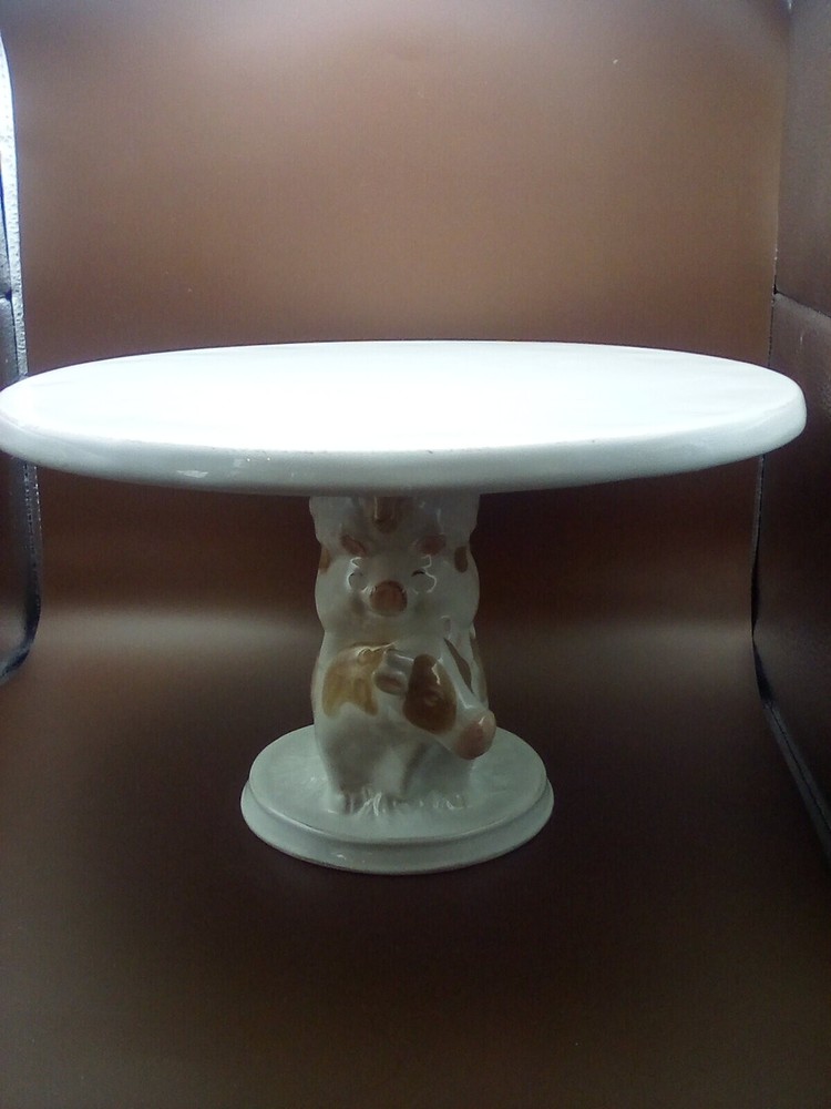 Add a charming touch to your dessert display with this Pier 1 Imports cake stand. The white ceramic stand features a stacked cow, pig, and sheep design with sunflowers, perfect for any occasion. The round plate measures 11.5 inches in diameter and sits atop a 7-inch handmade pedestal. Ideal for serving cakes, pastries, and other treats, this decorative cake stand weighs 2 pounds and 15 ounces. The plate also bears a printed backstamp and belongs to the Sunflowers product line. Do not miss the chance to showcase your baked goods in this delightful piece.
