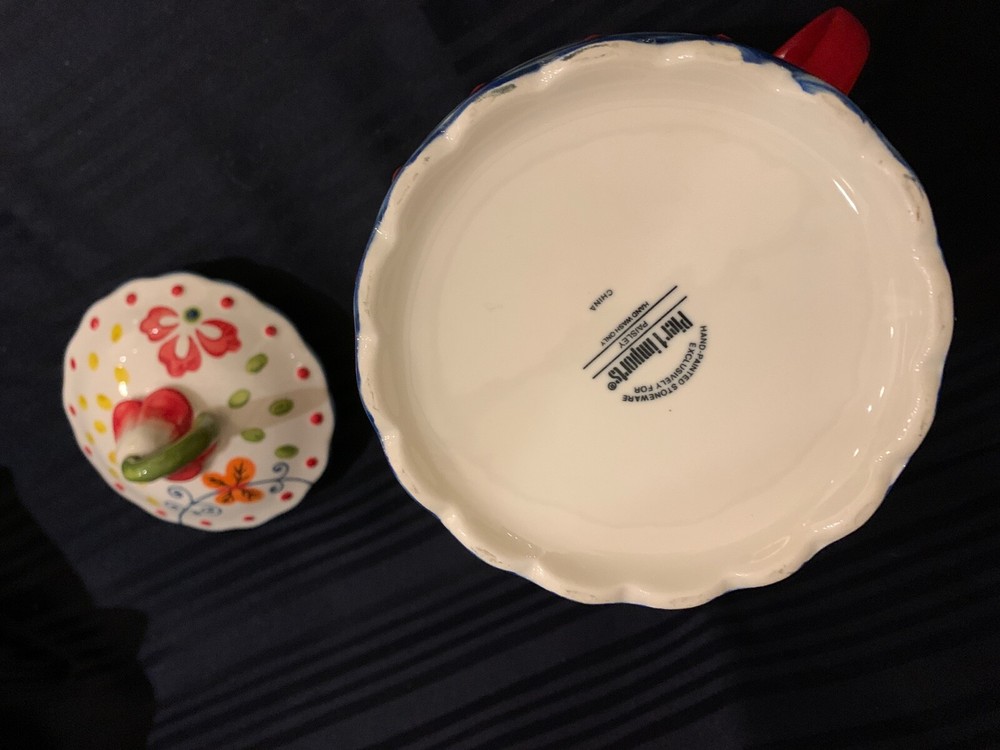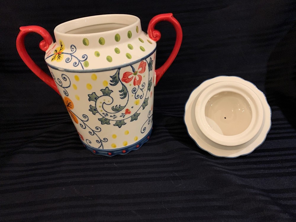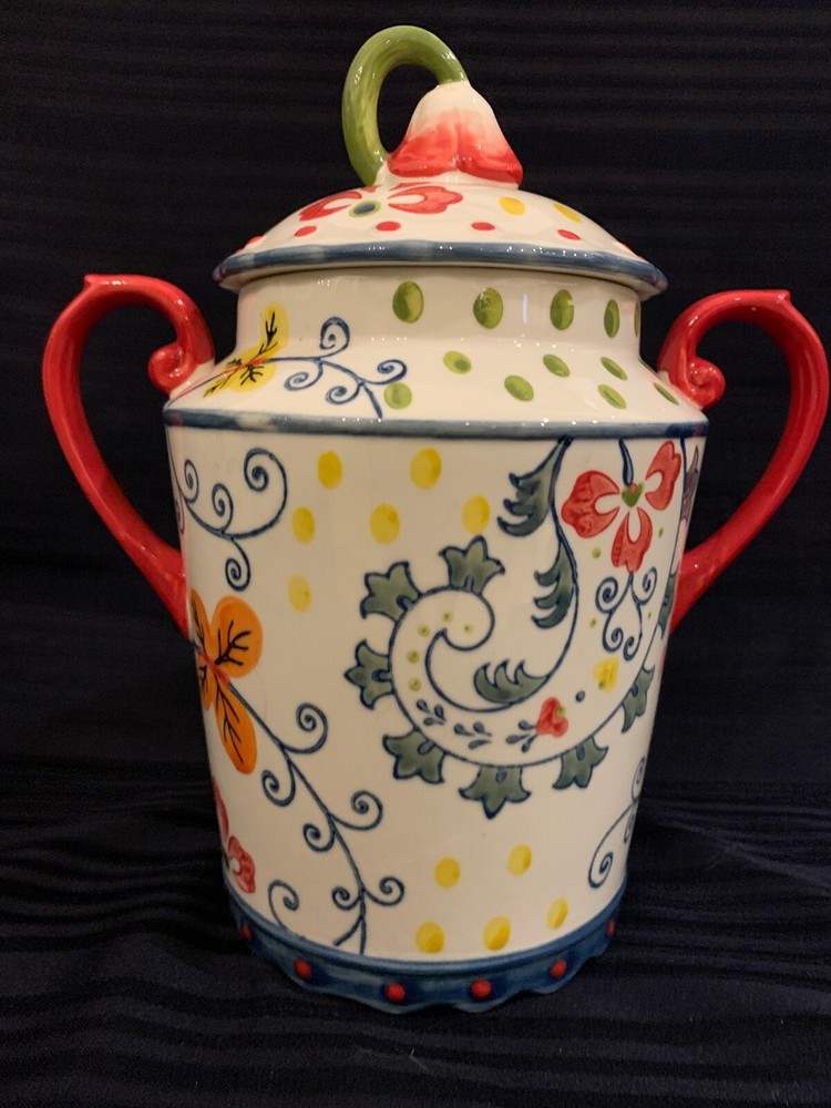 A colorful floral paisley 10" Pier 1 canister in a very vibrant multi- color scheme, the top handle is in the shape of an inside down flower, a retired piece....
