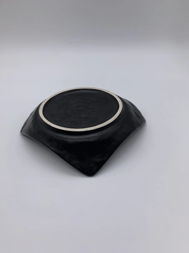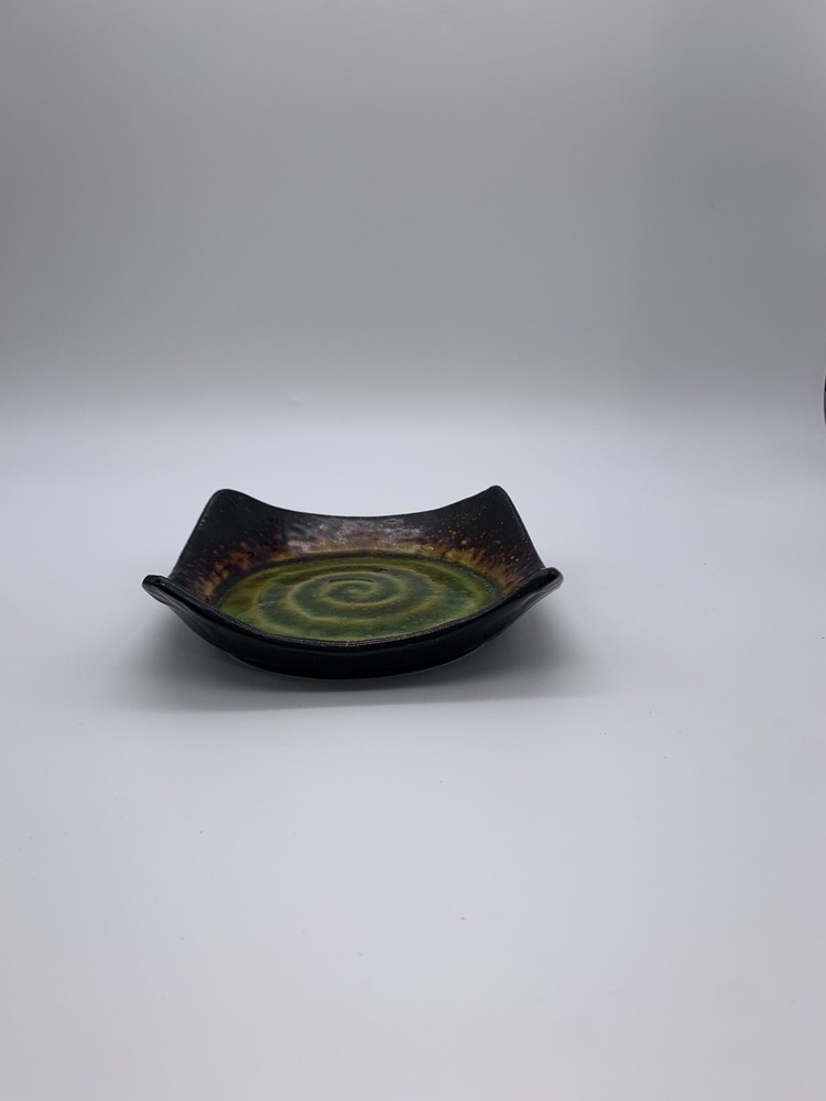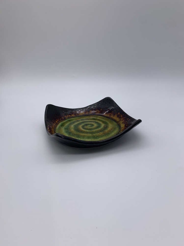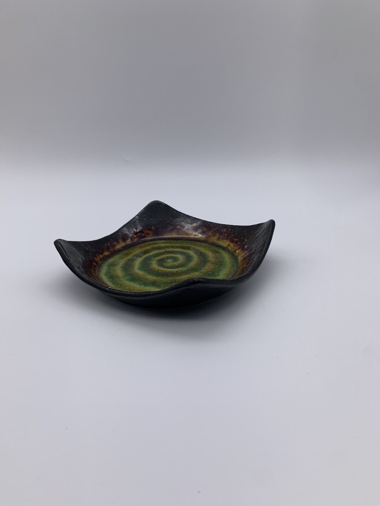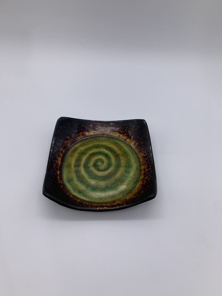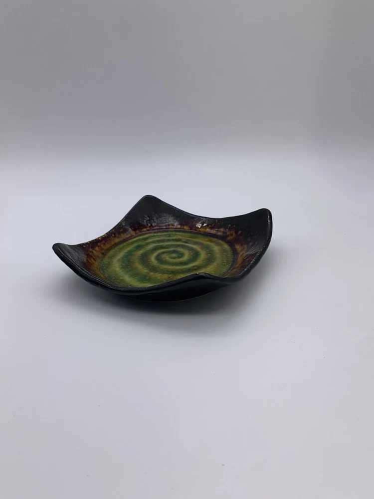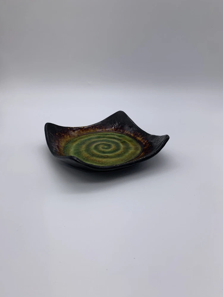 This unique Pier 1 Imports stoneware piece features a beautiful hand-painted green swirl pattern. The versatile item can be used as a candle holder, catchall, or trinket dish and is suitable for any room in the house. It measures 6 inches in length and width, with a height of 1-2 inches and weighs 11.5 ounces. The art deco style and glazed finish give it a decorative touch, making it perfect for all occasions. It is ideal for vanity or furniture and is easy to care for. This one-of-a-kind piece is a licensed reproduction with an unknown country of origin and is unboxed. The item comes from a pet-free and smoke-free home.