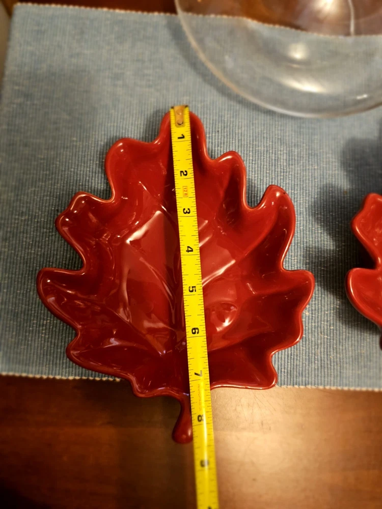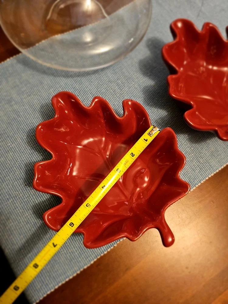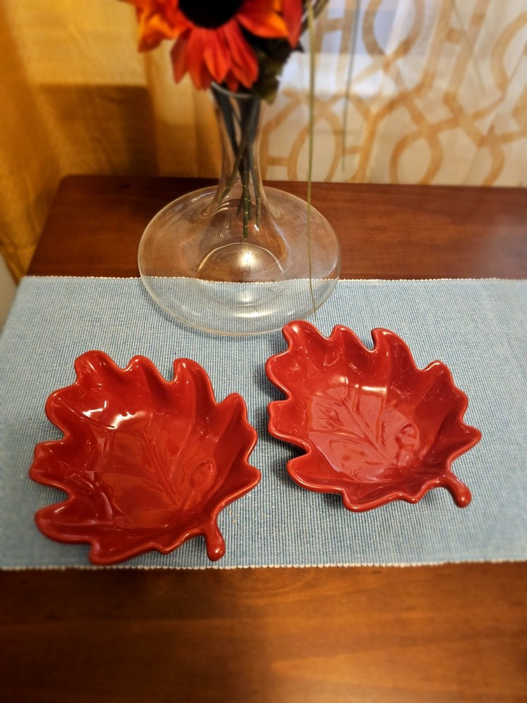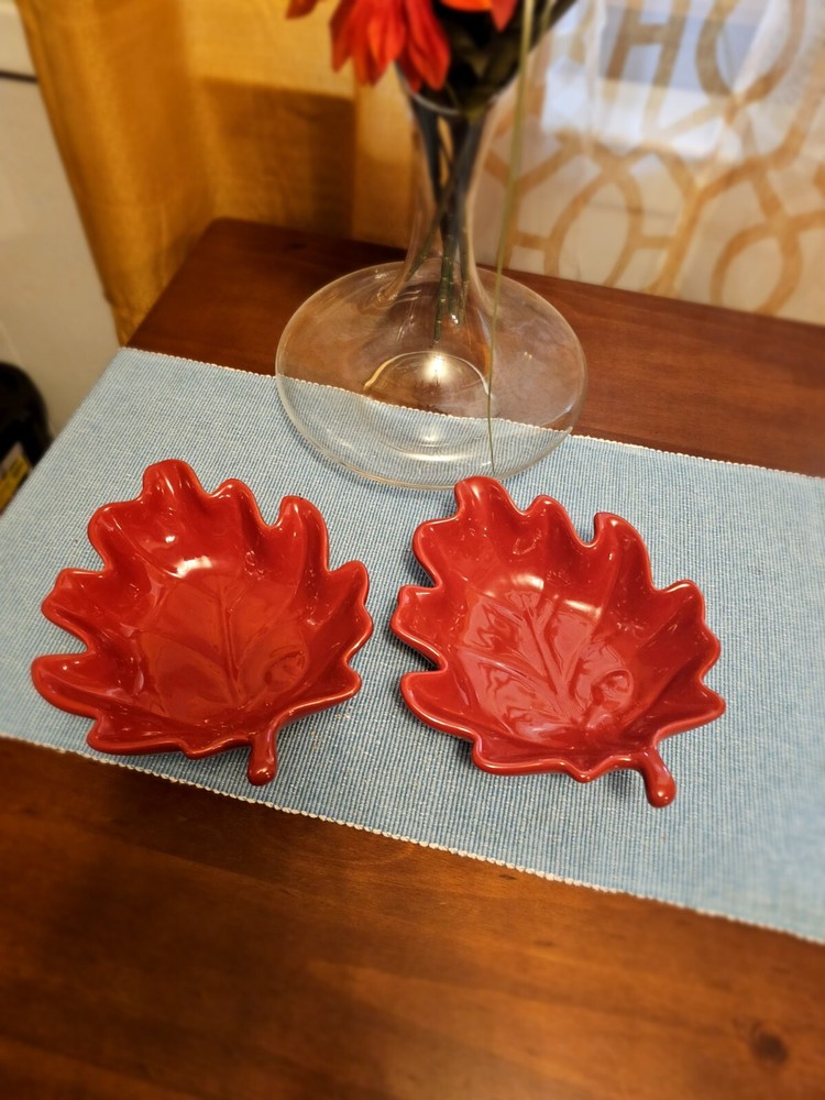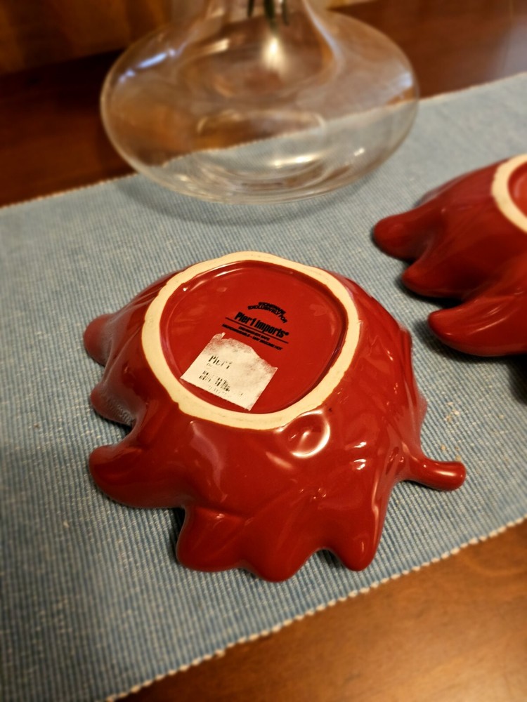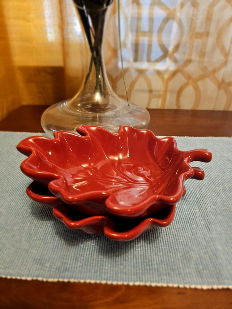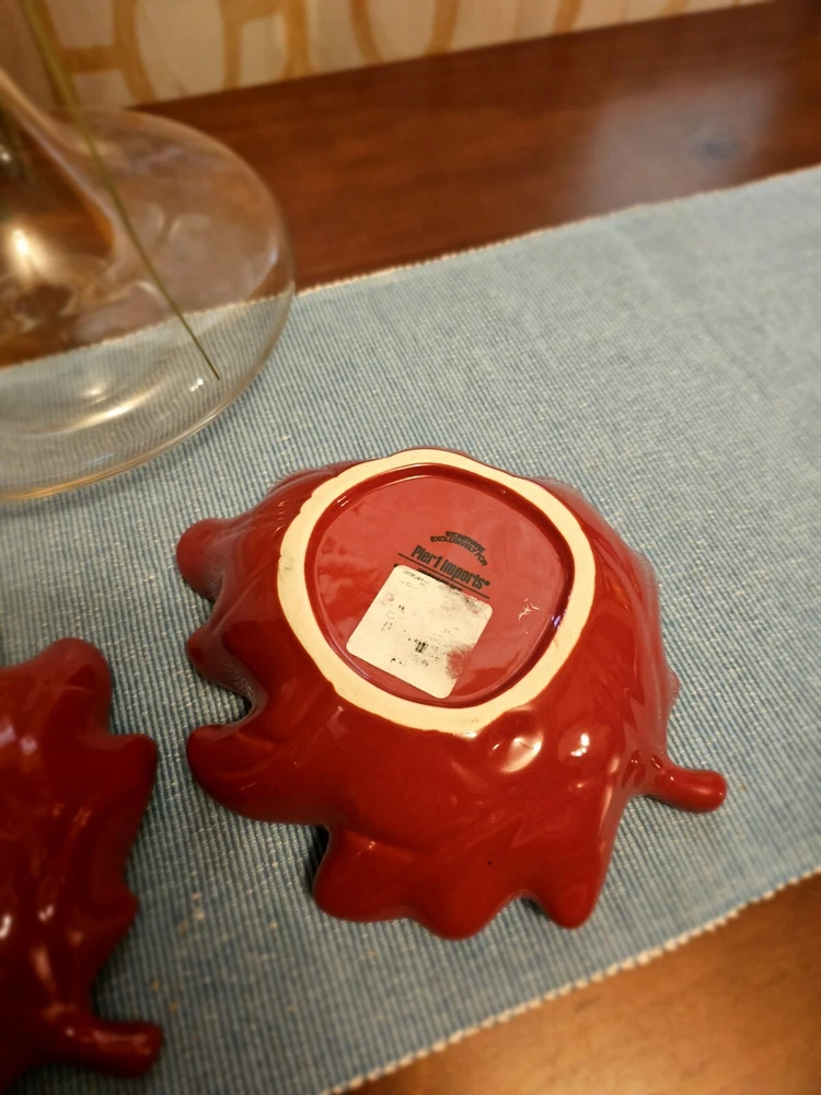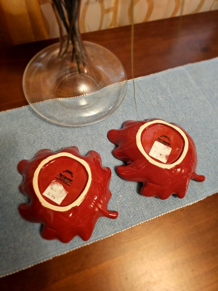 Add a touch of nature to your table setting with this beautiful two-piece bowl set from Pier 1 Imports. The contemporary style bowls come in a stunning red color, adorned with a leaf theme that's perfect for all occasions. Crafted from high-quality stoneware, these glossy-finished bowls are perfect for serving your favorite soups, salads, or snacks. The art pottery production style of these bowls adds a unique touch to your dinnerware collection. The backstamp indicates that they were produced in China using traditional pottery techniques. These bowls are not only functional but also make for a great decorative item in your home. Whether you're hosting a dinner party or having a cozy night in, these Pier 1 Imports Stoneware Red Fall Leaves Bowls will be the perfect addition to your table. In great condition.