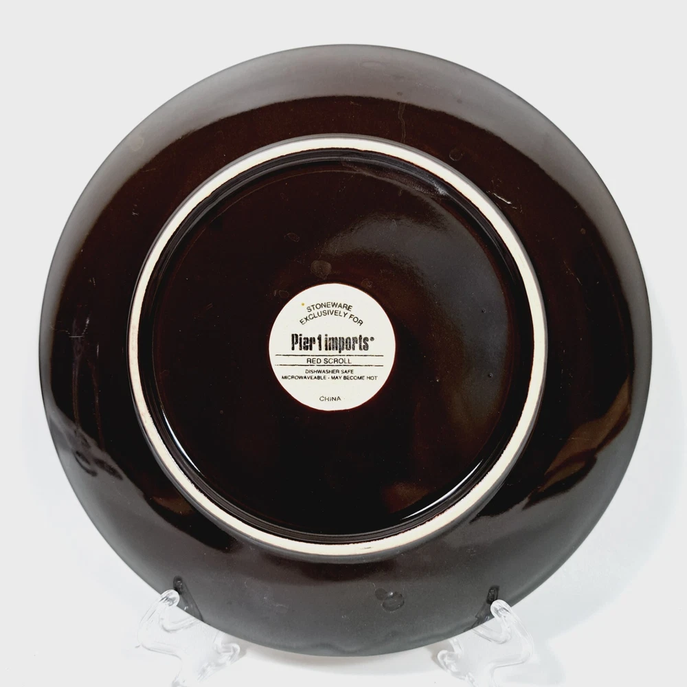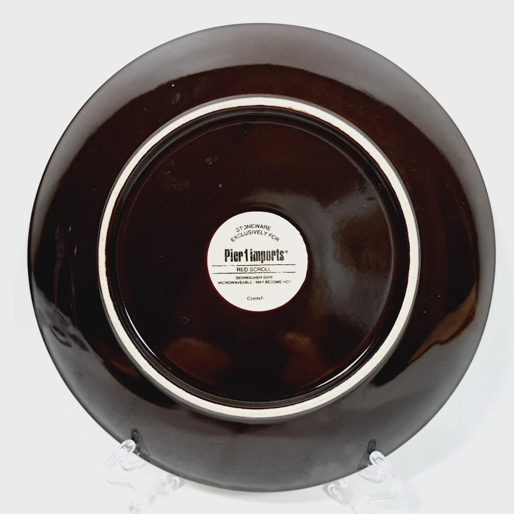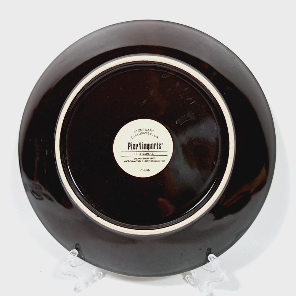 Pier 1 Imports Stoneware Red Scroll 8 1/4" Salad Plates Set of 4 Dishwasher and microwave safe In very good used condition-no chips or cracks. Some utensil marks from normal use. Please see all photos for condition as they are part of the description. Please see my other listing of this pattern. I will combine shipping for multiple purchases.