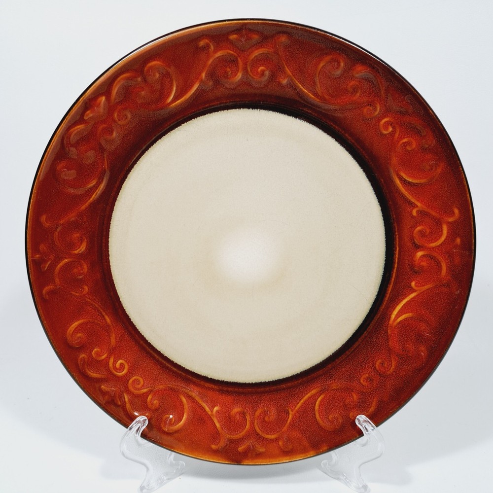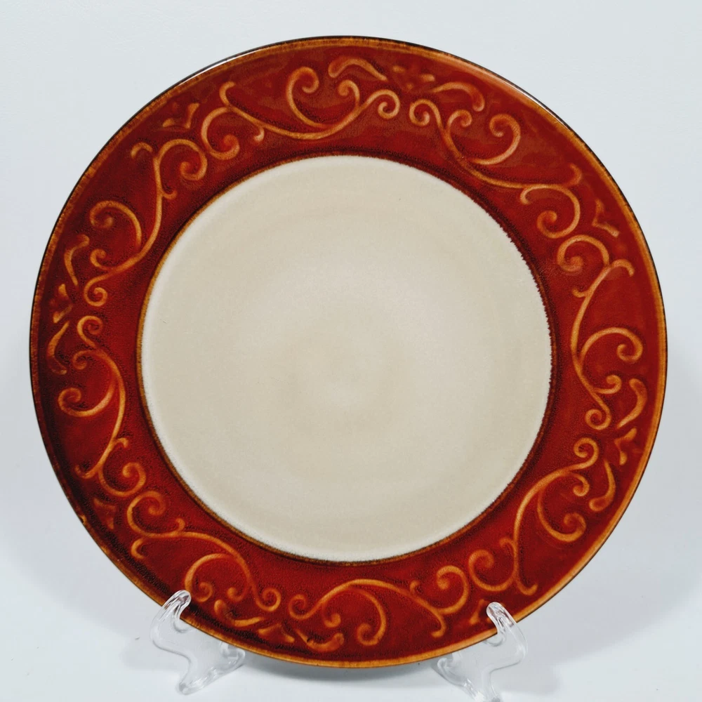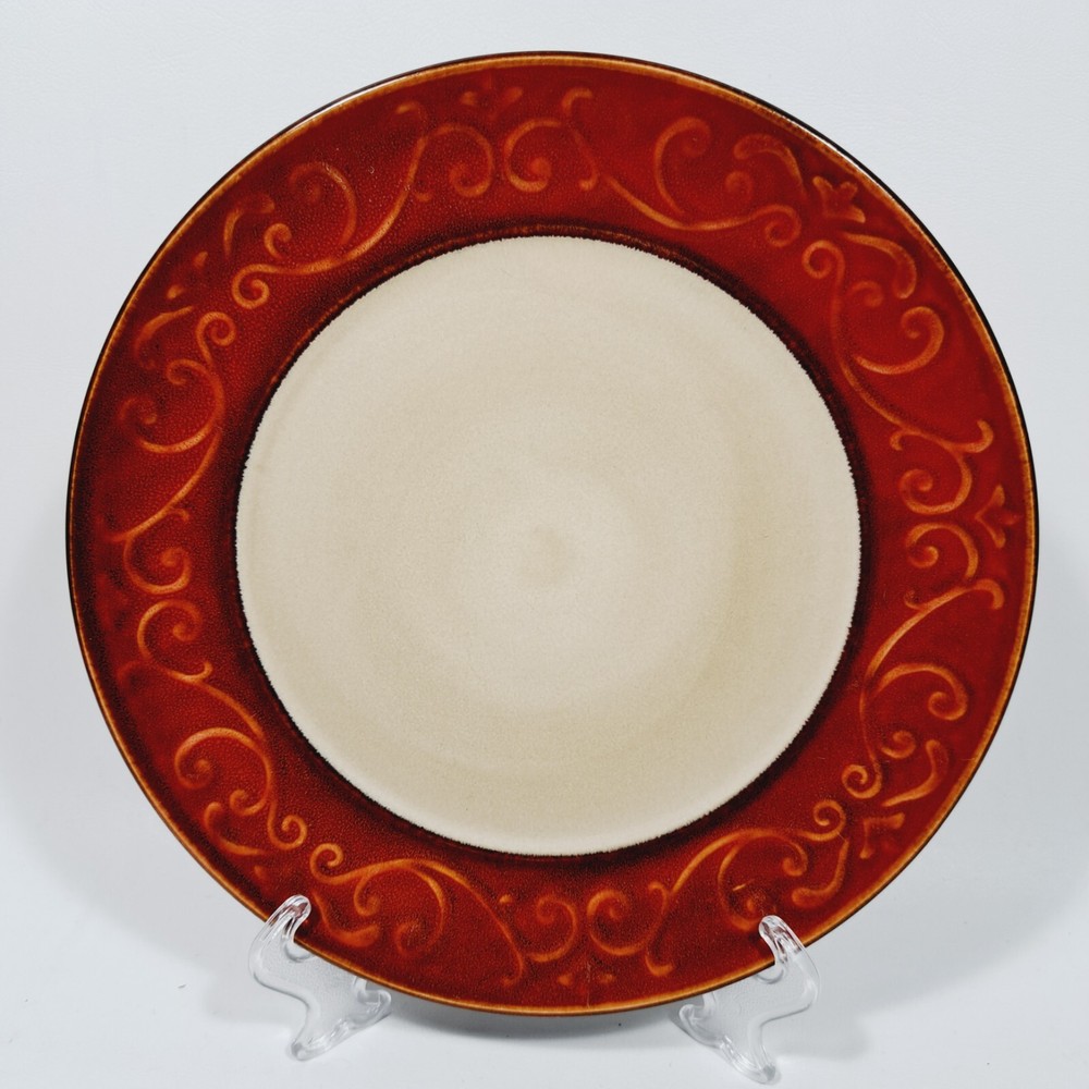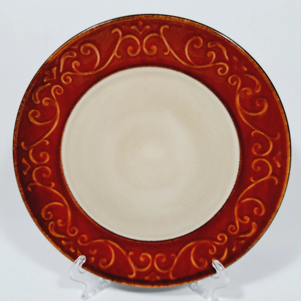 Pier 1 Imports Stoneware Red Scroll 8 1/4" Salad Plates Set of 4 Dishwasher and microwave safe In very good used condition-no chips or cracks. Some utensil marks from normal use. Please see all photos for condition as they are part of the description. Please see my other listing of this pattern. I will combine shipping for multiple purchases.