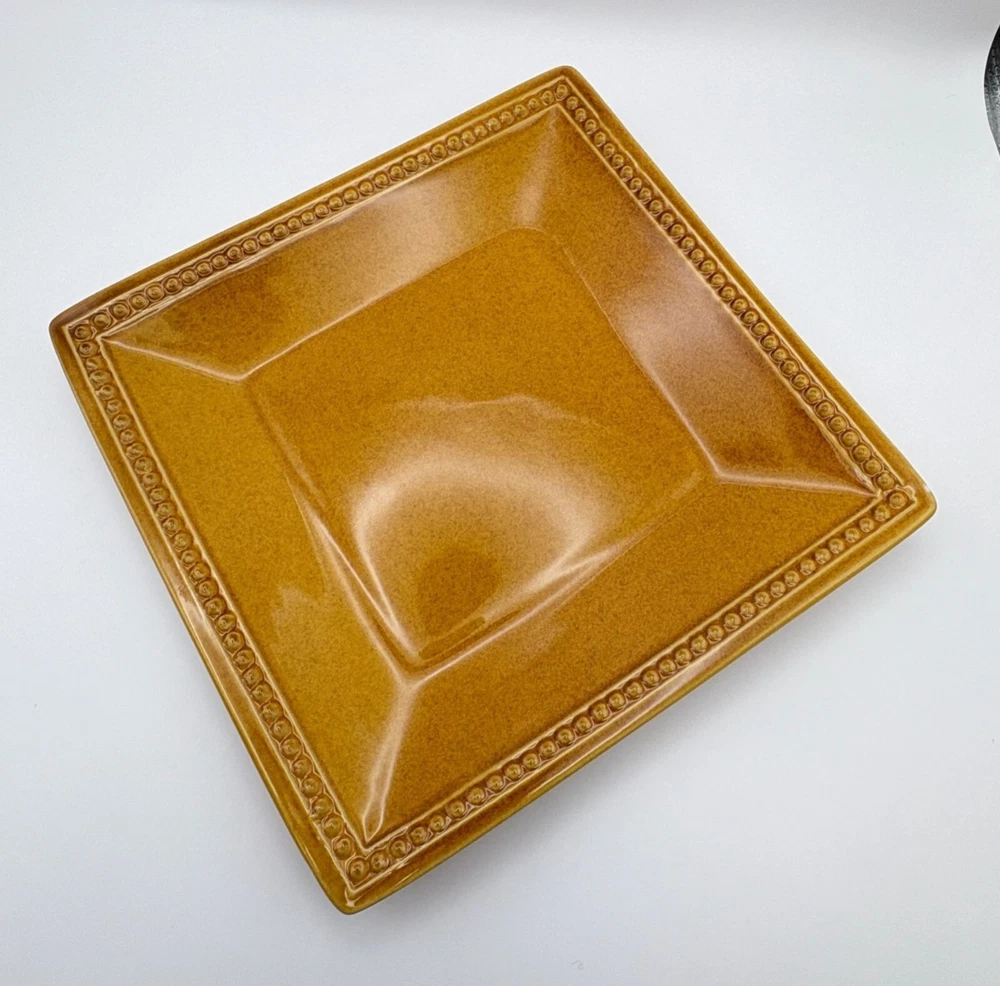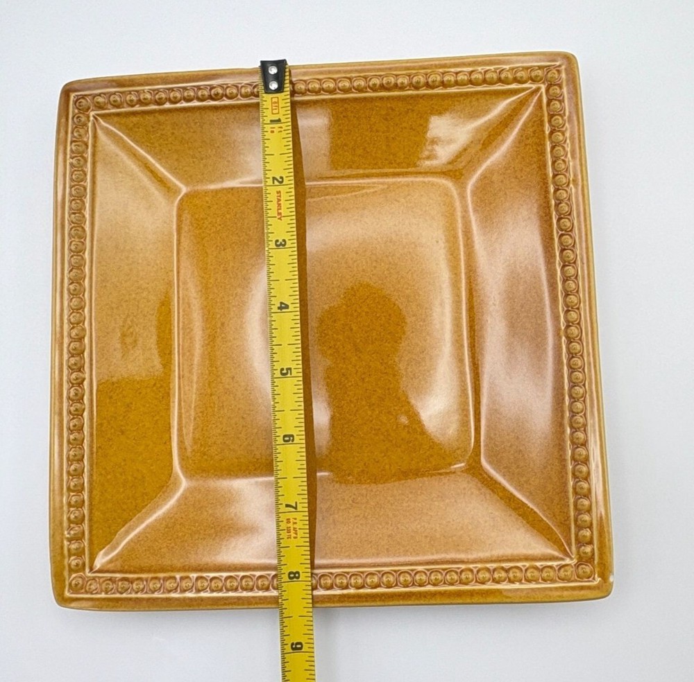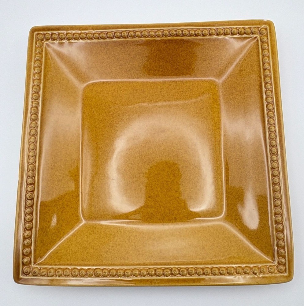 This stylish square plate from Pier 1 Imports instantly elevates any meal with its elegant ginger color and beaded edge detail. The heavy stoneware feels premium and durable, perfect for daily use while adding a touch of sophistication. It's practical too—microwave and dishwasher safe—and in great condition with only minor signs of use. The 8.5-inch size is ideal for salads, appetizers, or desserts, making it a versatile addition to your tableware collection.