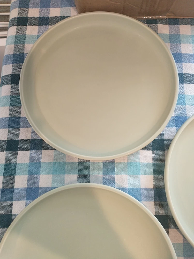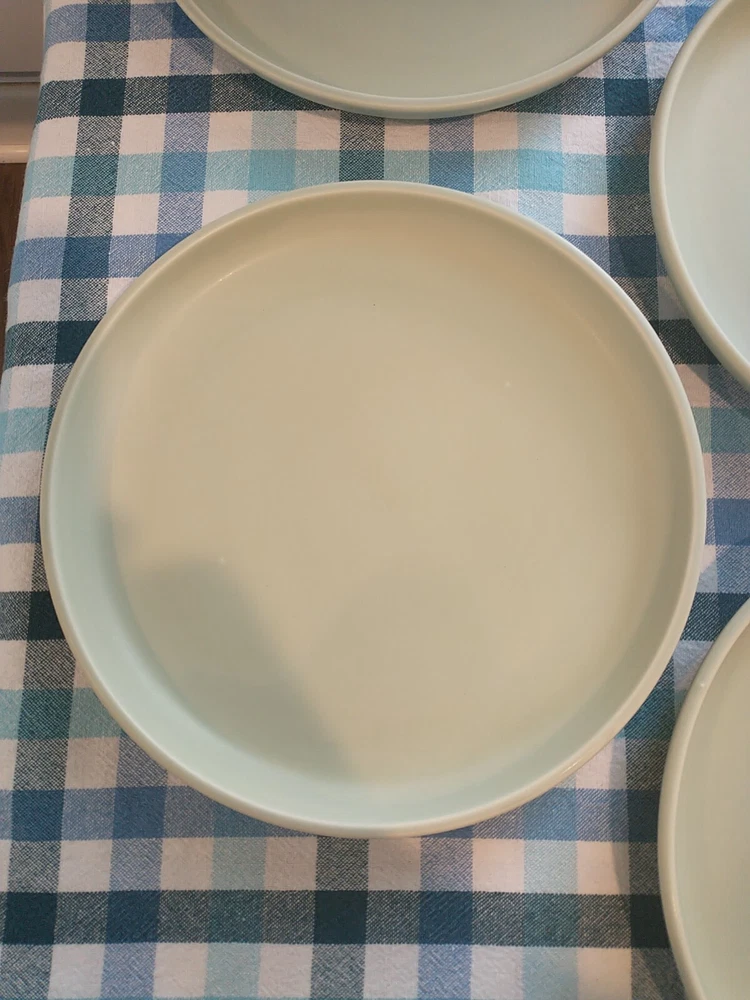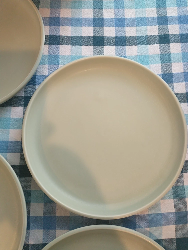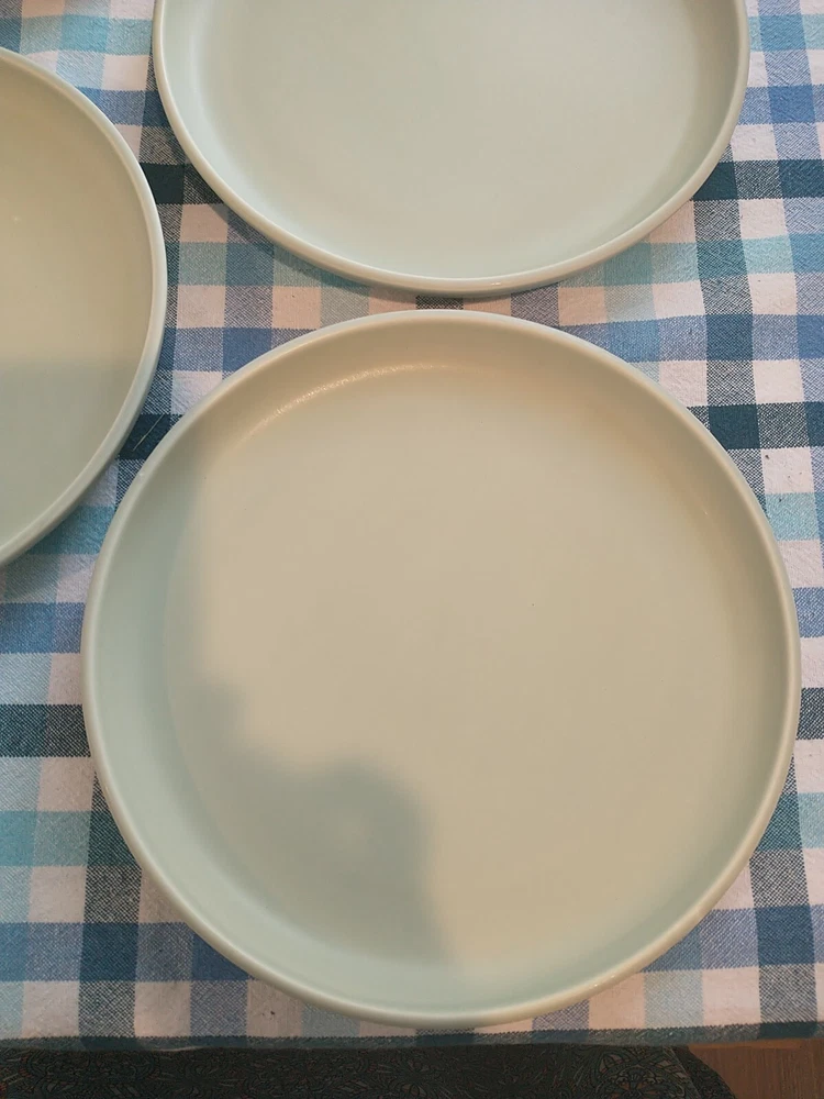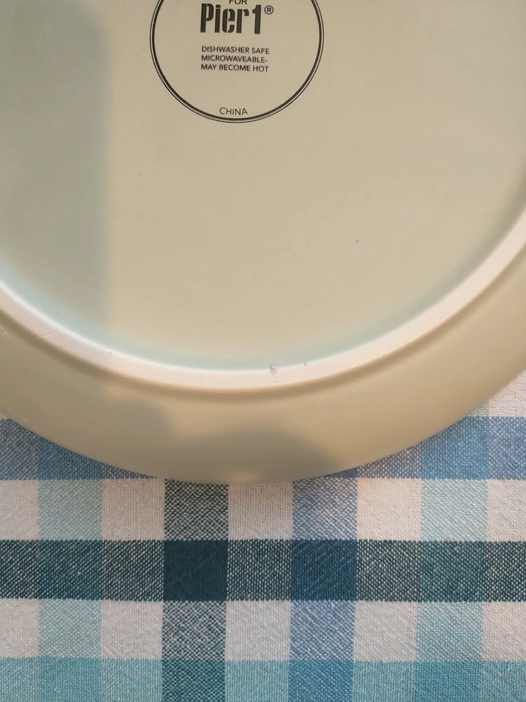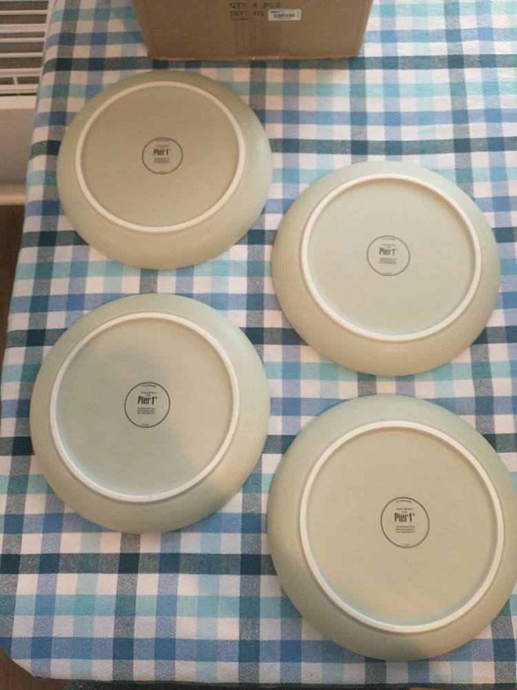 Add a touch of elegance to your dining table with these beautiful stoneware salad plates from Pier 1 Imports. The plates measure 8.75 inches in diameter and come in a pale green color that complements any table setting. Crafted from high-quality stoneware material, these plates are durable and perfect for everyday use. The brand Pier 1 Imports is known for its exceptional quality and style, and these plates are no exception. They are perfect for serving salads or any other dish and are sure to impress your guests. Whether you're hosting a formal dinner party or a casual get-together, these plates are a must-have. **There are a couple tiny whiteish blemishes on 1 of the plates, and a couple of rough spots on the bottom of the plates.**