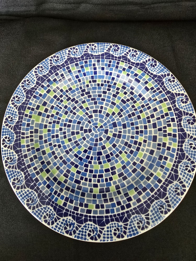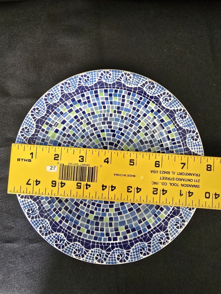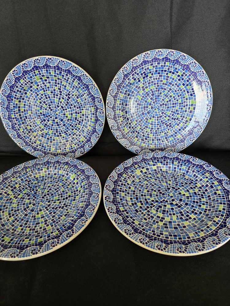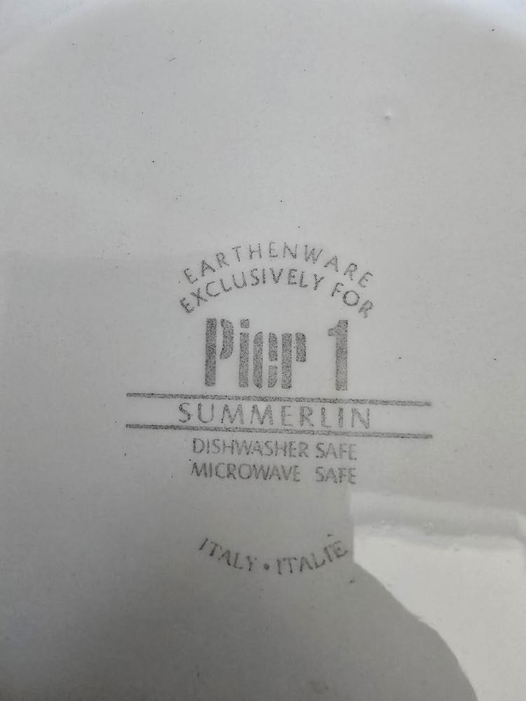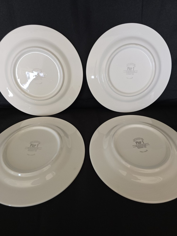 The Pier 1 Imports Summerlin set includes four vintage 7 3/4" salad, dessert, or appetizer plates in a blue and white color scheme. These stoneware plates are microwave and dishwasher-safe. Made in Italy. Excellent pre-owned condition. No chips or cracks. No utensil marks.