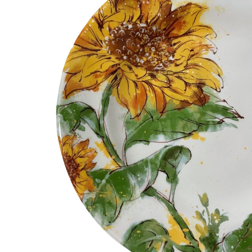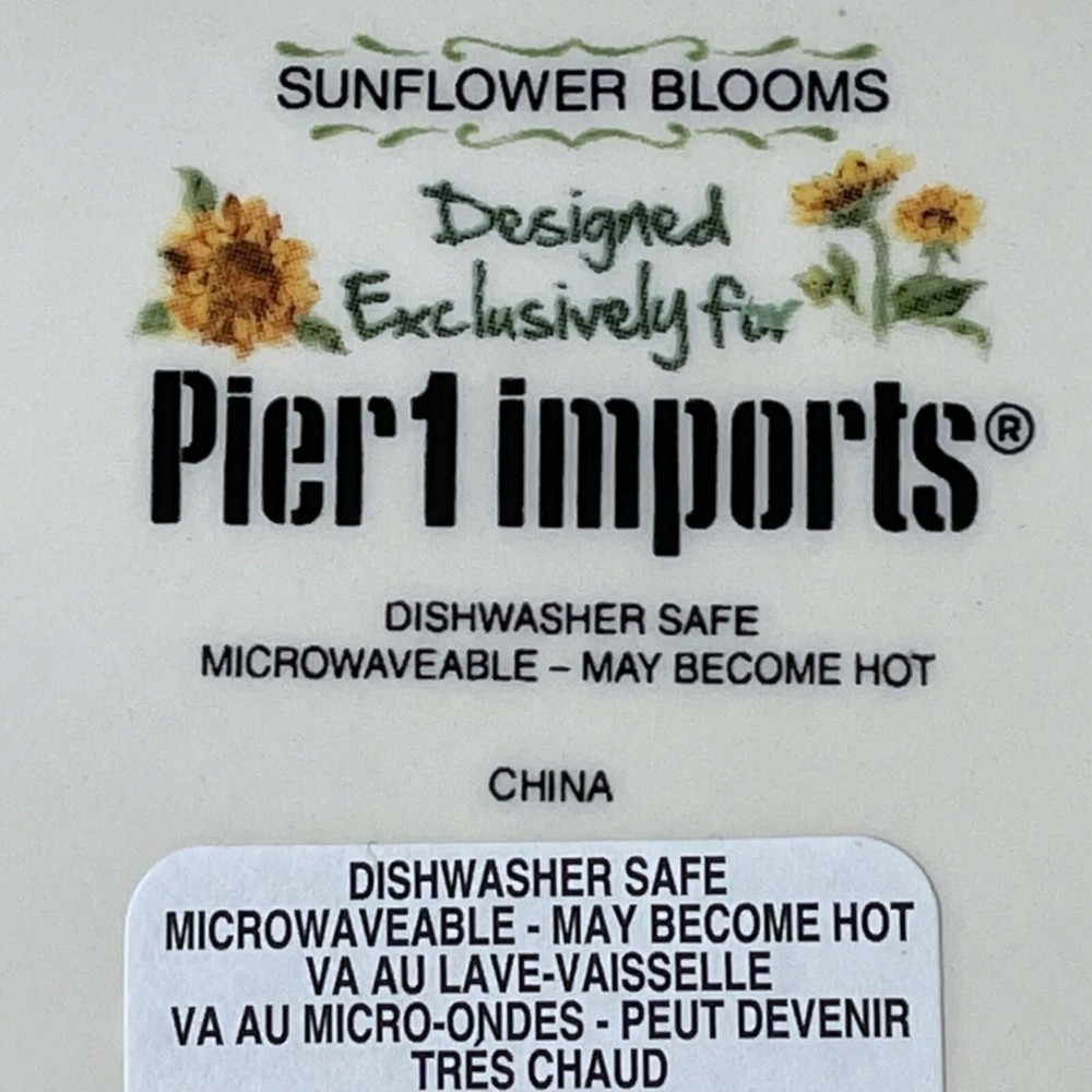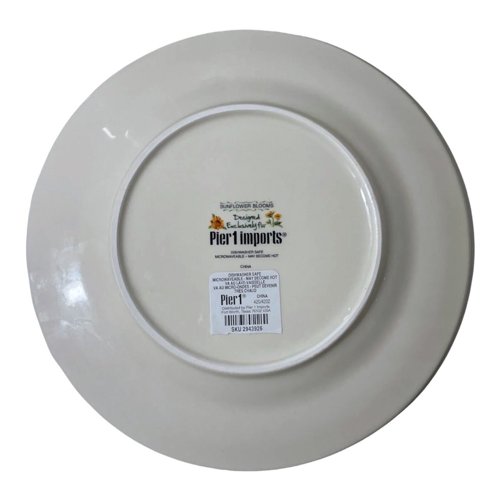 Brand new with tag This Pier 1 Imports Salad Plate features a beautiful Sunflower Blooms design. The plate is round and measures 8.5 inches in diameter. It is made of microwave and dishwasher safe china, with a glossy finish and a printed backstamp. The plate is perfect for all occasions and is suitable for adults. It is a vintage item with an Art Deco style, and is part of the Sunflower Blooms product line. This decorative plate is ideal for those looking to add a touch of elegance to their dinnerware collection.