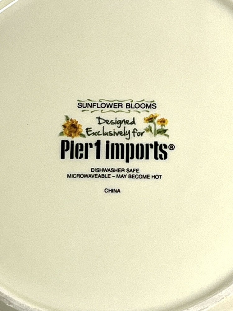 This Pier 1 Imports plate features a beautiful sunflower pattern on a round, ceramic surface. The yellow petals and glossy finish make it perfect for all occasions, whether it's for a dessert, luncheon, or salad. The plate is part of the farmhouse country style and is ideal for adults who appreciate a rustic aesthetic. The backstamp is printed with all the important details. Great condition except for a very tiny chip in the underside which is not visible one the front. See pictures for details. Thanks for visiting 798