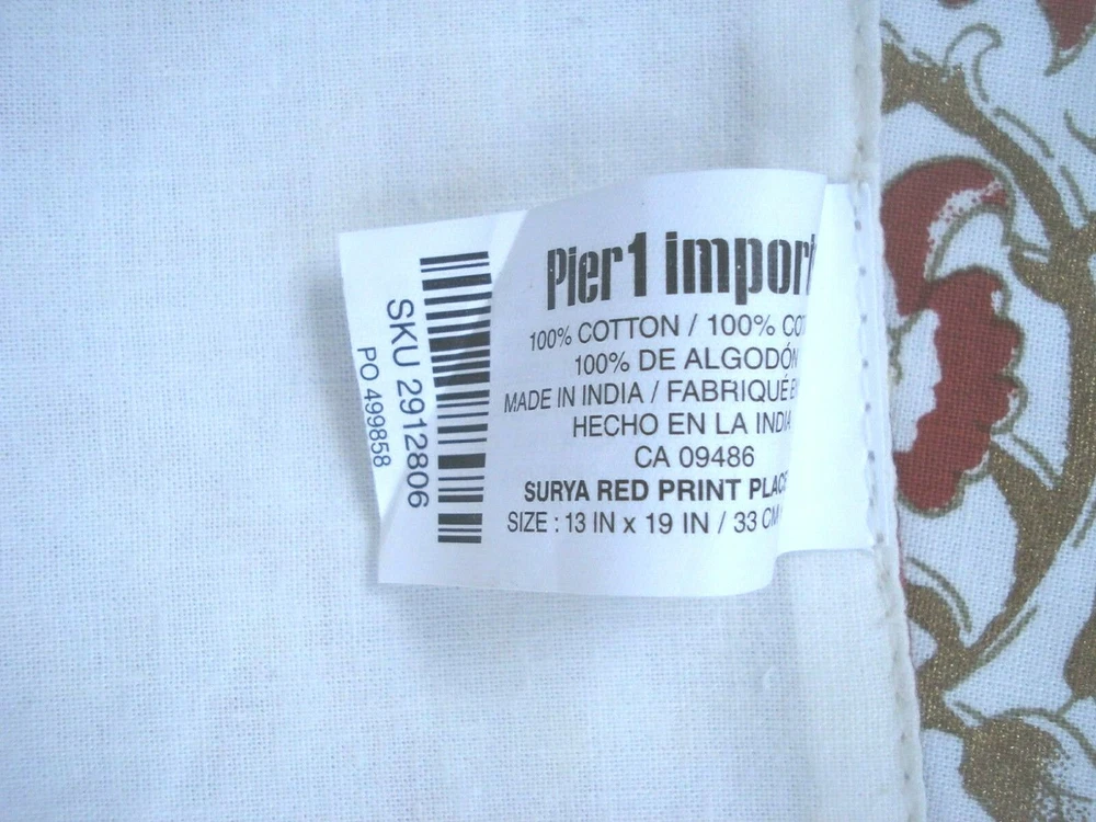 Pier 1 Imports Surya Red Print Placemats. Set of Four (4). NEW with tags. One has a small "spot" on the back. It appears to be in the making (?). I have shown it in the photos. One is missing the brand tag. All items come from a smoke free, pet friendly home. I try to describe each item accurately. If I should make a mistake, please know it was an honest mistake and not intentional. Before leaving negative feedback, contact me and I will work to correct it. If you are not satisfied with your purchase you can return the item and I will refund your purchase price. ***Payment expected within three (3) days.***