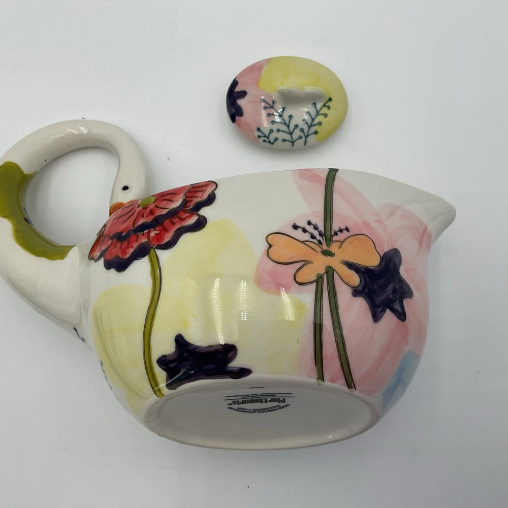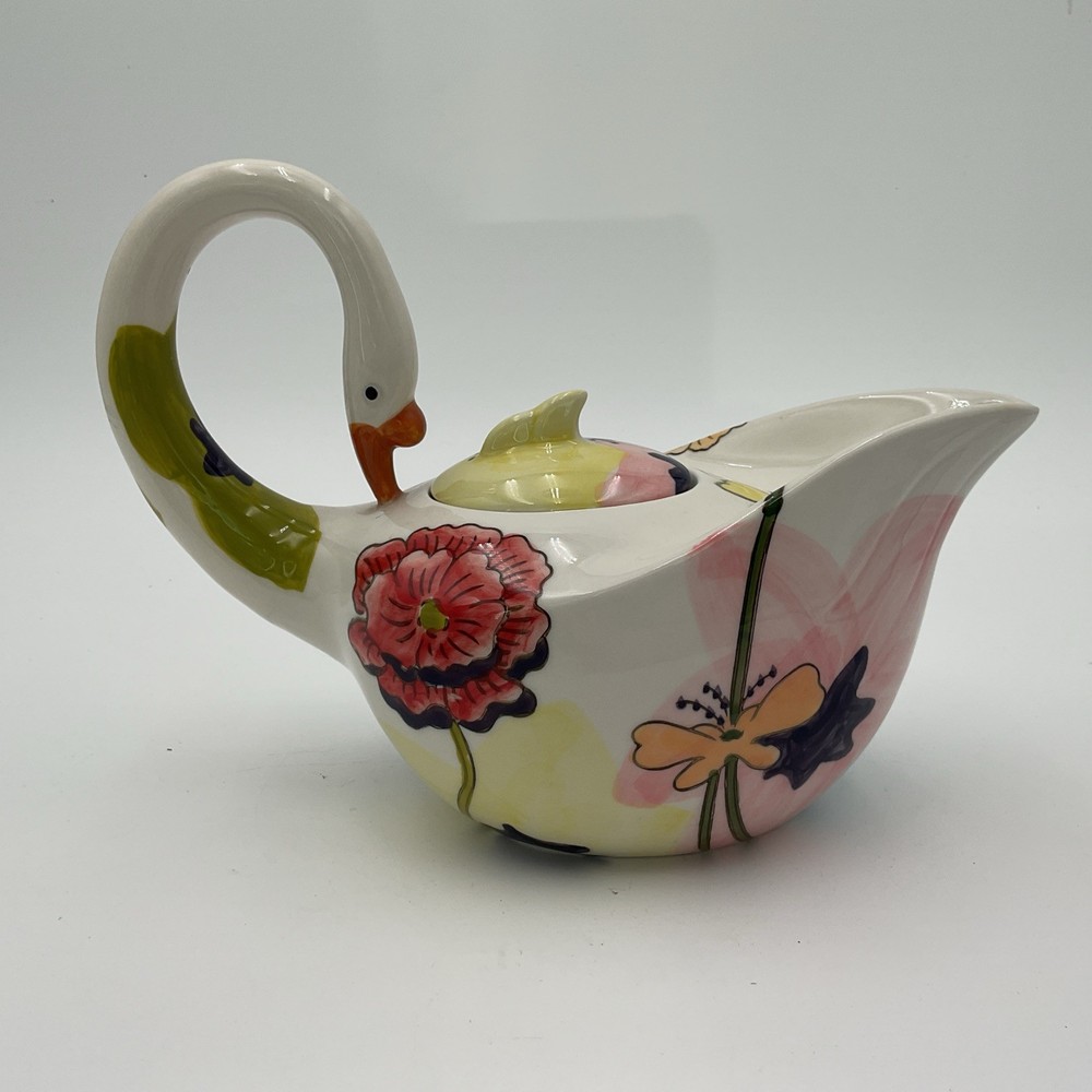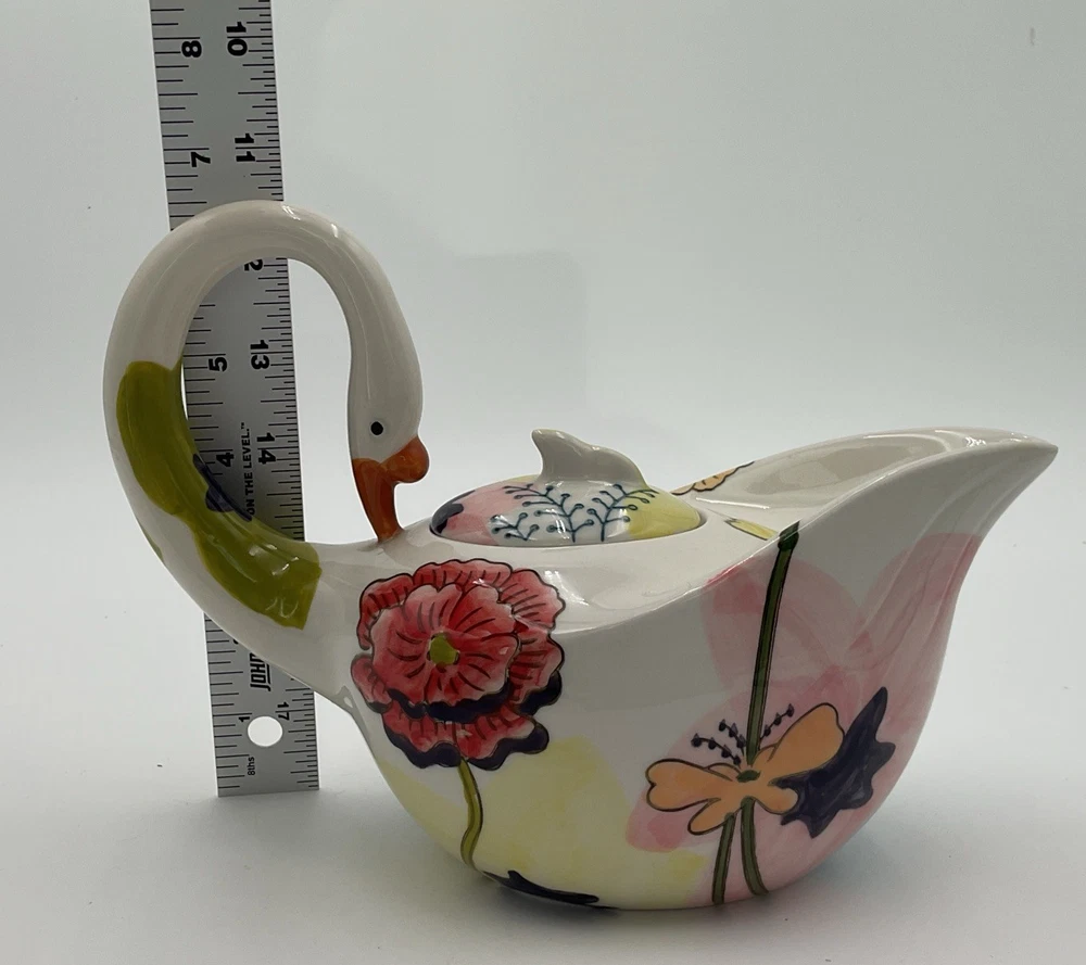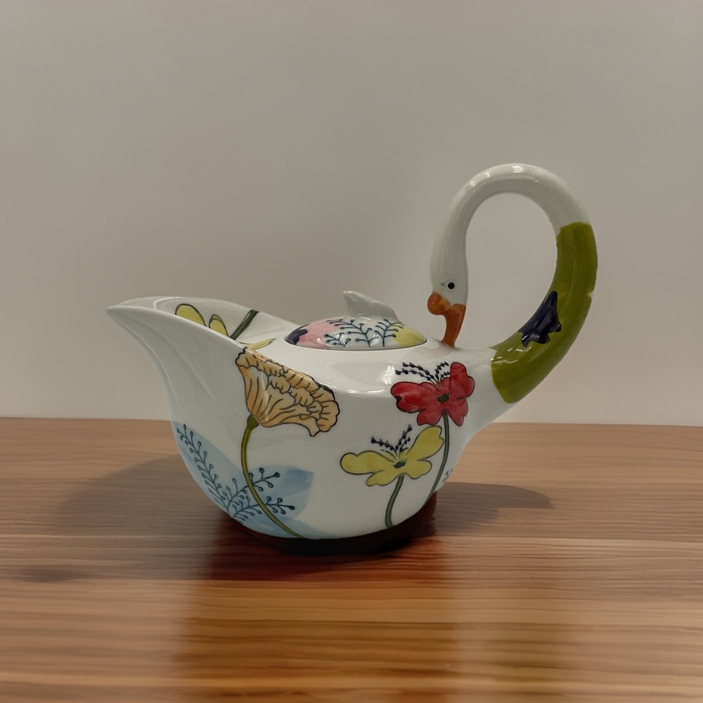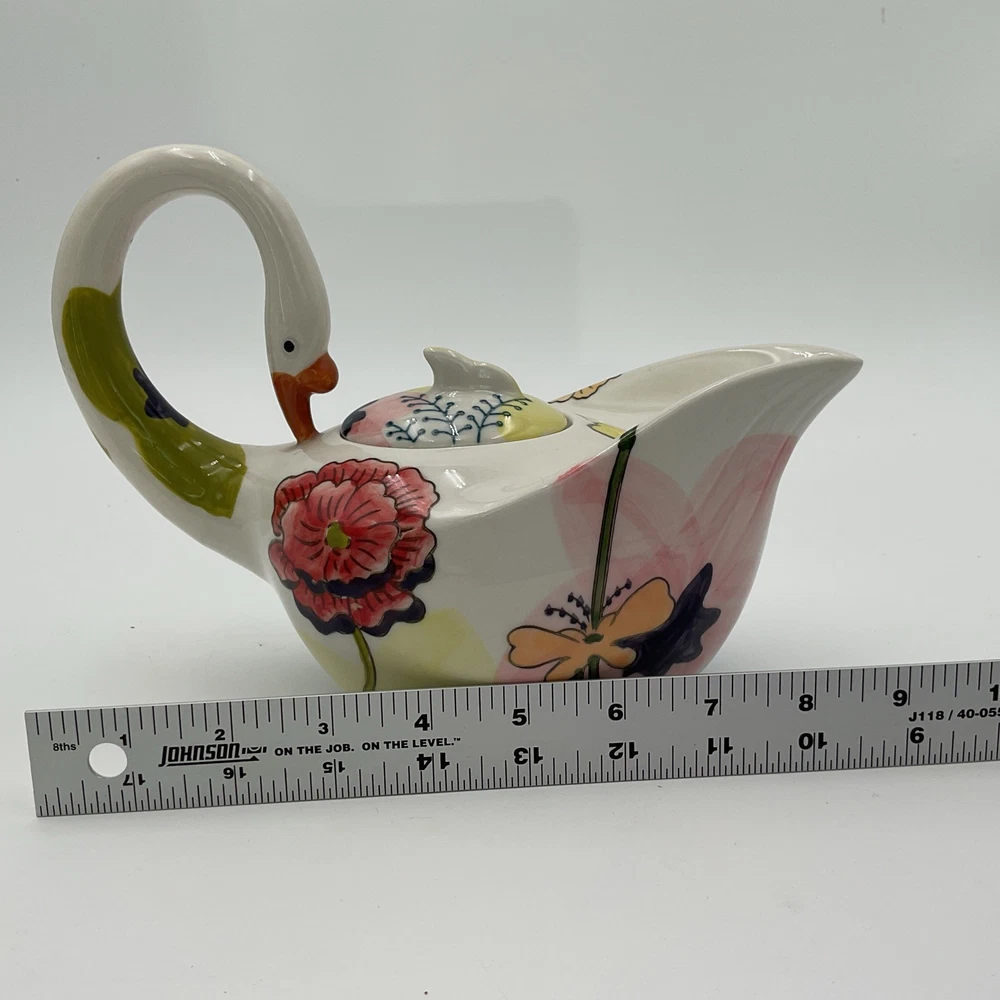 Elevate your tea experience with the Pier 1 Imports Swan Floral Ceramic Teapot. This medium-sized teapot features a stunning hand-painted floral design, infusing a touch of elegance into any setting. Its swan shape and single compartment design make it a distinctive piece for serving on any occasion. Crafted from high-quality ceramic, the teapot is both dishwasher and microwave safe, ensuring durability and convenience. Measuring at 9.5 inches in length and 6 inches in height, with a colorful multicolor finish, it's a perfect blend of functionality and style. Complete with a matching lid, this original, contemporary-styled teapot is a must-have for any food and drink enthusiast.