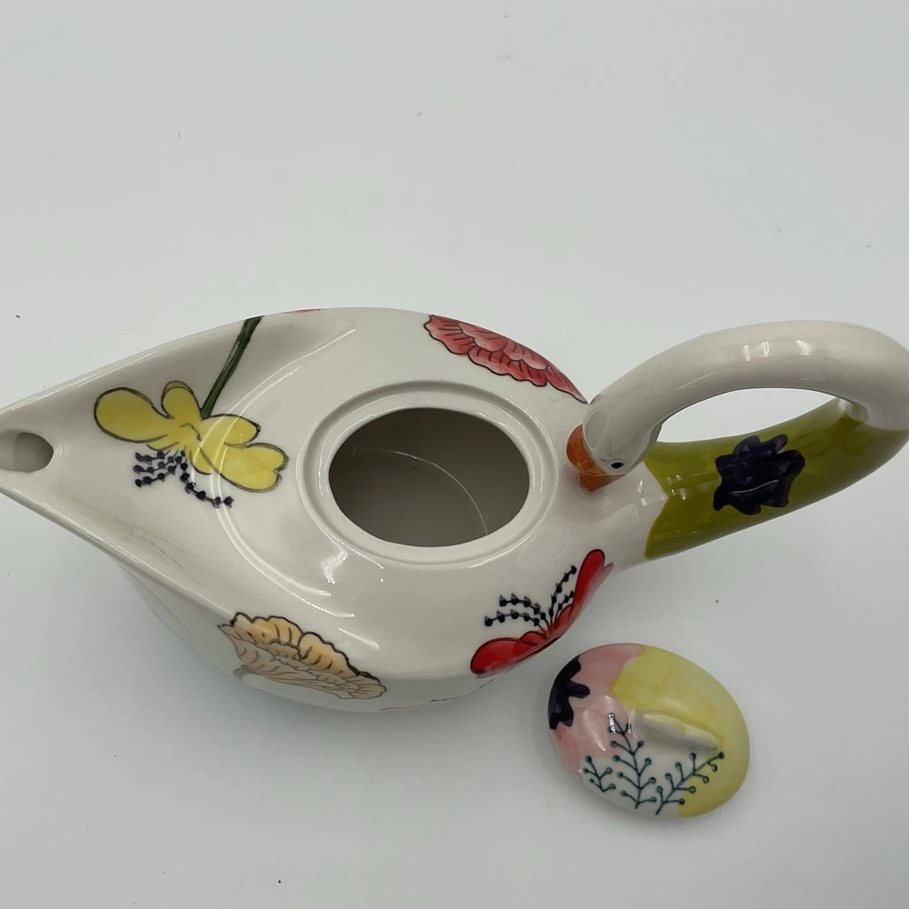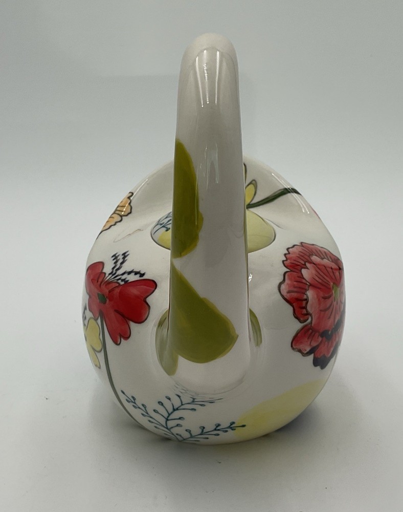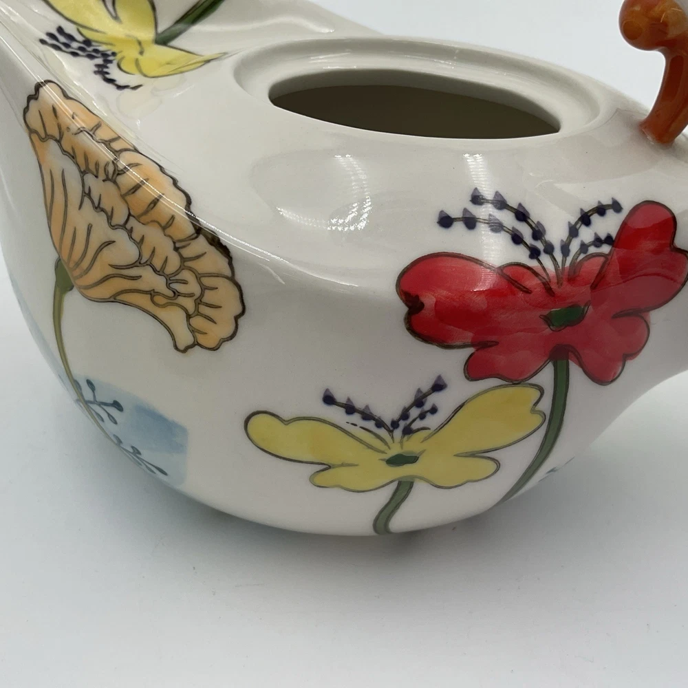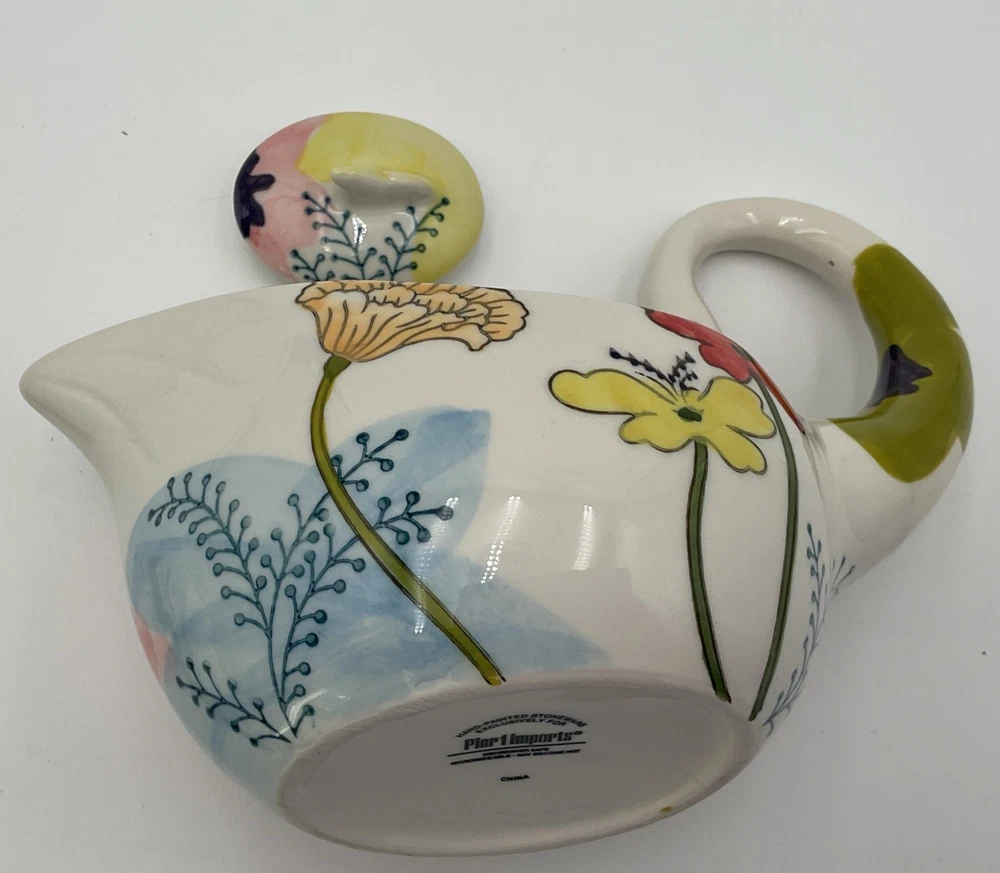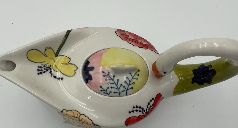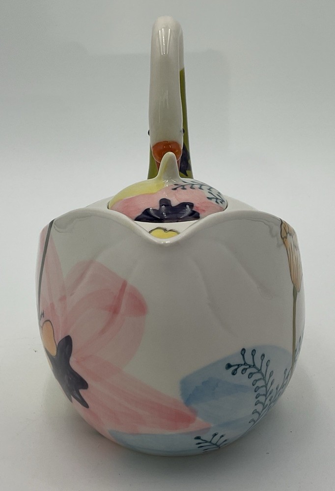 Elevate your tea experience with the Pier 1 Imports Swan Floral Ceramic Teapot. This medium-sized teapot features a stunning hand-painted floral design, infusing a touch of elegance into any setting. Its swan shape and single compartment design make it a distinctive piece for serving on any occasion. Crafted from high-quality ceramic, the teapot is both dishwasher and microwave safe, ensuring durability and convenience. Measuring at 9.5 inches in length and 6 inches in height, with a colorful multicolor finish, it's a perfect blend of functionality and style. Complete with a matching lid, this original, contemporary-styled teapot is a must-have for any food and drink enthusiast.