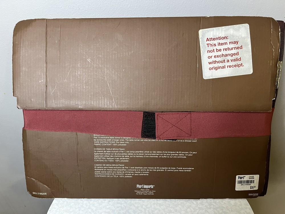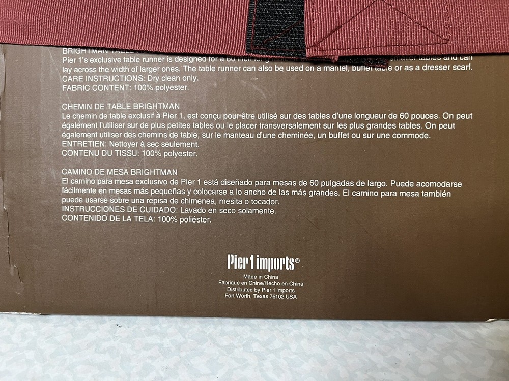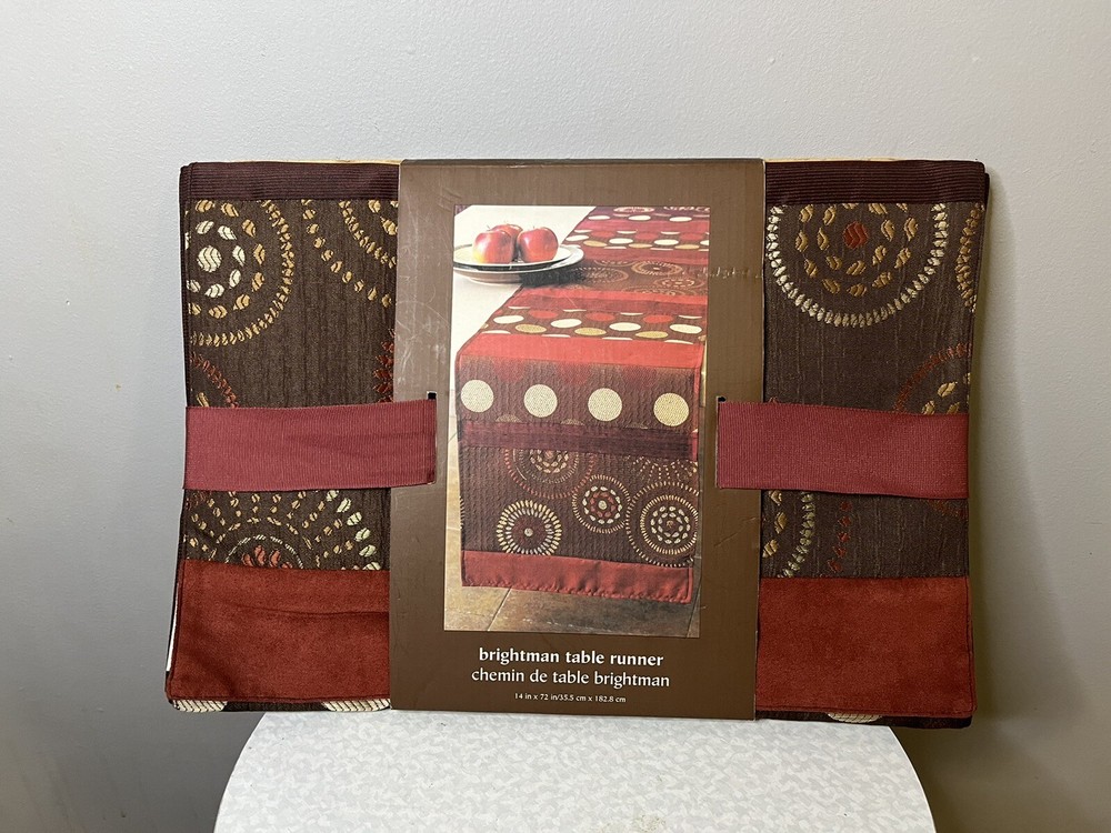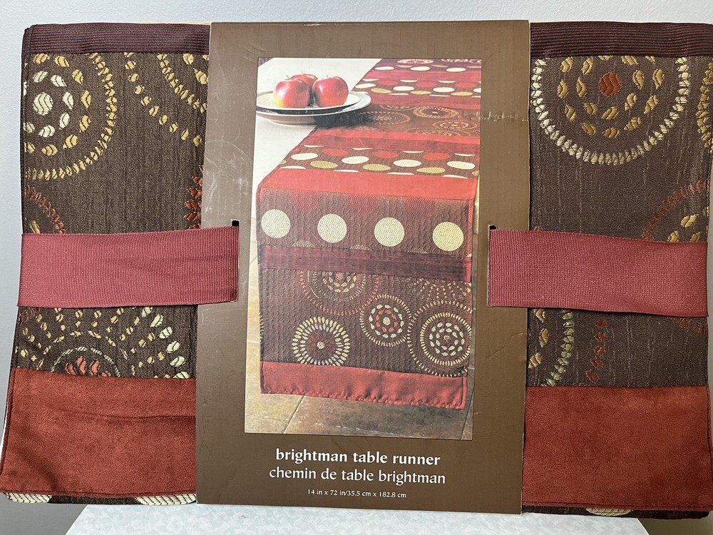 Introducing a stunning table runner from Pier 1 Imports, featuring a beautiful circle design in warm autumn colors. Measuring 13\"x 72\", this multipurpose runner is perfect for adding a touch of elegance to any dining table or console. Crafted from a blend of polyester, rayon, and metallic materials, this runner is sure to impress your guests. The floral pattern and fall theme add a charming touch to any occasion, and the rectangular shape makes it versatile for any table size. Elevate your home decor with this exquisite piece from Pier 1, and enjoy the compliments that come along with it.