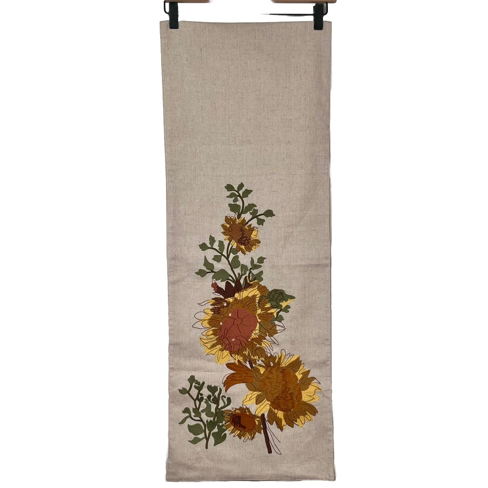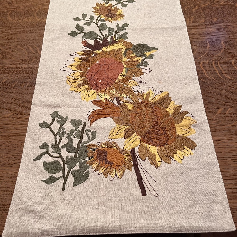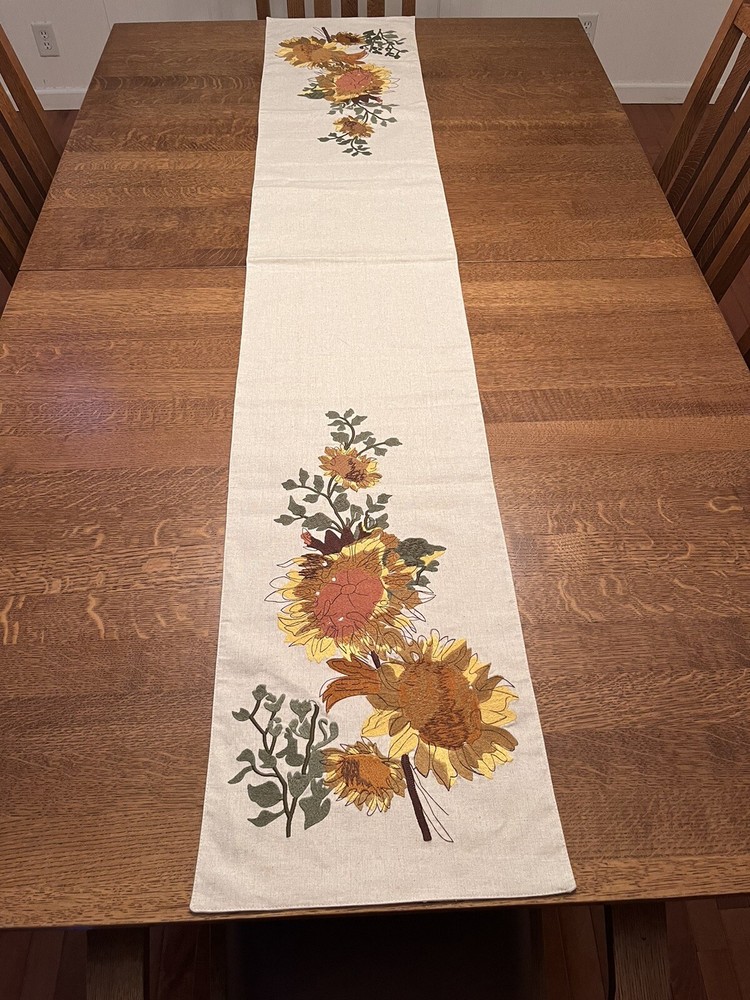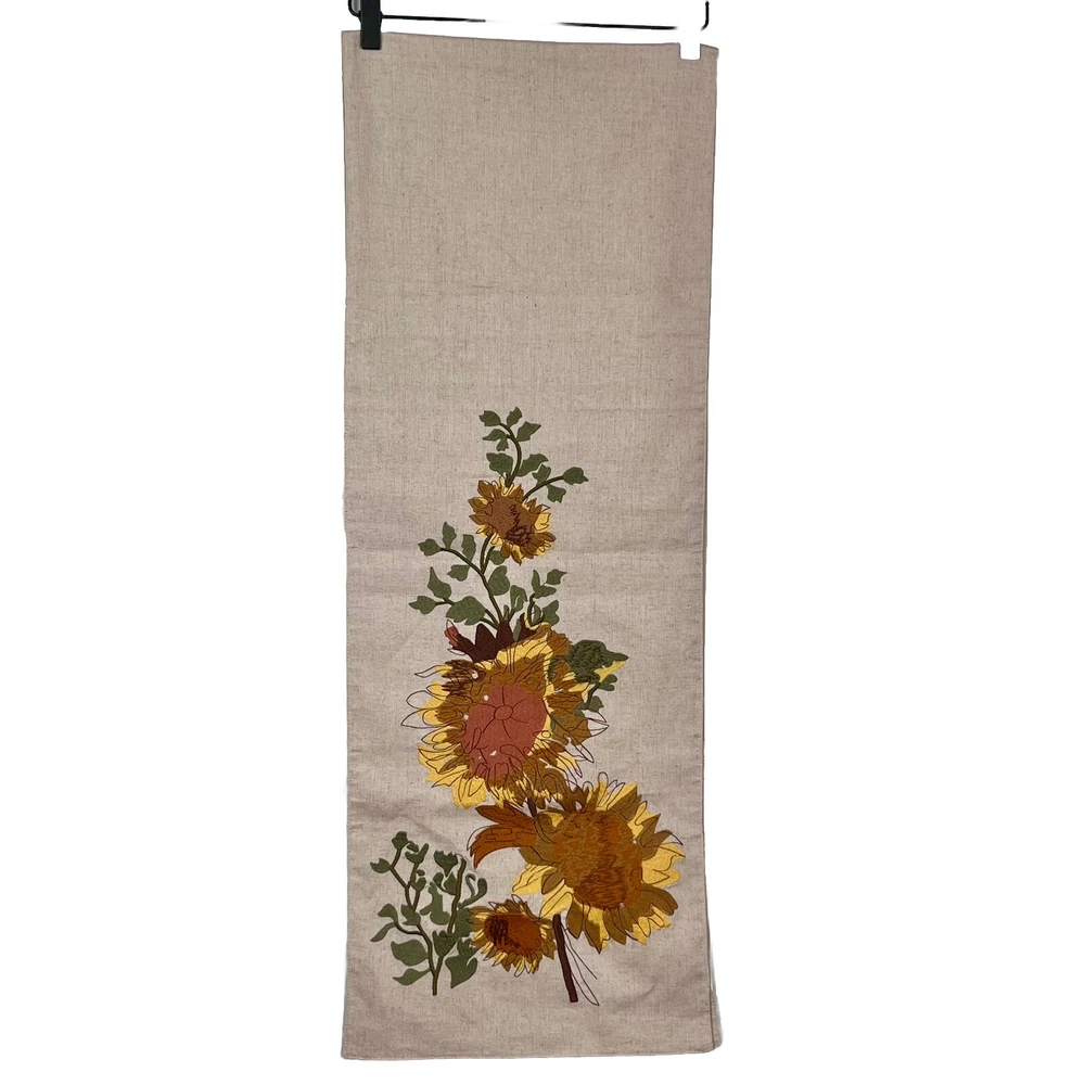Add some charm to your dining table or party with this beautiful Pier 1 Imports table runner. The floral sunflower embroidery on linen gives a farmhouse style to your decor. Measuring 72" x 13", this table runner is perfect for various occasions like Mother's Day, baby shower, new home, birthday, labor day, and multipurpose use. The beige color of the table runner with fall theme matches any decor. Made of rayon, linen, and cotton, it is durable and adds texture to your table setting. This table runner is a must-have for any party or family dinner. Preowned condition very good with a faint spot as highlighted in the photo. Smoke free.