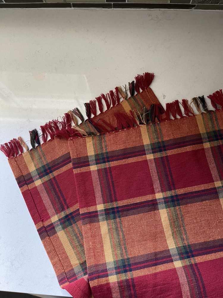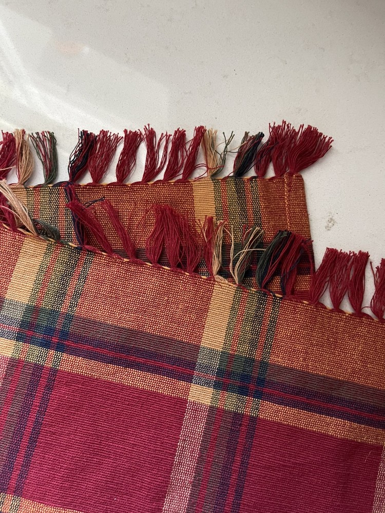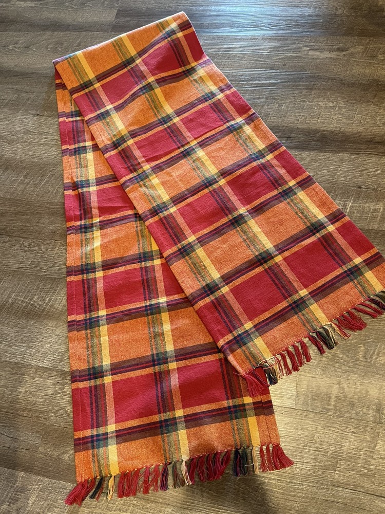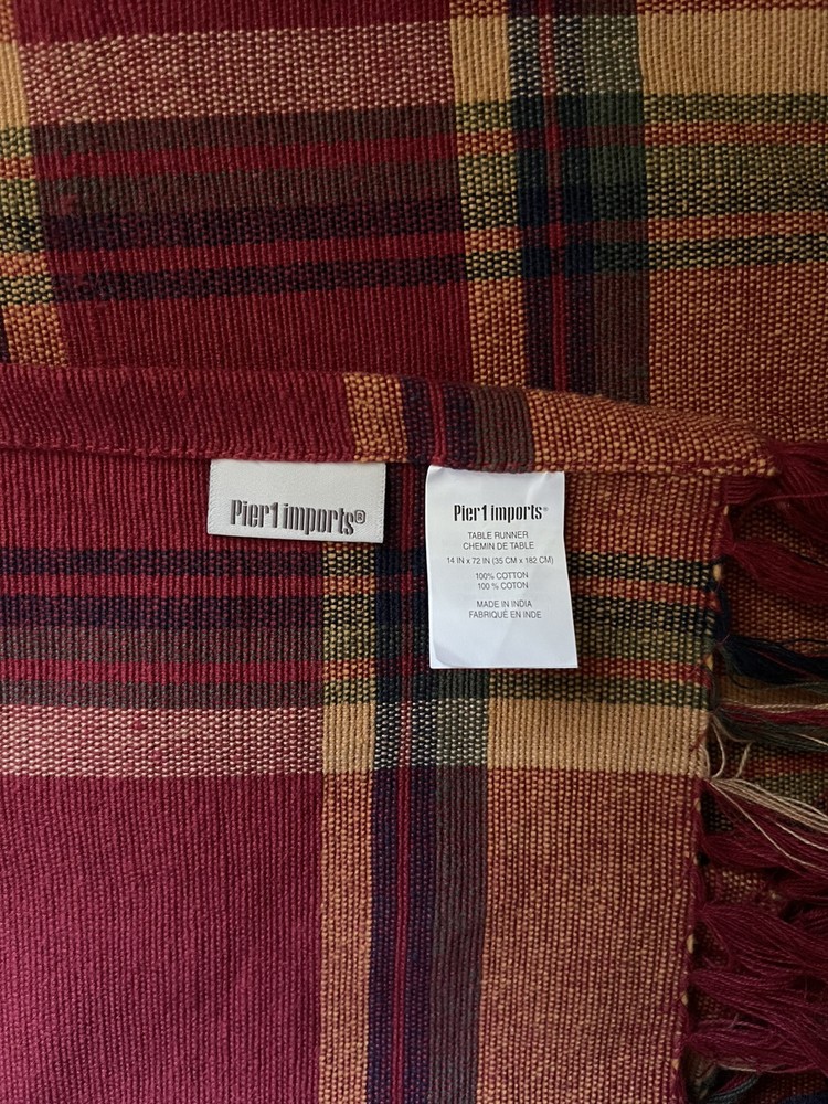 Add a touch of traditional charm to your table settings with this Pier 1 Imports Plaid Table Runner. The vibrant orange hue complements any fall-themed decor, while the classic plaid pattern brings a warm, inviting feel to your dining experience. At 72 inches in length and 14 inches in width, this cotton table runner is perfectly sized for most dining tables. Crafted in India, this multi-purpose table runner features a fringe detail that adds a quaint, handcrafted look to its design. Whether for a cozy family dinner or a festive gathering, this table runner serves as a delightful backdrop for your tableware, enhancing the overall aesthetic of your occasion. I purchased some time ago but never used. Still stiff...