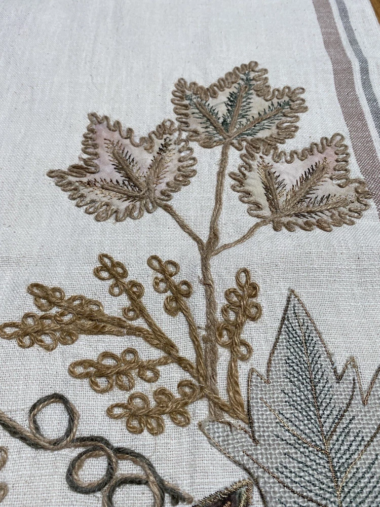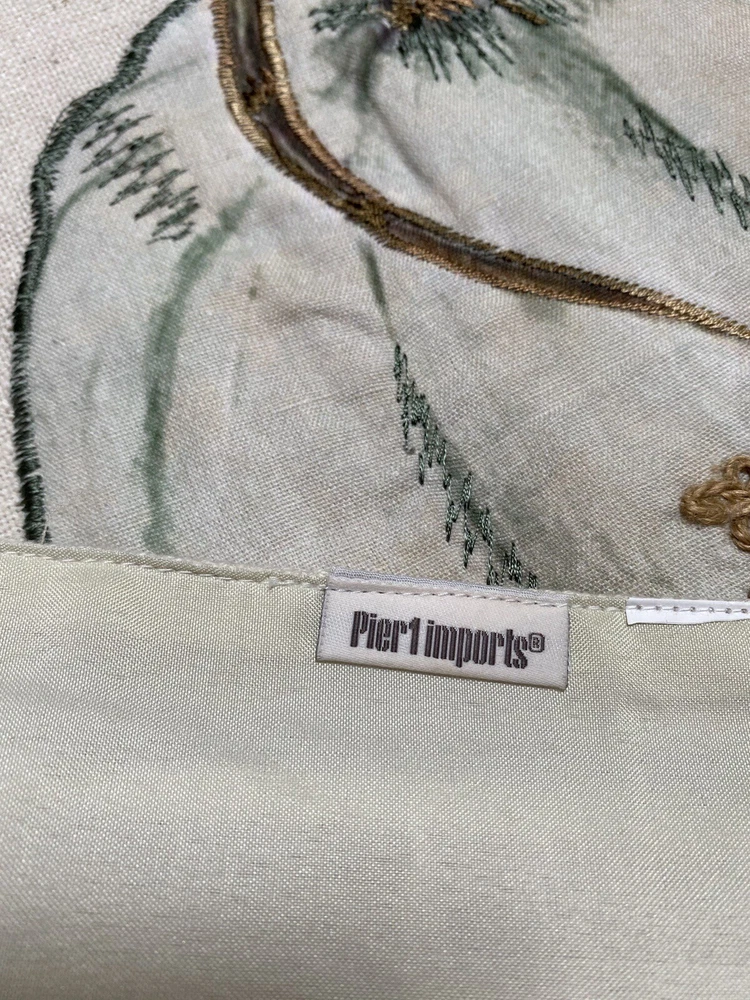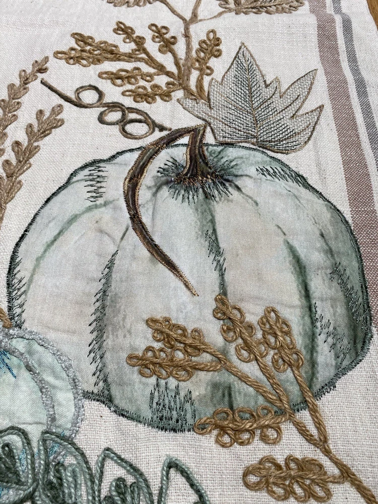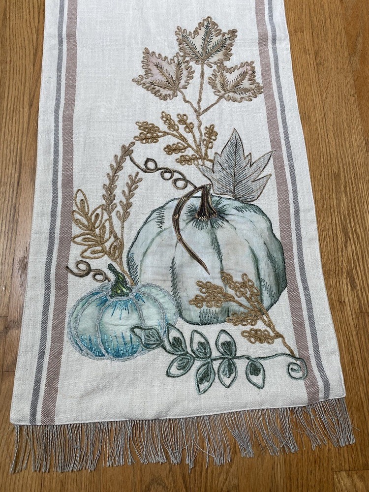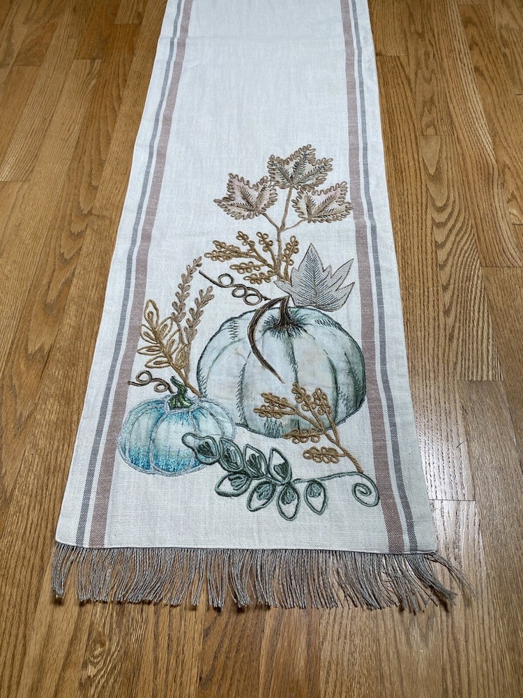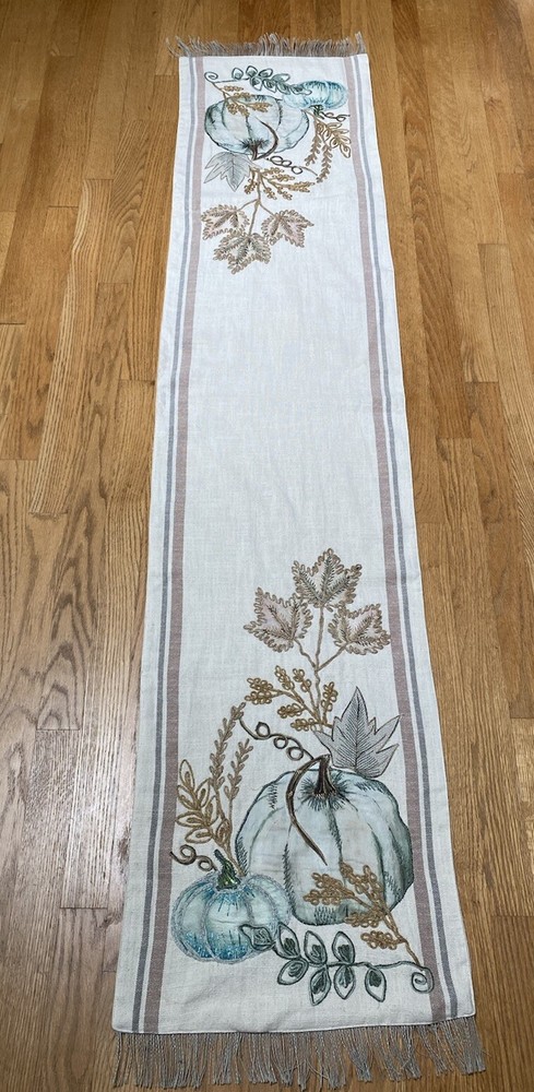 Pier 1 Imports Table Runner Fall Pumpkin Applique Jute Embroidery Fringe 75"x16" Beautiful runner with fall theme Both ends have Teal applique pumpkins with jute embroidery to add texture and interest Cream tone background color with Tan and brown stripes on the edges Fully lined There is jute fringe on both ends Condition is pristine, looks like never been used, content tag has been removed Please check pictures