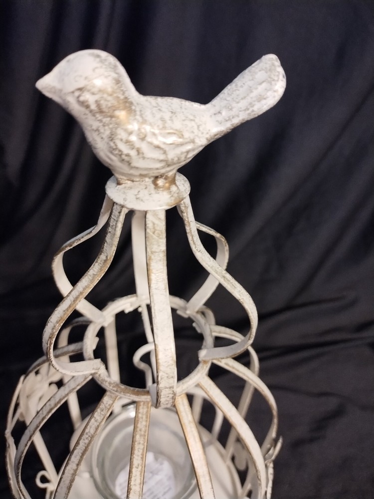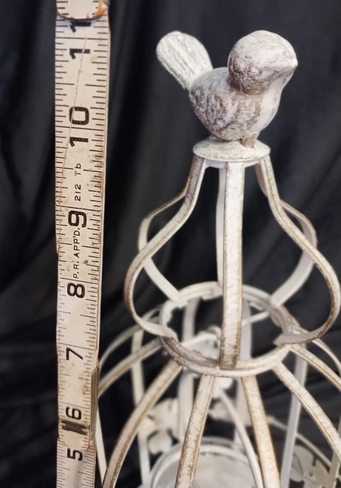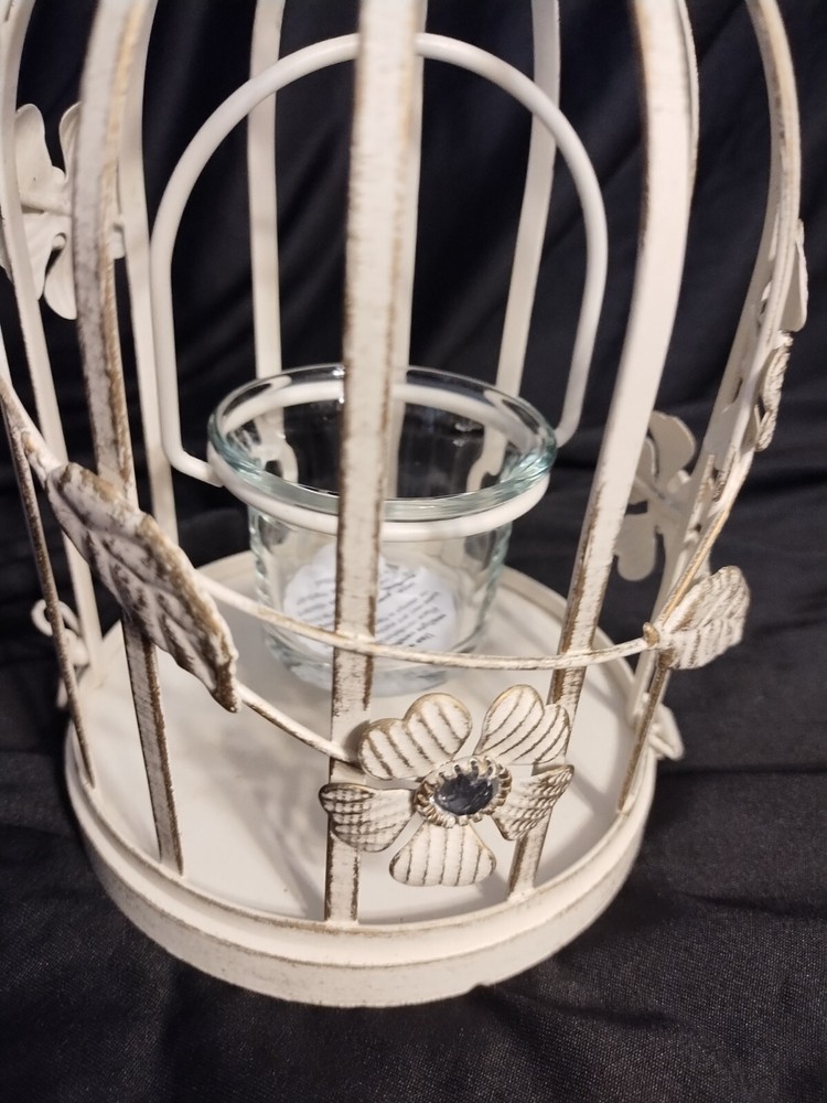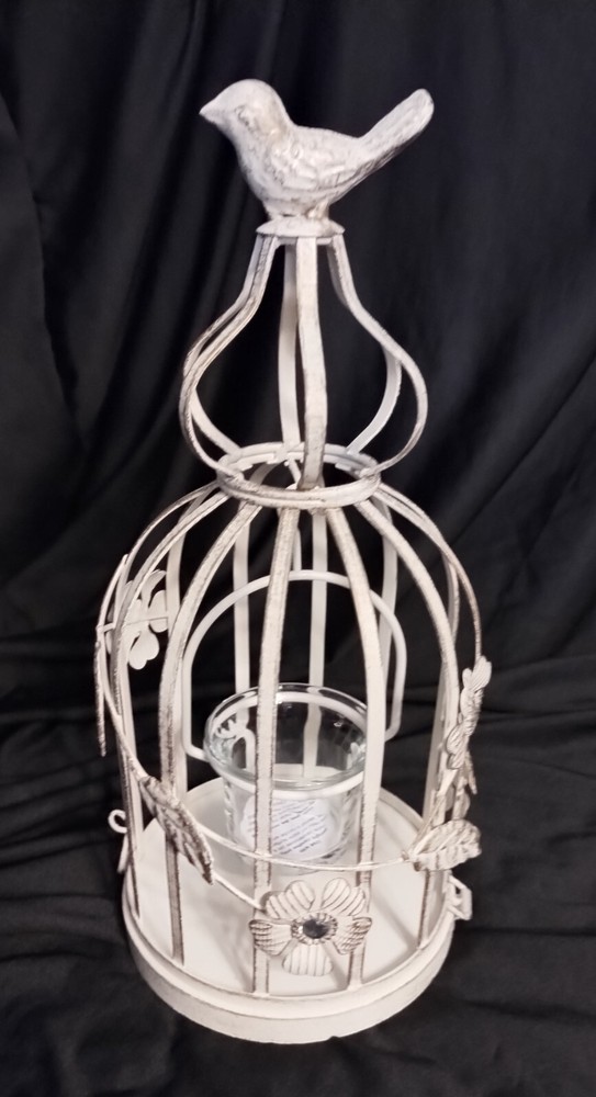 The Pier 1 Imports tabletop metal birdcage with votive candleholder exudes a rustic charm with its antique finish and white color. This medium-sized bird cage/candle holder is perfect for all occasions and can effortlessly enhance any room's decor. Made of metal, it features a clasp closure and is designed in the shape of a birdcage, adding a whimsical touch to your space. Ideal for adding a cozy and charming ambiance, this decorative piece is versatile and can be used in various settings.