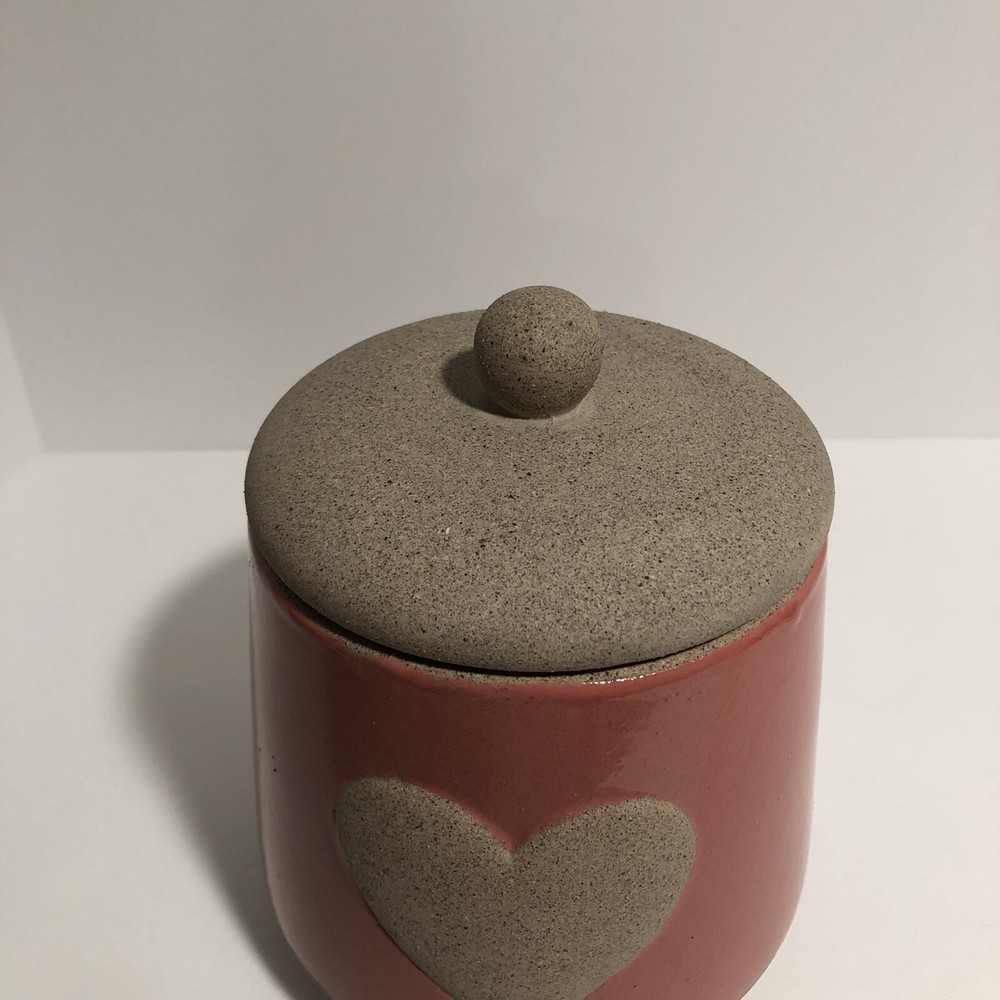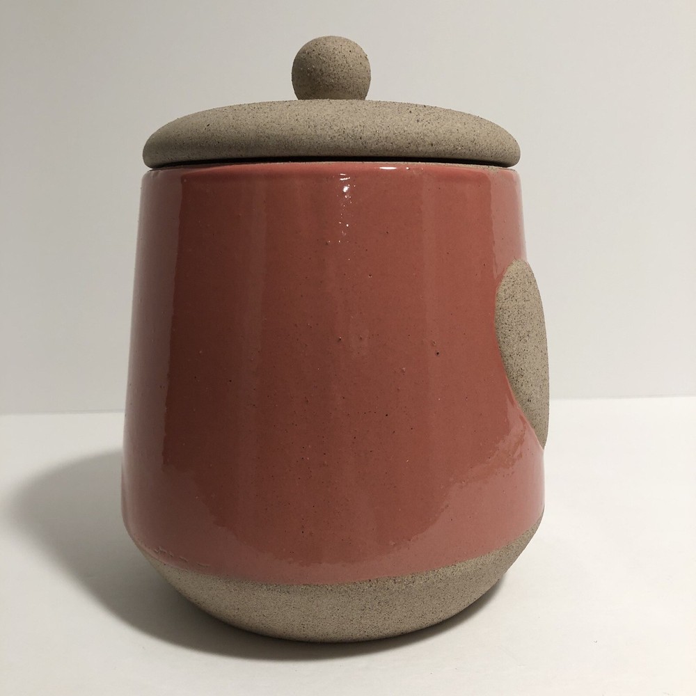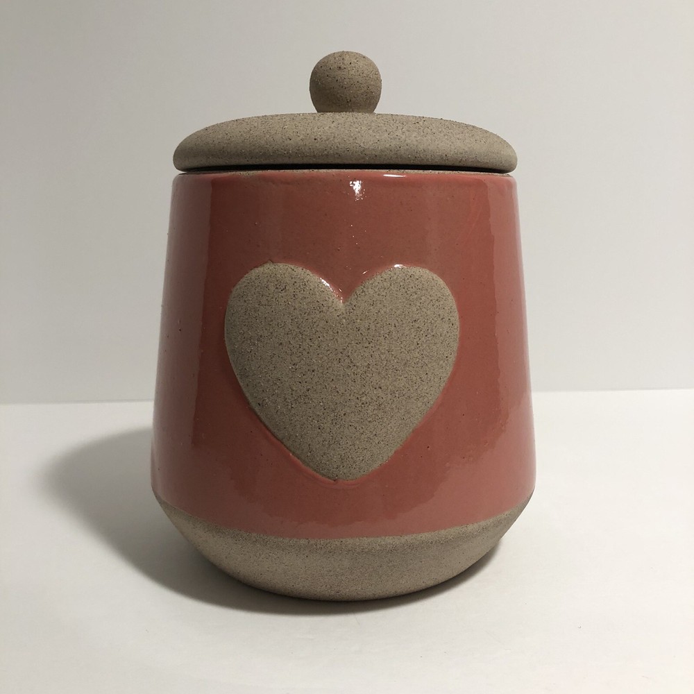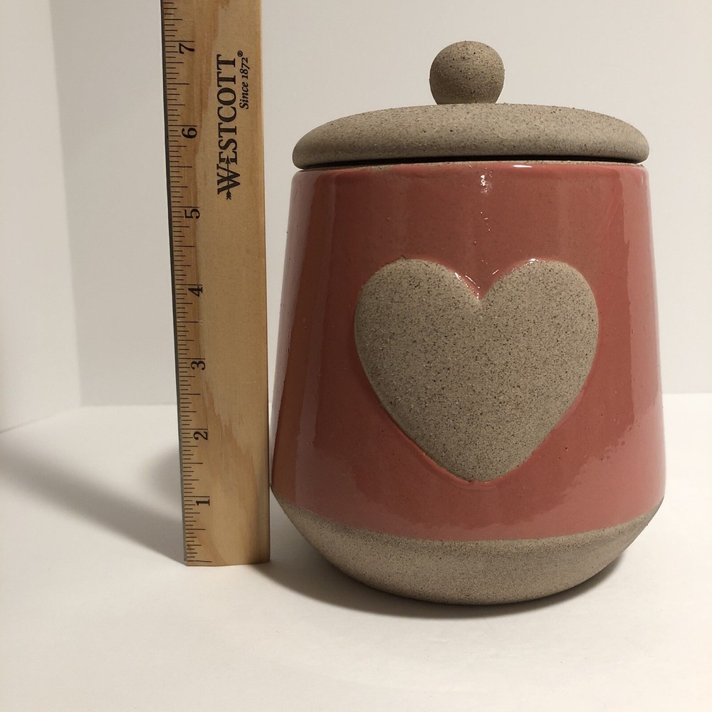 This charming candy jar from Pier 1 Imports features a textured stoneware heart design, making it a perfect addition to any Valentine's Day decor. With a medium size of 7 inches in height, it can hold a variety of sweet treats or small items. The canister is ideal for kitchen storage and organization, and can be used for more than just candy. Don't miss the chance to add this lovely and versatile piece to your collection! **** Small chip on the lid (pic 12)