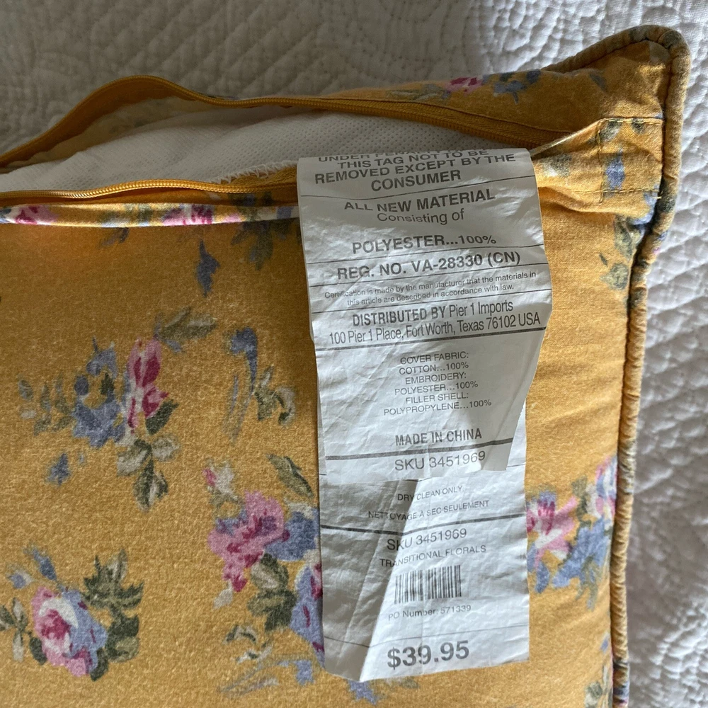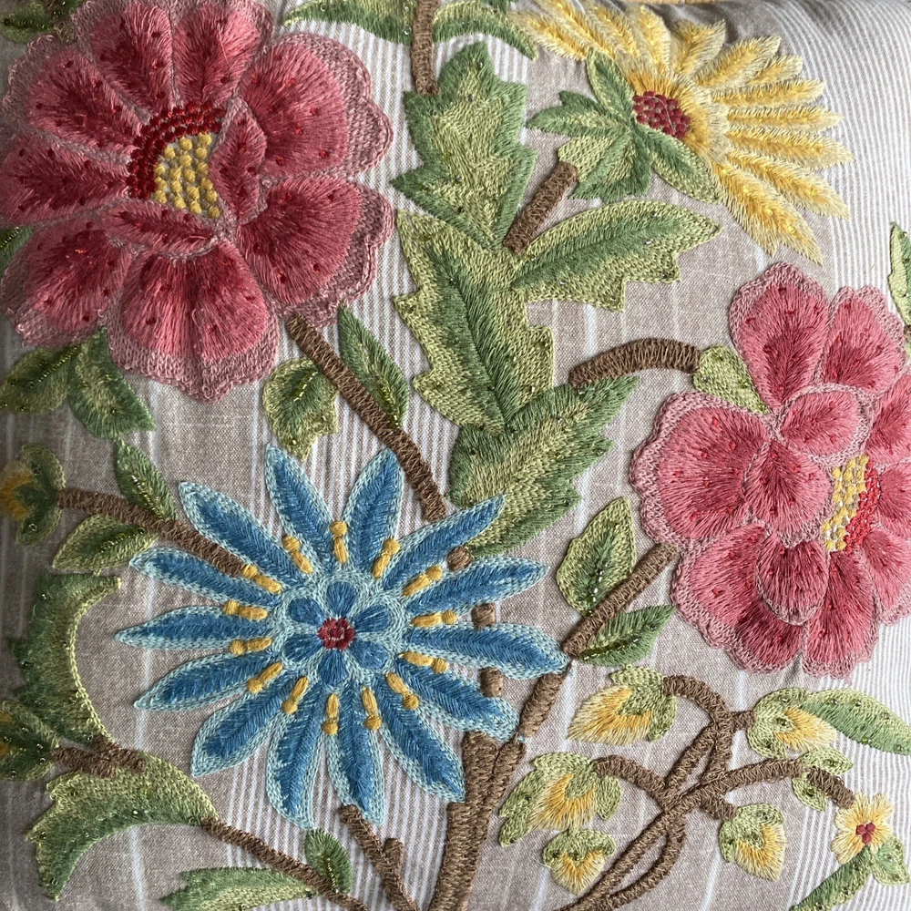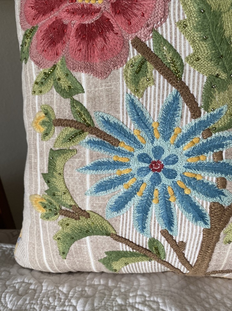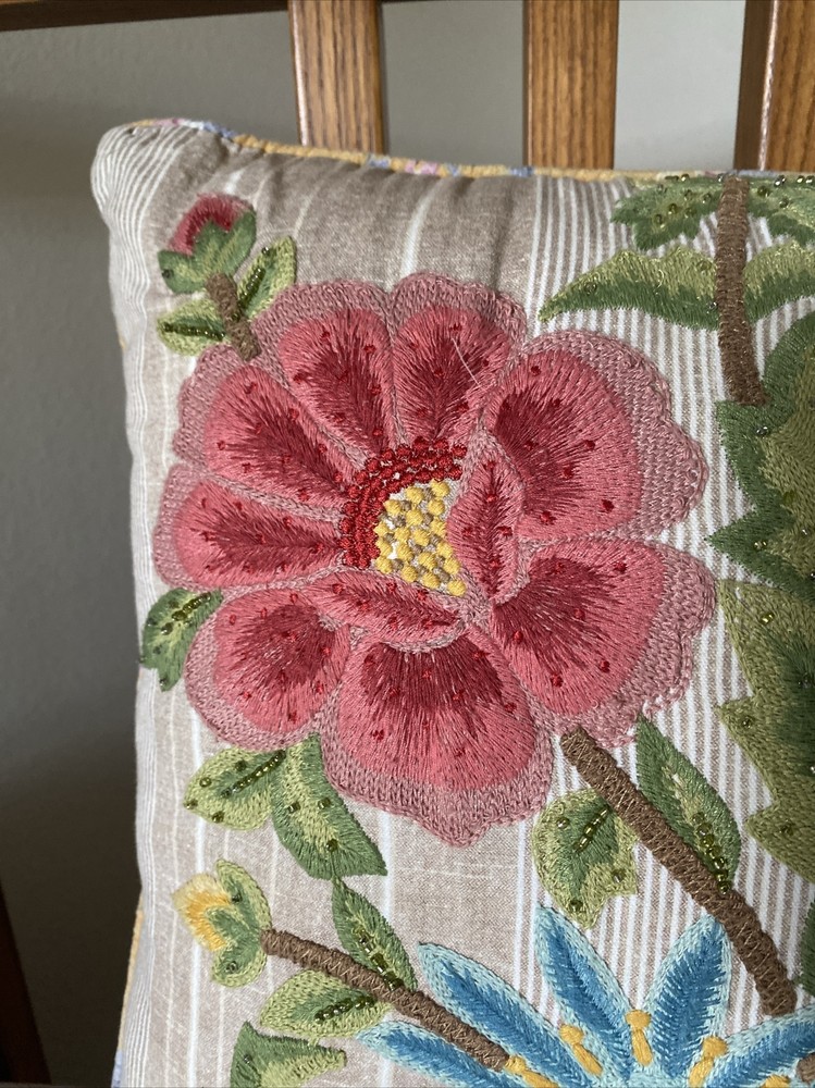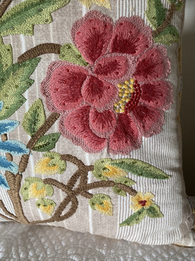 Add a touch of bohemian style to any room with this beautiful Pier 1 Imports throw pillow. The embroidered floral design with beading on a striped fabric creates a unique and eye-catching pattern. Measuring 18 x 18 inches, this square pillow is made of 100% cotton with a polypropylene fill material, ensuring both comfort and durability. Care instructions suggest dry cleaning to maintain the vibrant colors and intricate details. The zip closure adds convenience for easy removal and cleaning. This throw pillow is perfect for adding a pop of color and personality to any room, whether it's a cozy bedroom or a chic living room. In as found condition, please see all photos for condition as they are part of the description. I found no stains or tears, in good overall condition. Please feel free to contact me with any questions or concerns before purchasing thank you