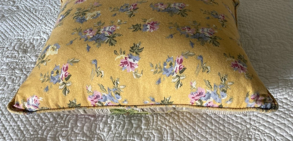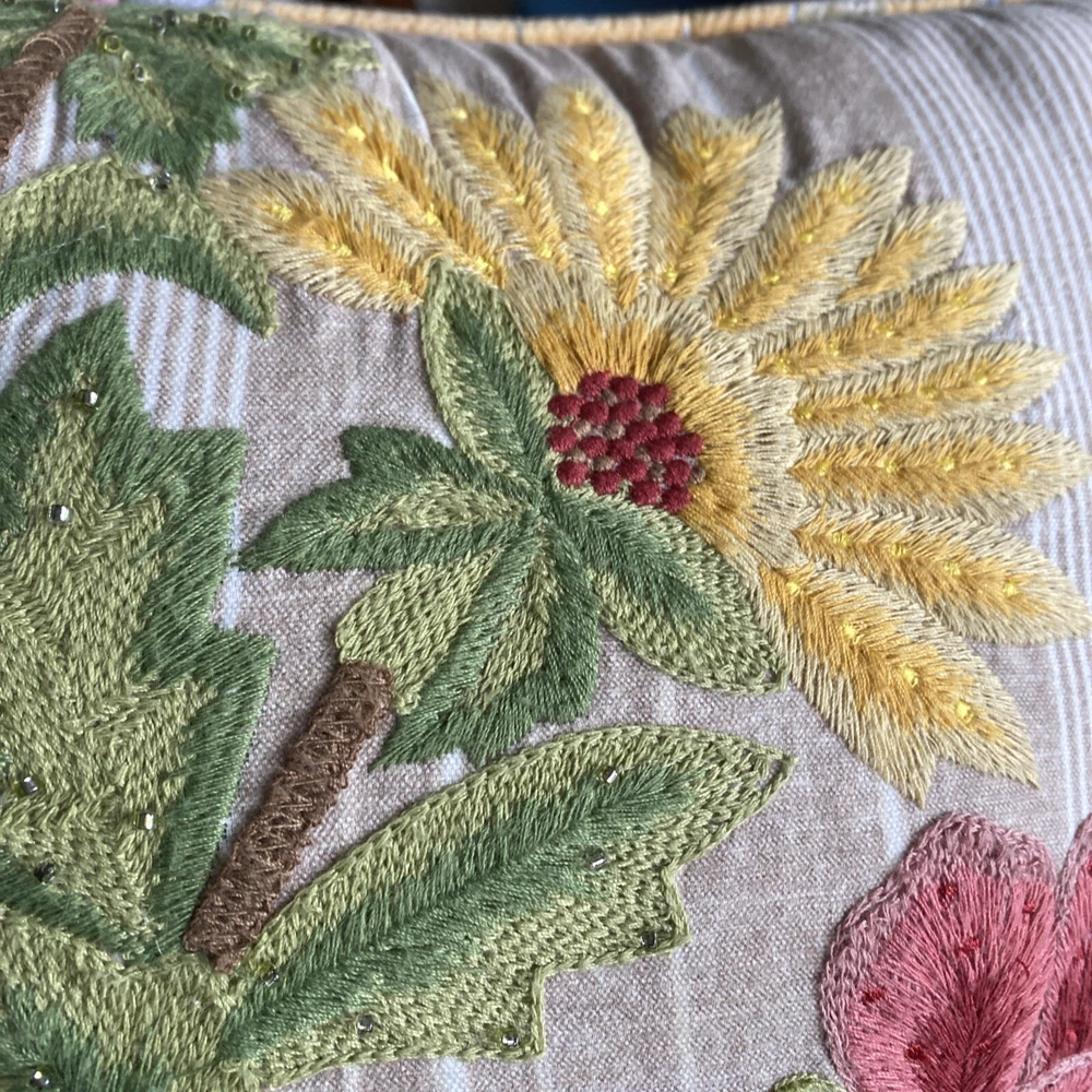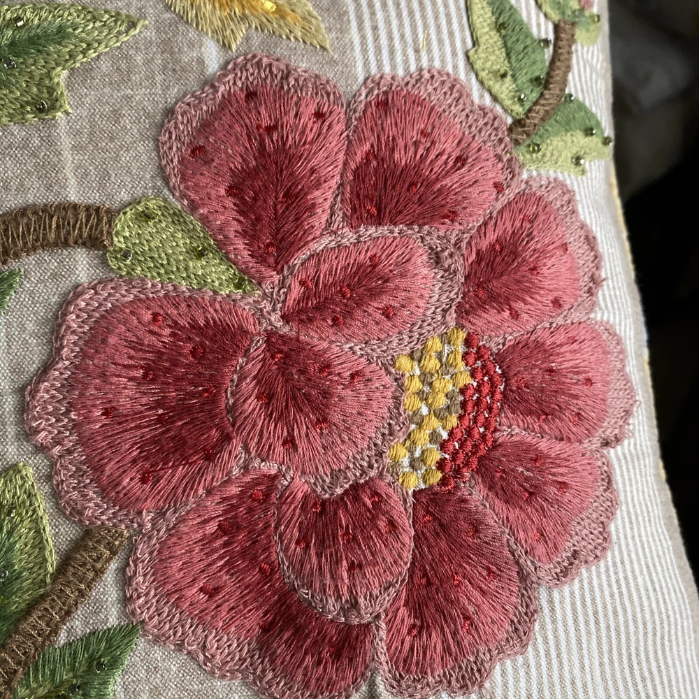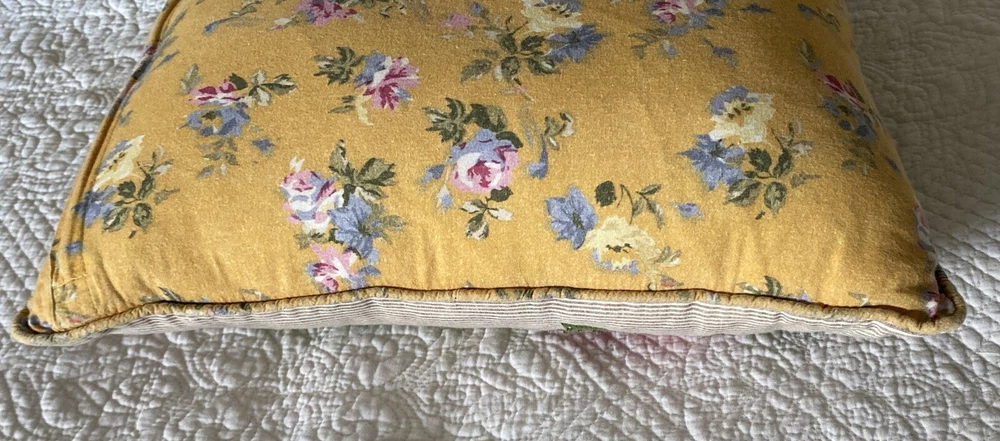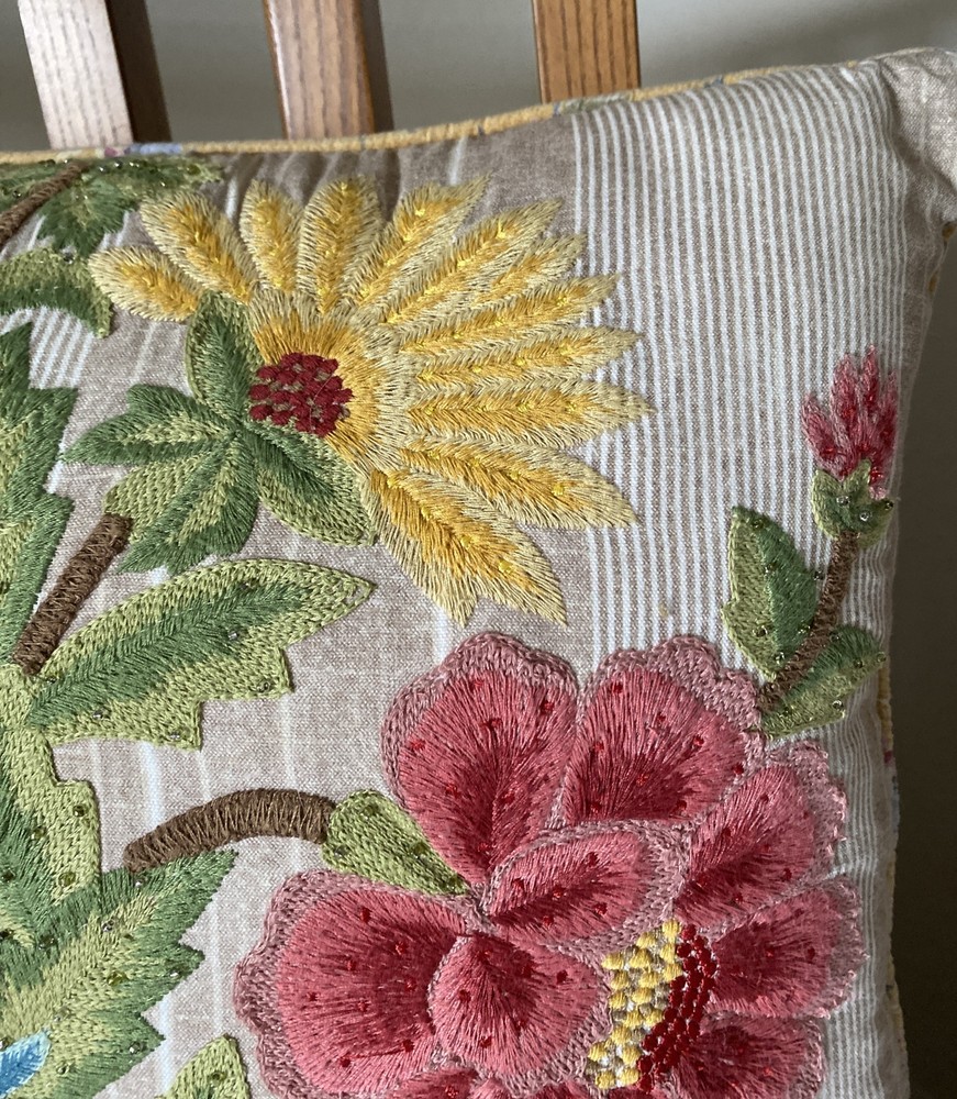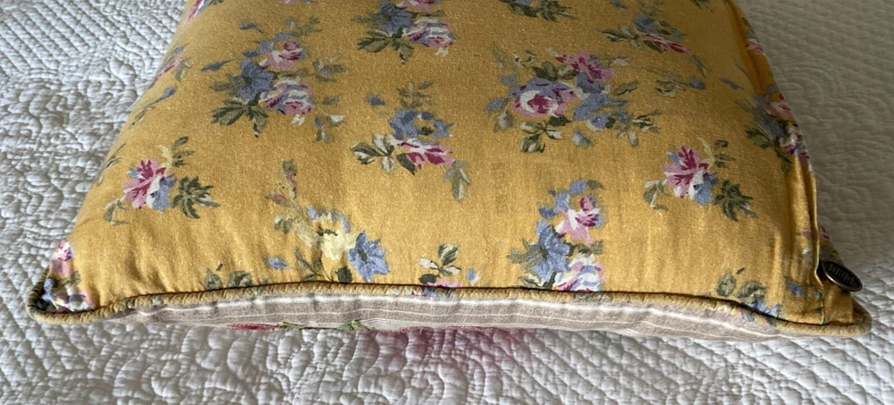 Add a touch of bohemian style to any room with this beautiful Pier 1 Imports throw pillow. The embroidered floral design with beading on a striped fabric creates a unique and eye-catching pattern. Measuring 18 x 18 inches, this square pillow is made of 100% cotton with a polypropylene fill material, ensuring both comfort and durability. Care instructions suggest dry cleaning to maintain the vibrant colors and intricate details. The zip closure adds convenience for easy removal and cleaning. This throw pillow is perfect for adding a pop of color and personality to any room, whether it's a cozy bedroom or a chic living room. In as found condition, please see all photos for condition as they are part of the description. I found no stains or tears, in good overall condition. Please feel free to contact me with any questions or concerns before purchasing thank you