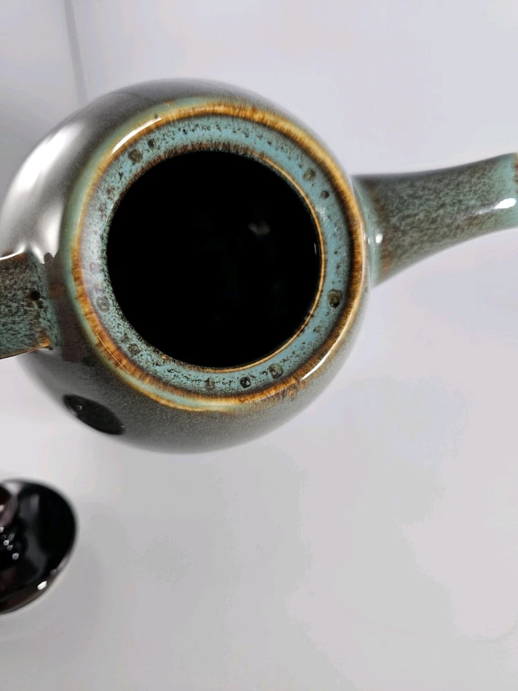 Pier 1 Imports Tranquil Blue Green Teapot Abstract Design Speckled . Height 7", spout to handle 9" pot diameter 4.5" The pot is preloved and in excellent condition. No chips or cracks....