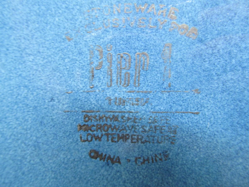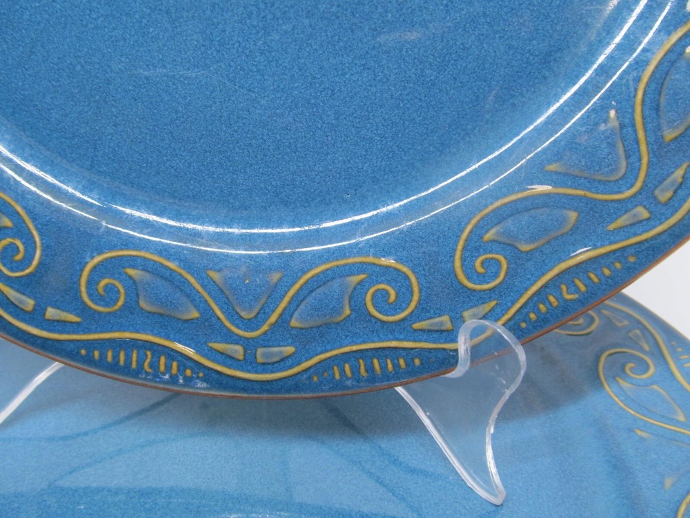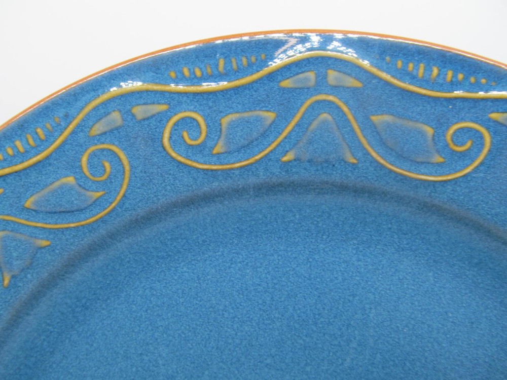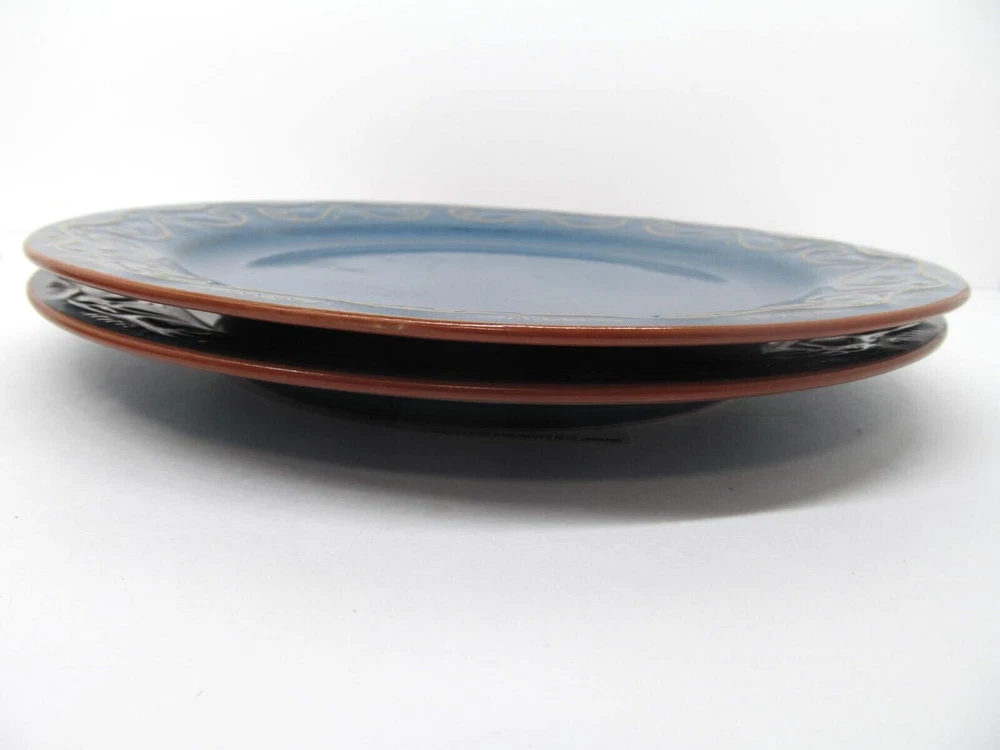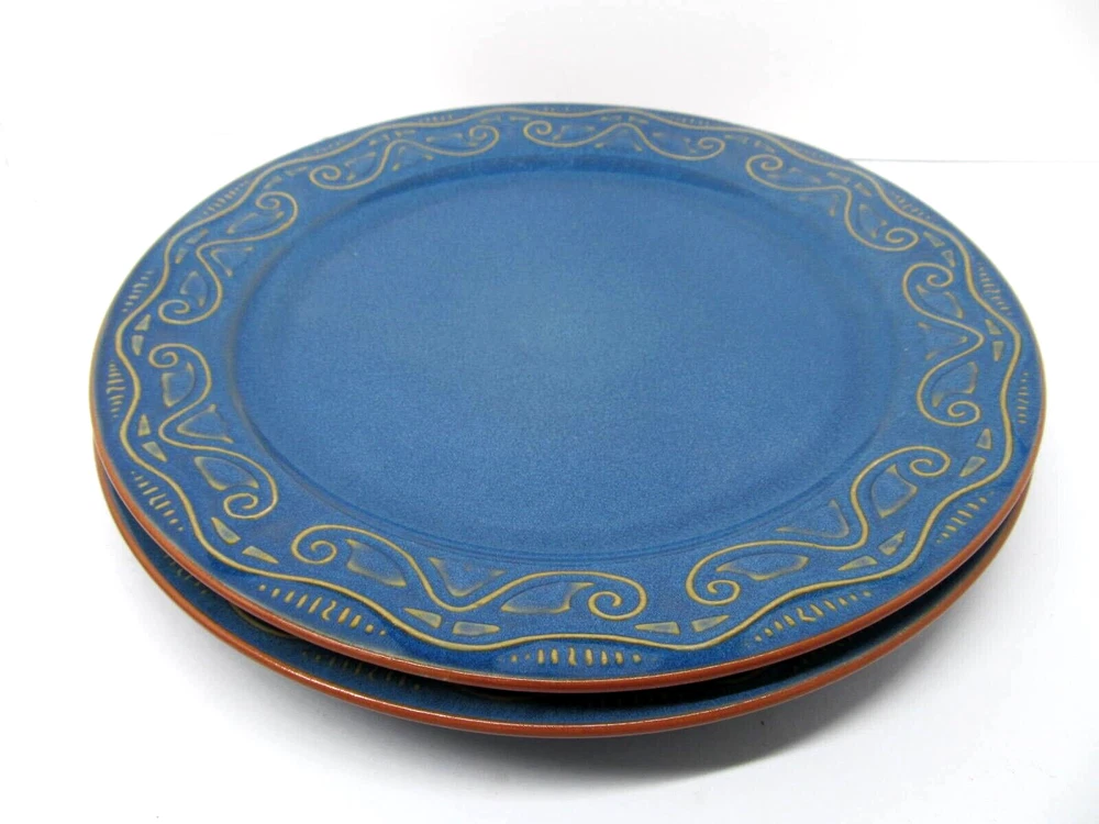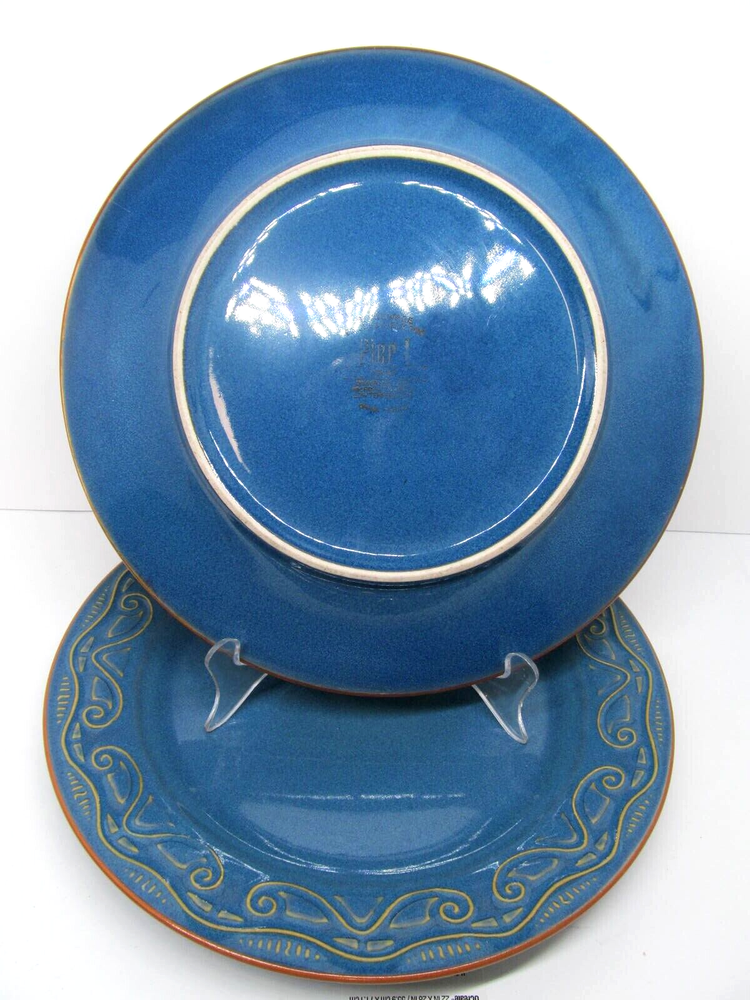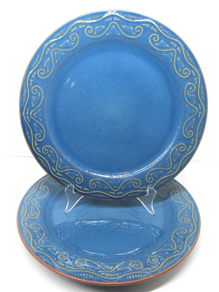 Pier 1 Imports Tunisia Set Of 2 Tan Scrolls On Blue 10 3/4" Dinner Plates You Will be Getting 2 Dinner Plates In Good Used Condition. No Issues. Does Have Light Scratches From Previous Use. They Will Be Wrapped Carefully And Fully Insured. PB451