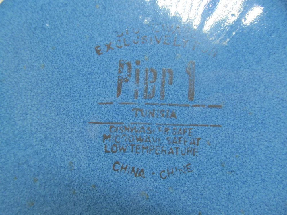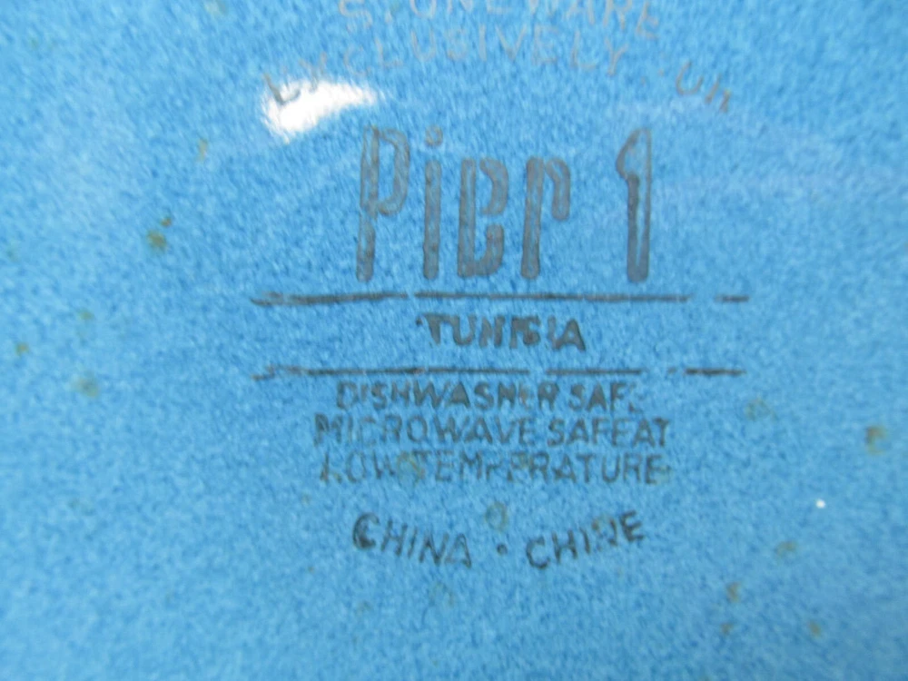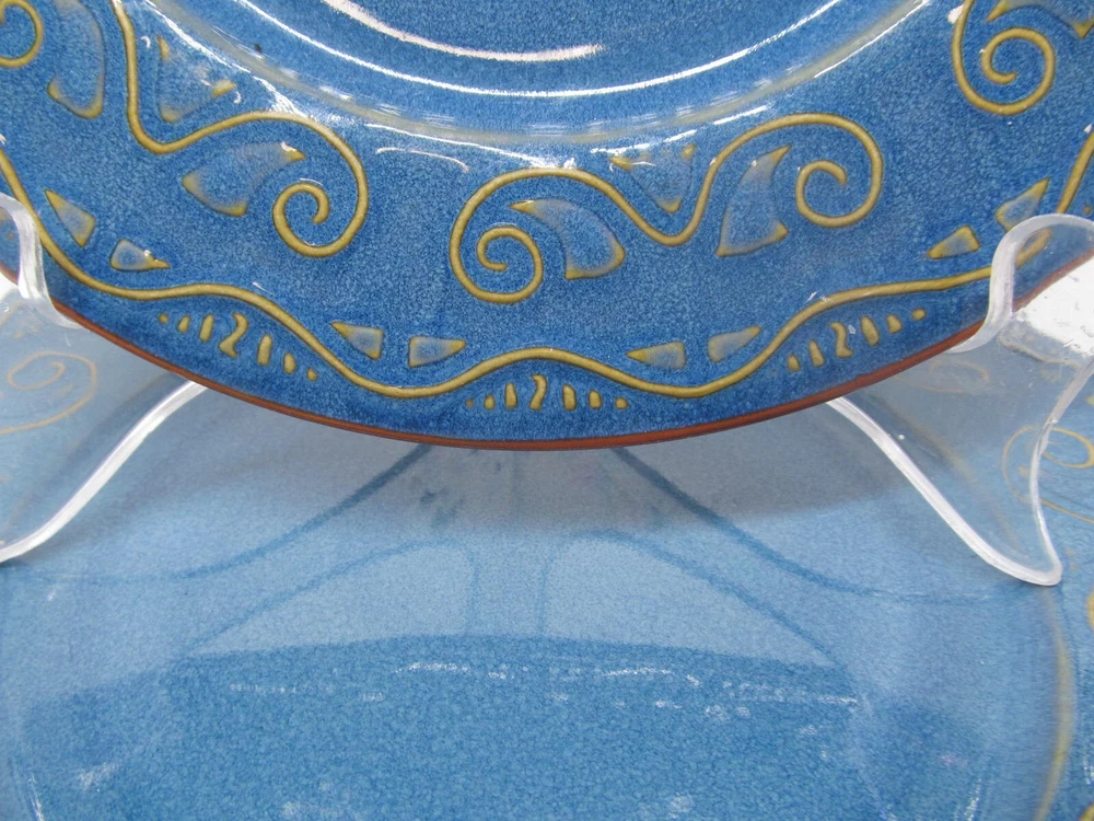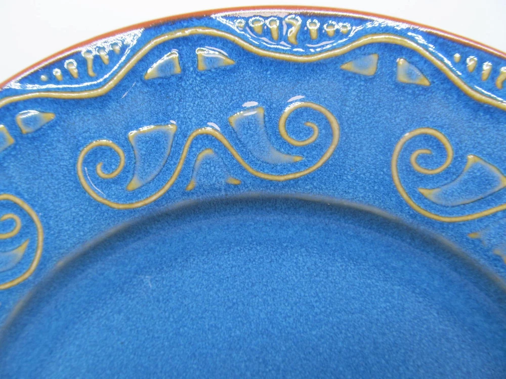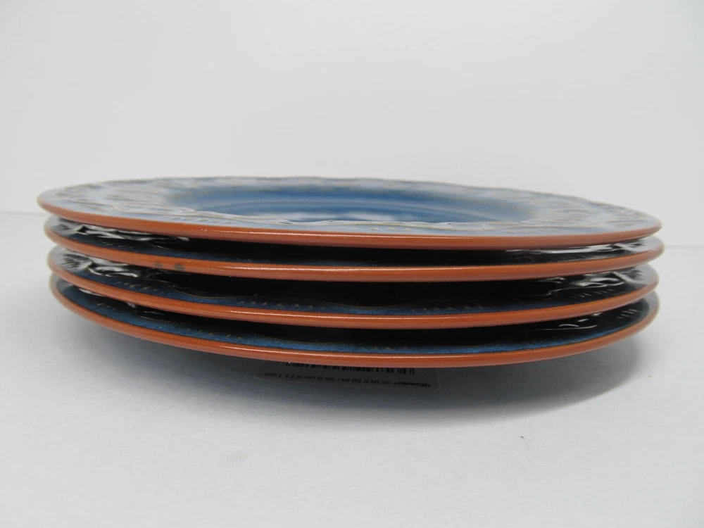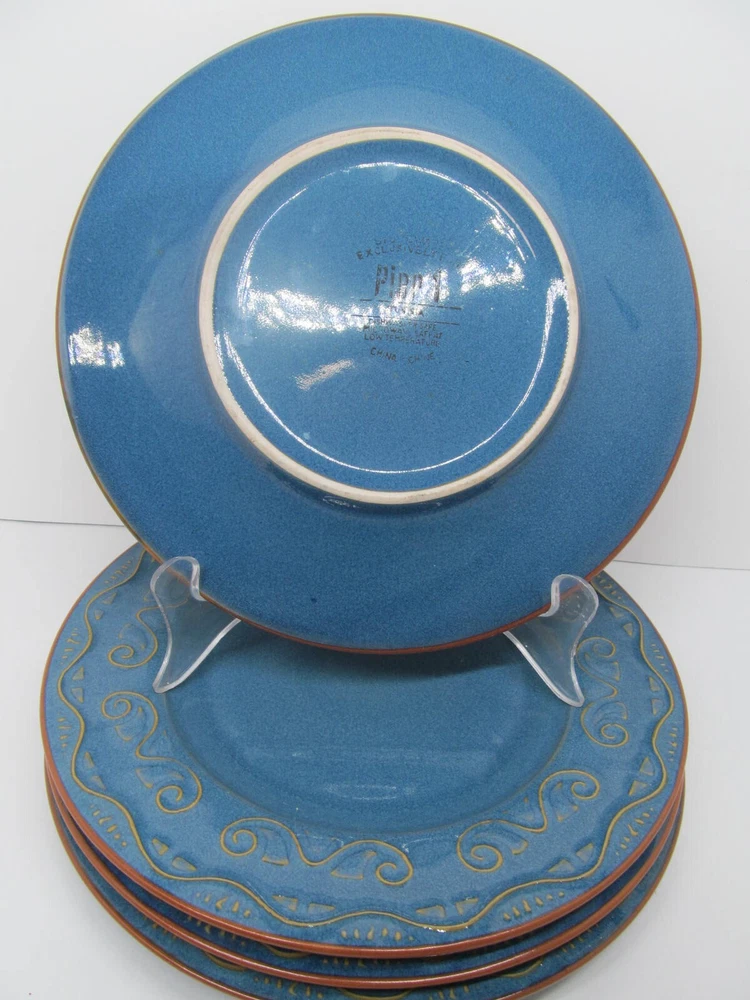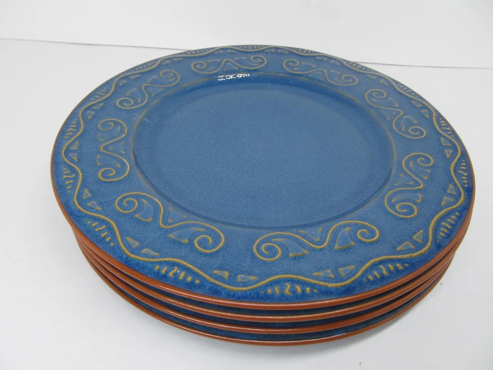Pier 1 Imports Tunisia Set Of 4 Tan Scrolls On Blue 8 3/8" Dinner Plates You Will be Getting 4 Salad Plates In Good Used Condition. No Issues. Does Have Light Scratches From Previous Use. They Will Be Wrapped Carefully And Fully Insured. PB621