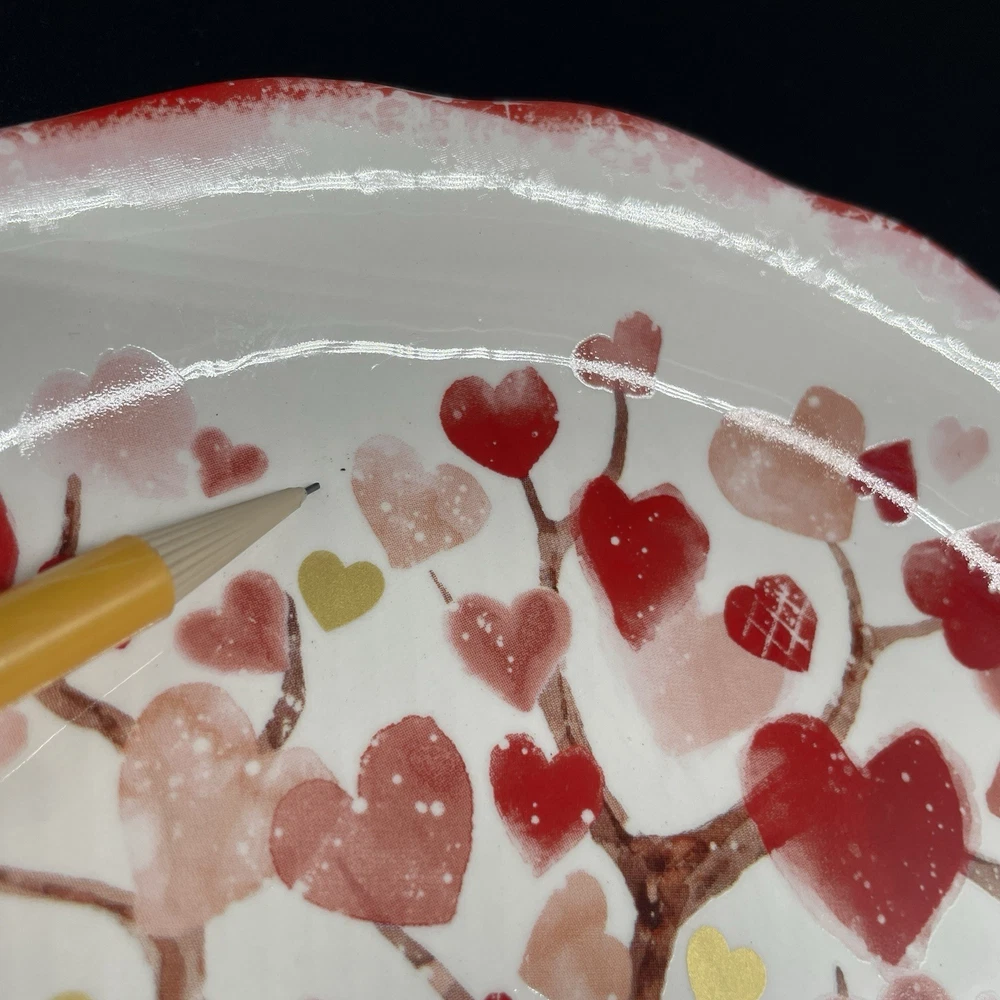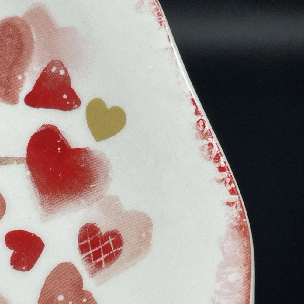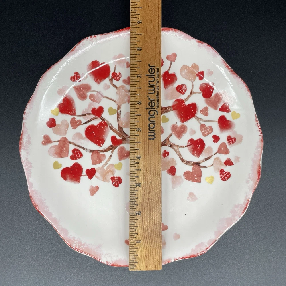 Pier 1 Imports Valentine’s Heart Tree Scalloped Ironstone 9 Inch Salad Plate Excellent condition. A few small specks in the glaze, shown in photos. Approx. 9” diameter Scalloped plate with multicolor hearts which appear to be on and falling from a tree. Smoke free, pet free home.