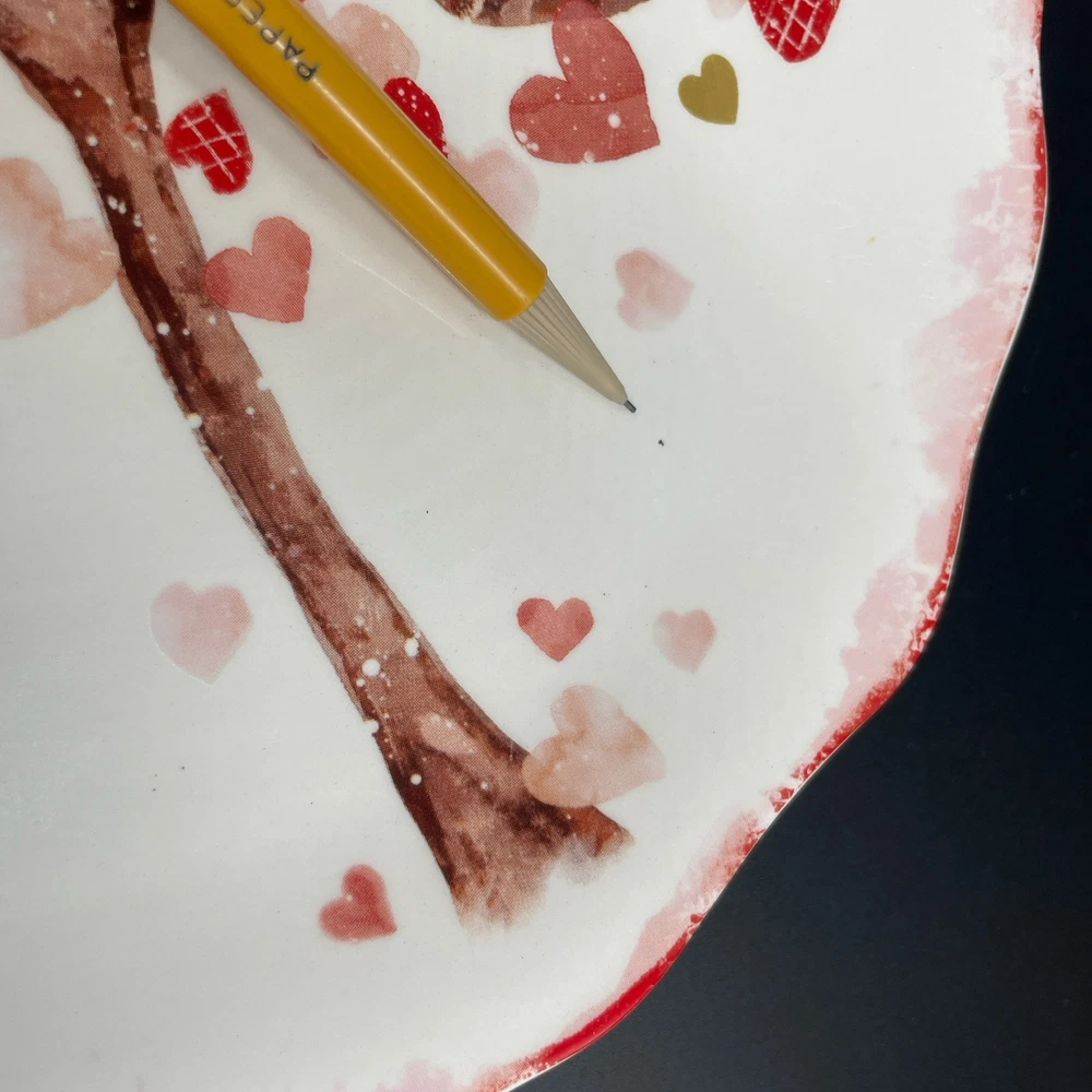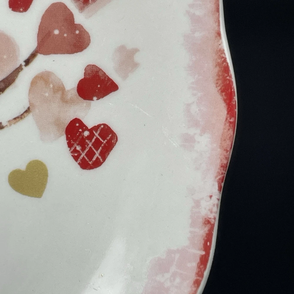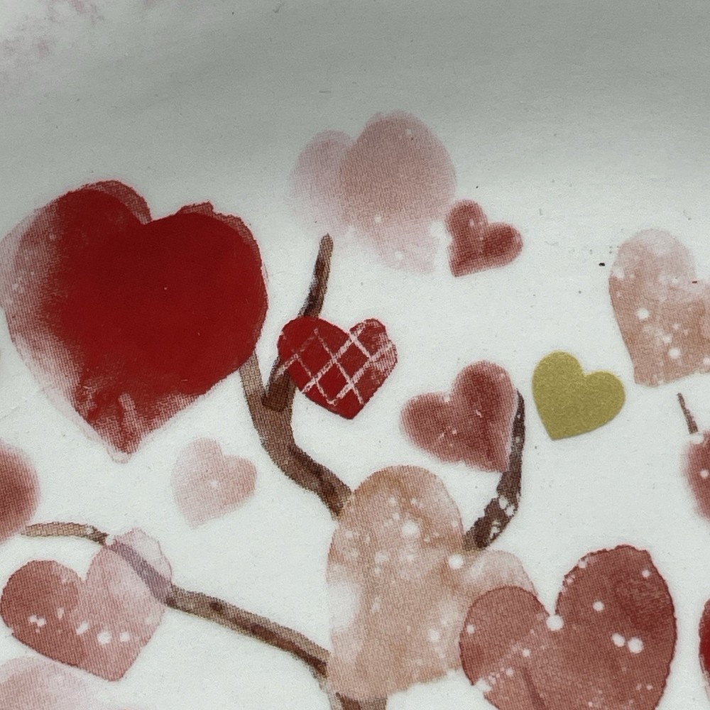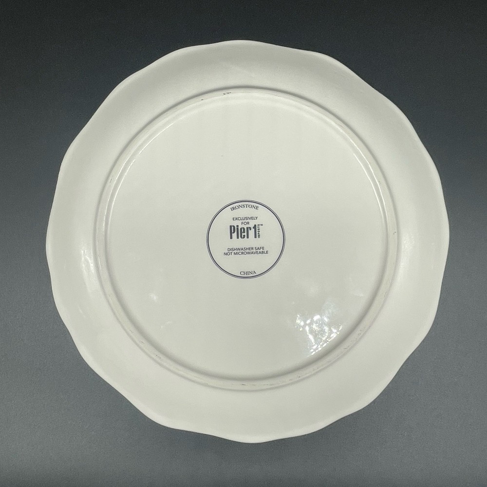 Pier 1 Imports Valentine’s Heart Tree Scalloped Ironstone 9 Inch Salad Plate Excellent condition. A few small specks in the glaze, shown in photos. Approx. 9” diameter Scalloped plate with multicolor hearts which appear to be on and falling from a tree. Smoke free, pet free home.
