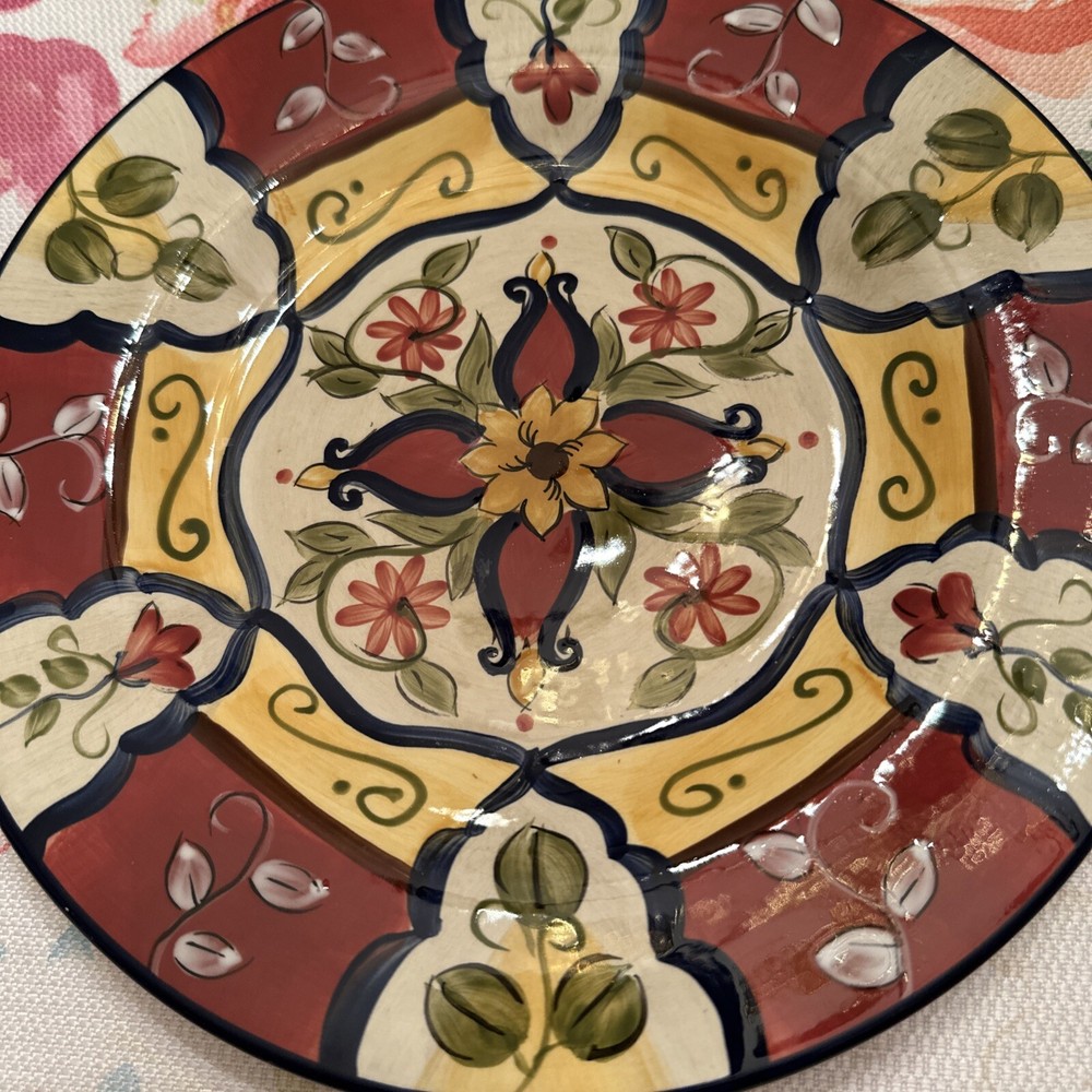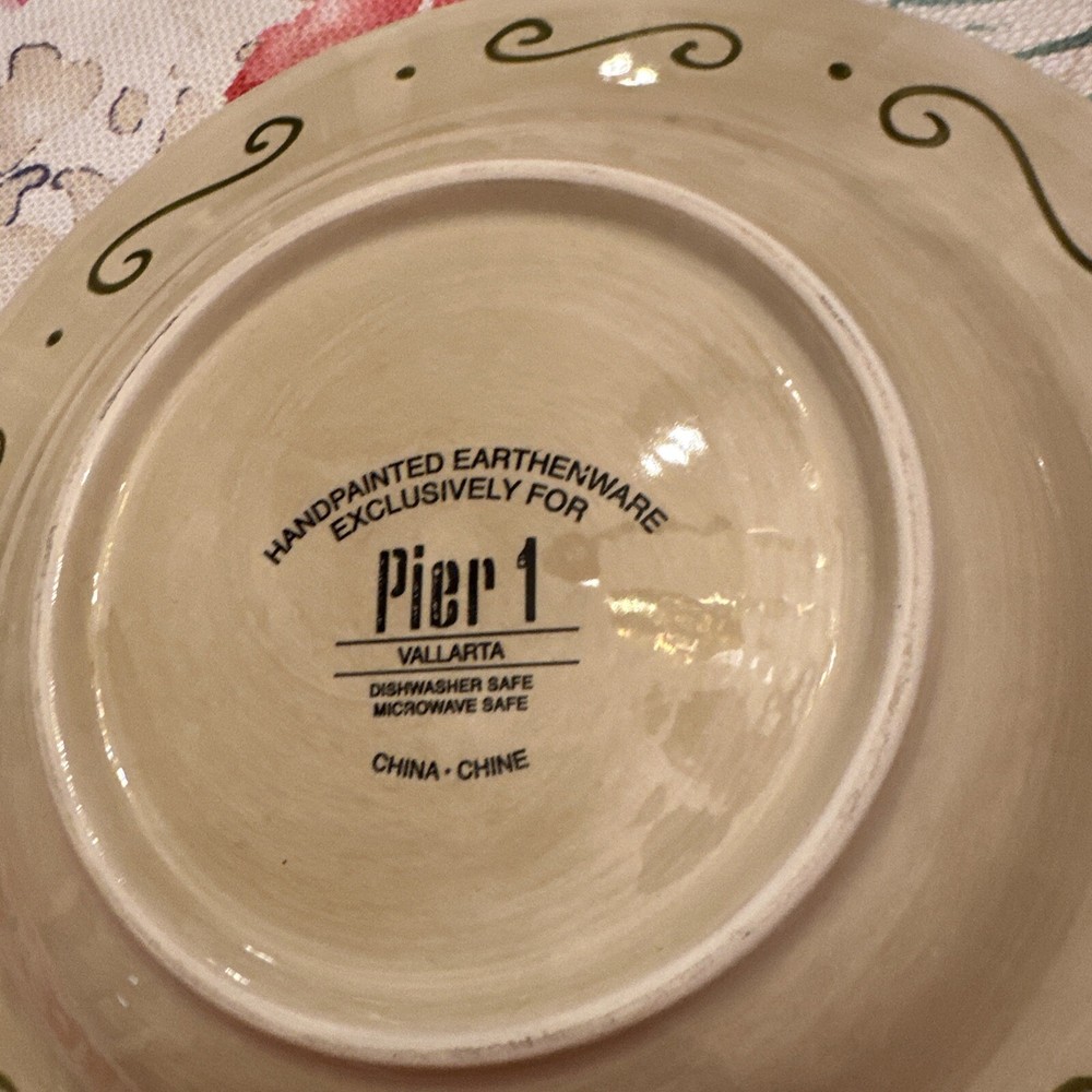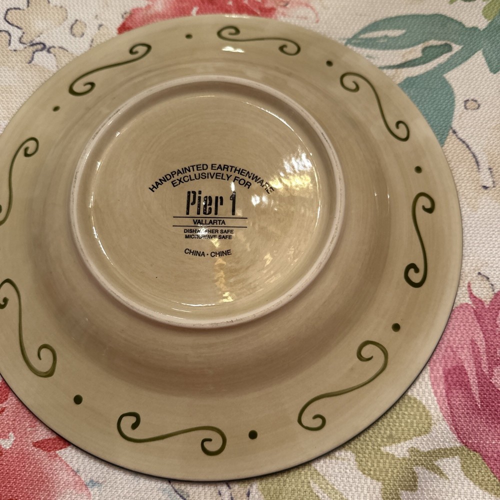 The Pier 1 Imports Vallarta Hand Painted Salad Plate is a contemporary and handmade ceramic plate featuring a colorful hand-painted flower pattern. With a glossy finish, this 9" round plate is dishwasher safe and suitable for all occasions. Manufactured in 2011 in China, this original piece from Pier 1 Imports is part of the Vallarta collection, adding a vibrant touch to your table setting with its artistic design and quality craftsmanship.