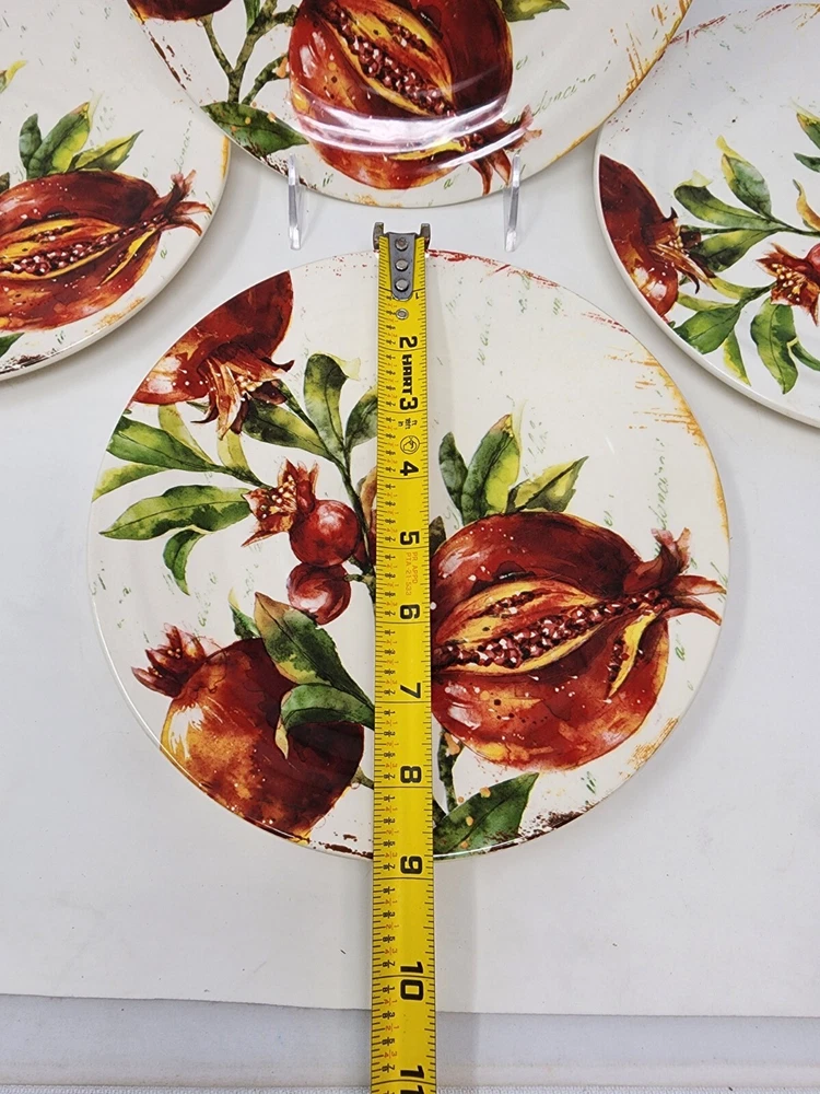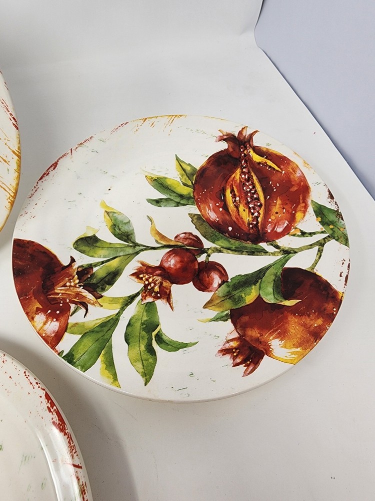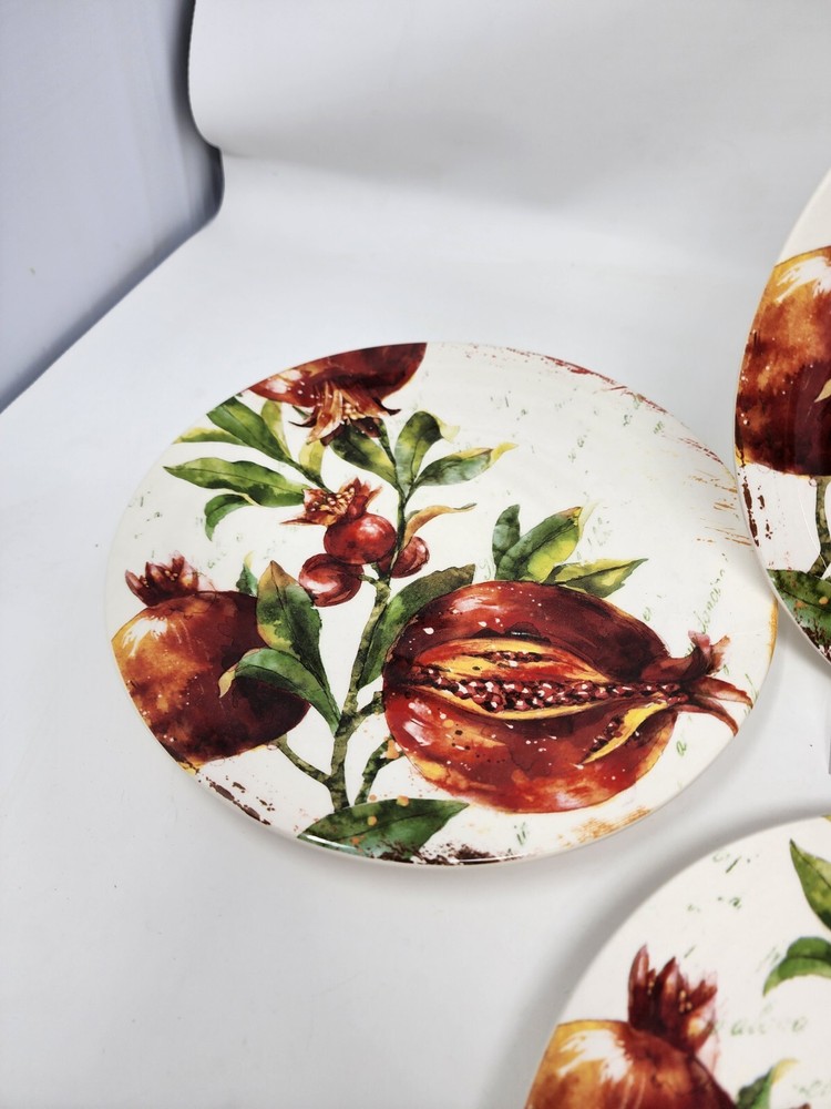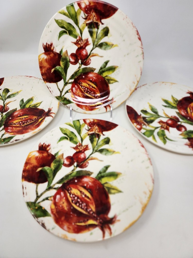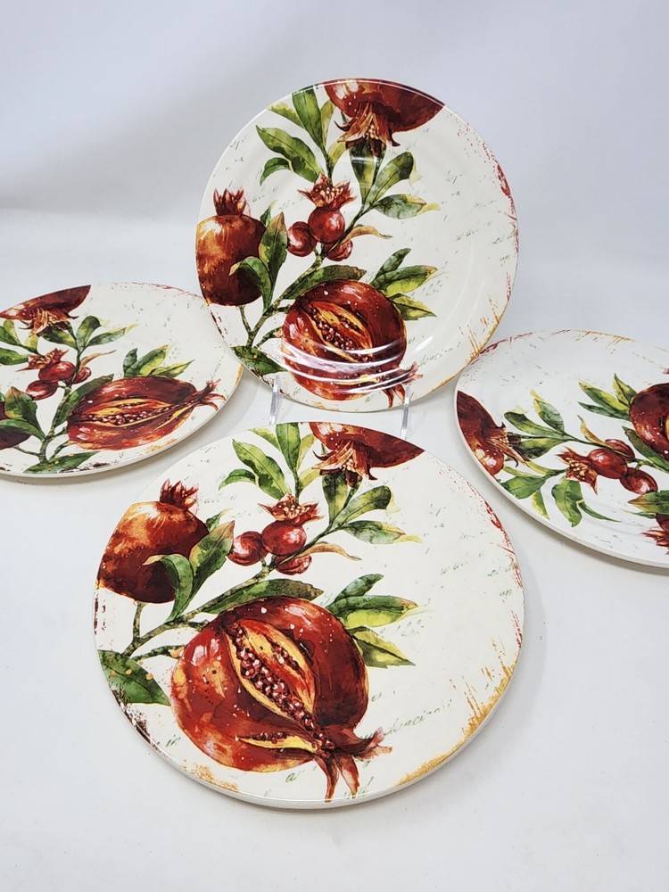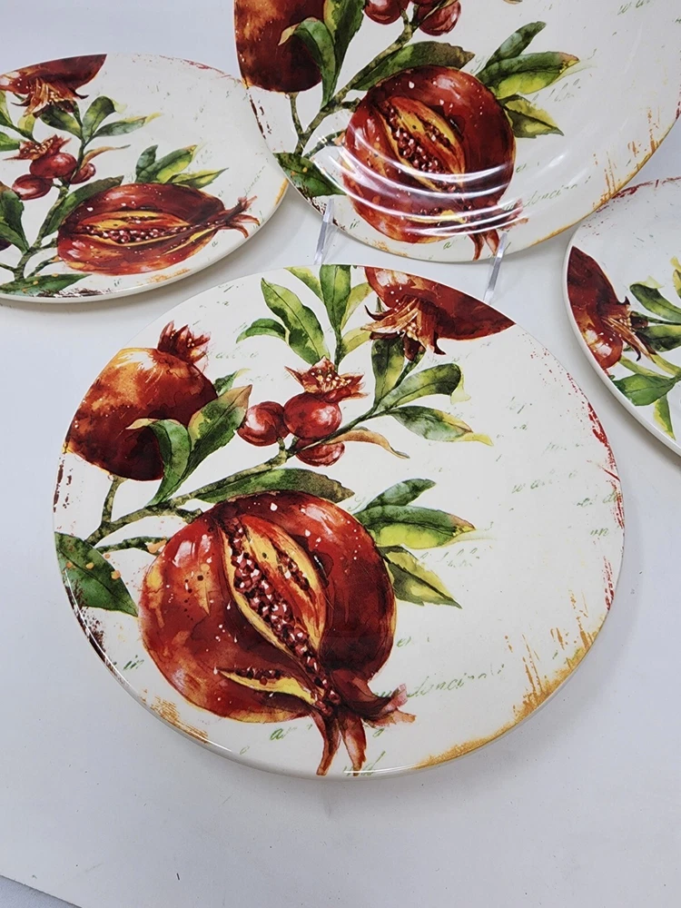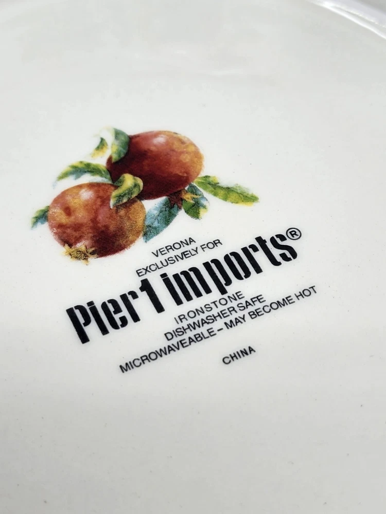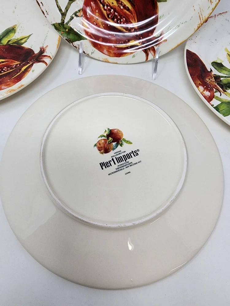 All of these are in perfect condition with no chips or cracks and are new with tags. Please check out my other listing for coordinating items to this set. Price is per plate! Add a touch of vintage charm to your table setting with this beautiful Pier 1 Imports Verona salad/luncheon plate. The round, 8.75-inch plate features a stunning botanical design with pomegranate and fruit themes, perfect for all occasions. Made of durable, break-resistant ironstone, this limited edition plate is both microwave and dishwasher safe, and comes with a printed backstamp. The glossy finish and stackable design make it a great addition to any collection, while the production technique of art pottery adds a unique touch. This plate is perfect for serving salads, fruits, or other dishes and is sure to impress your guests. Machine washable up to 140°F, this plate is a must-have for any vintage or fruit-themed table setting.